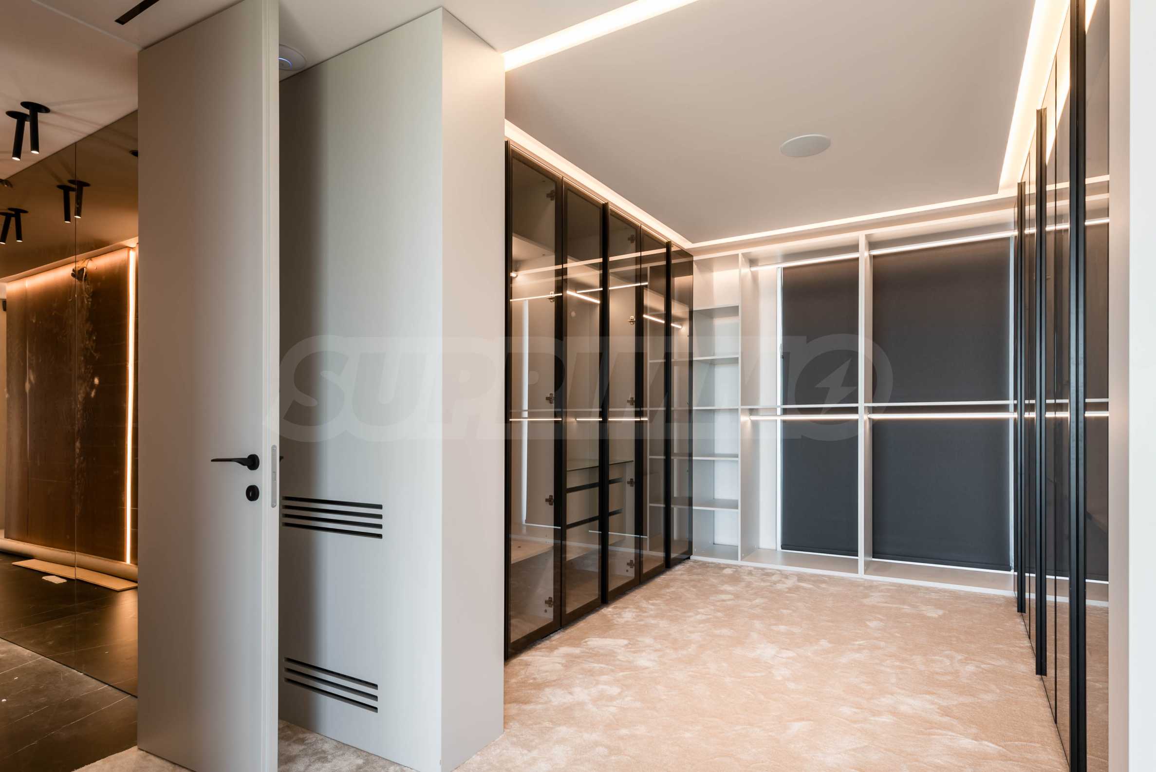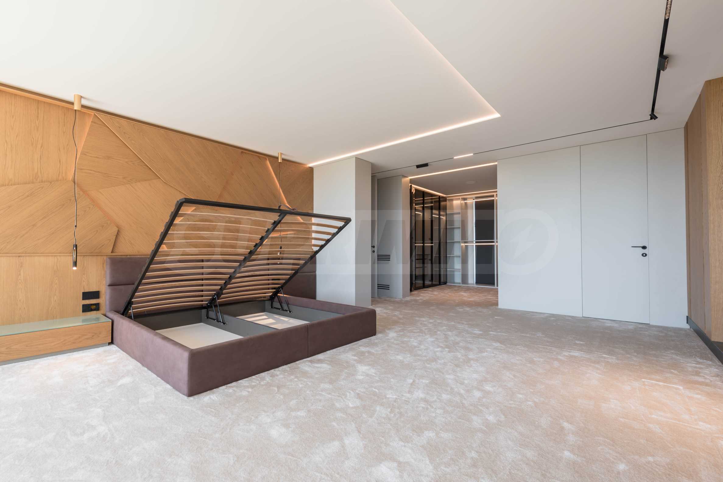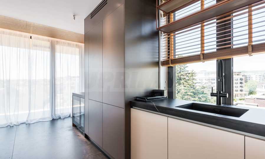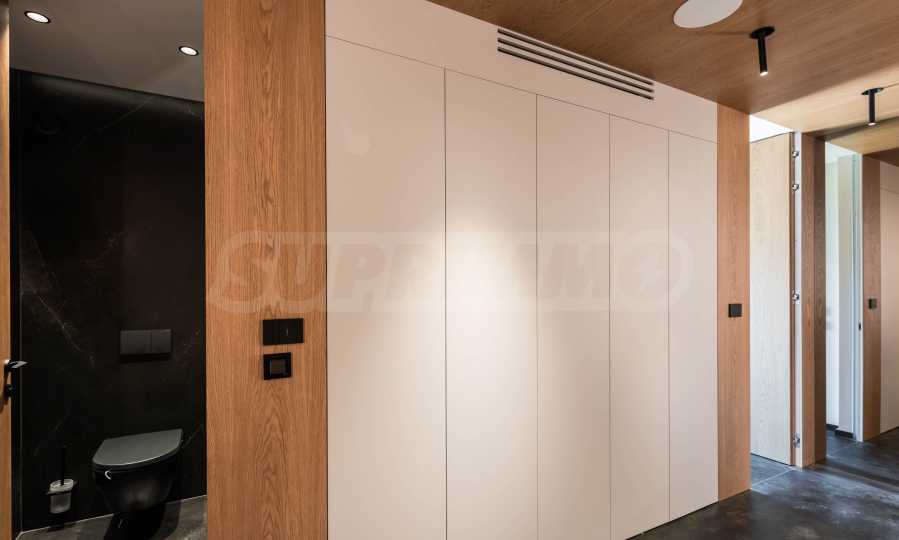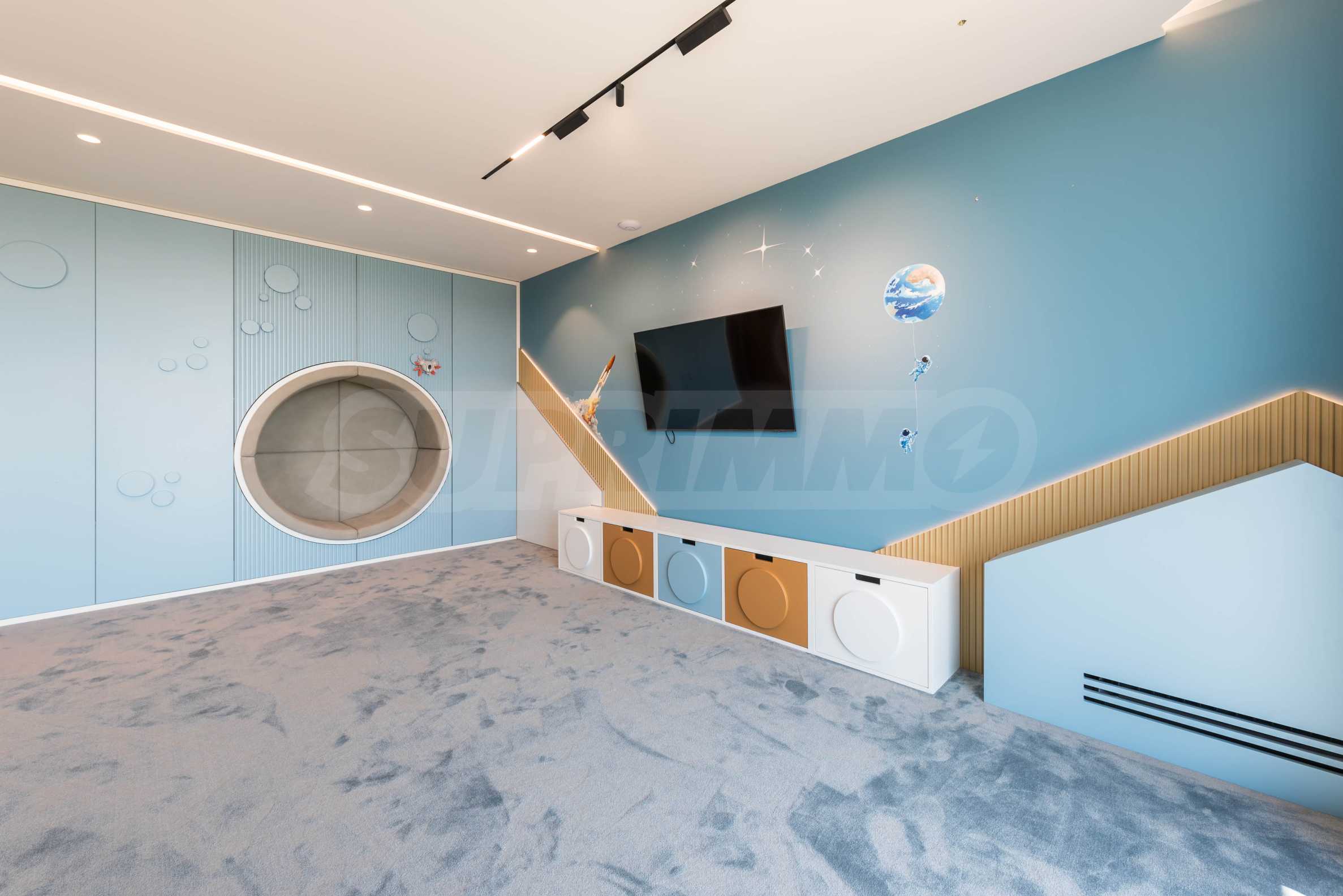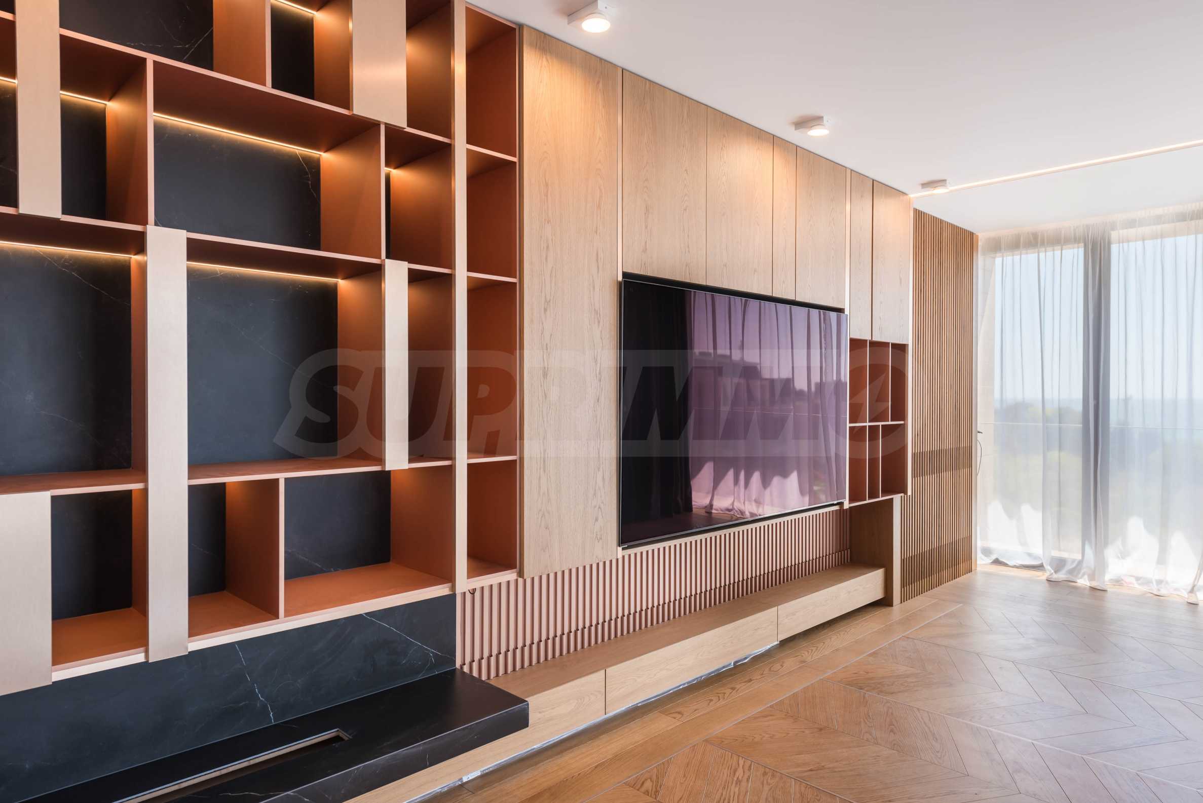 Die Wohnung ist qualitativ mit hochwertigen Materialien ausgestattet und mit modernen und funktionalen Möbeln ausgestattet. Die Einbauküche wurde nach individuellem Projekt mit hochwertigen Miele-Geräten gefertigt. Zur Ausstattung gehören Backofen, Kochfeld, Geschirrspül- und Kaffeemaschine, Einbaukühlschrank mit Gefrierfach, Weinvitrine und Spüle. Die Böden sind im Wohnzimmer mit Naturparkett und in der Küchenecke mit italienischen Granitfliesen ausgelegt, in den Schlafzimmern mit weichem Textilboden und auf den Terrassen mit Dielen aus Verbundmaterial. Die Wände sind mit Furnierpaneelen mit integrierter Beleuchtung, Spiegeln und Glas verkleidet und im Kinderzimmer mit farbenfrohen Zeichnungen gefüllt. Die Decken sind mit eingebauter Beleuchtung und Hintergrundbeschallung (Bowers & Wilkins) abgehängt. Die meisten Zimmer sind komplett möbliert, im Wohnzimmer können Sie die Polstermöbel jedoch nach Ihrem Geschmack auswählen.
