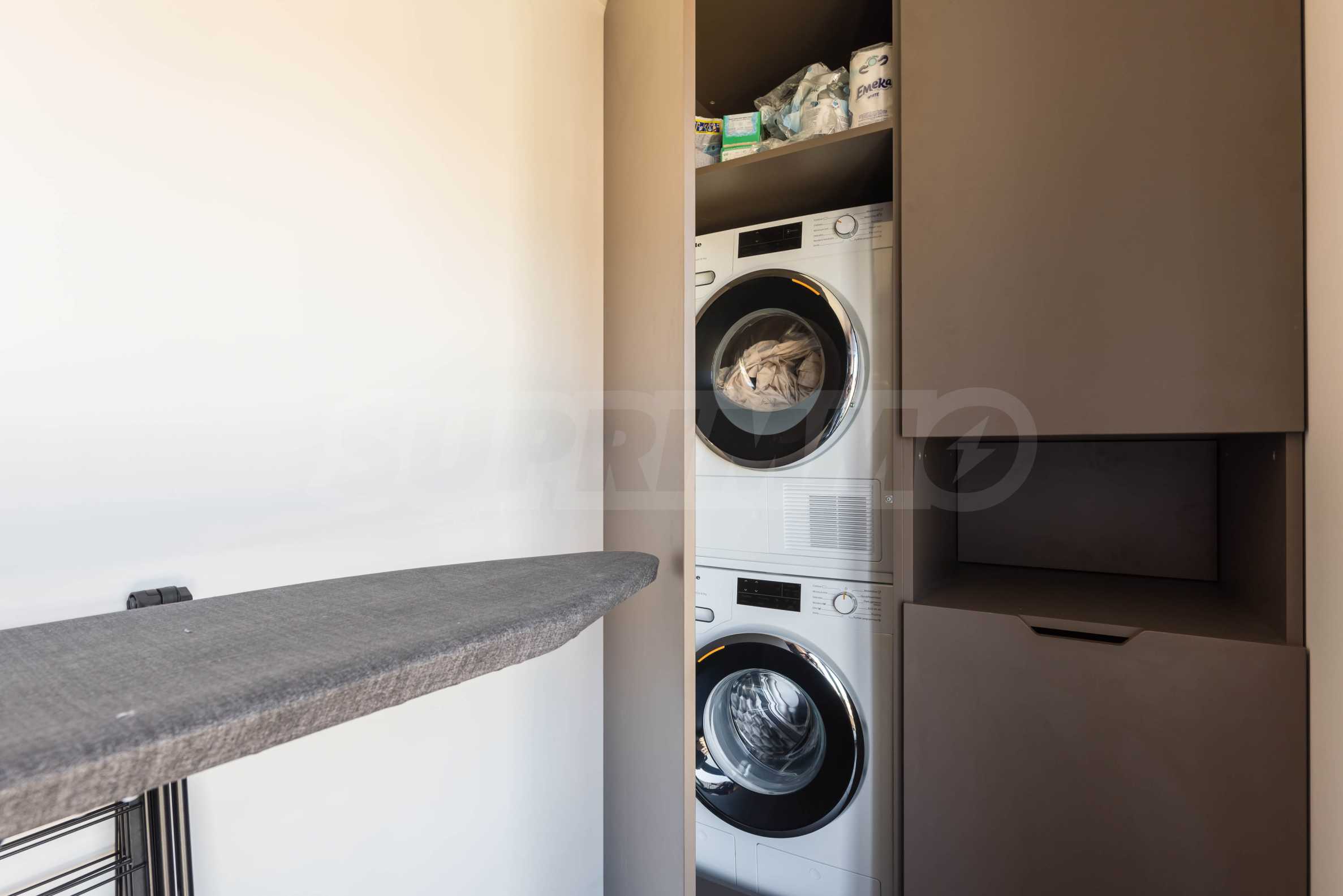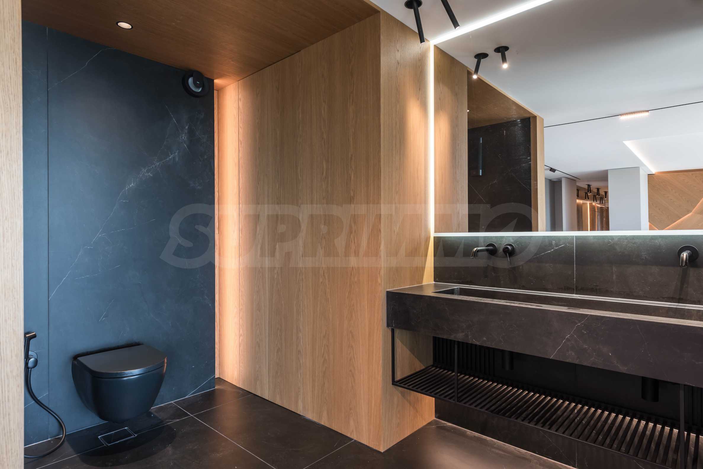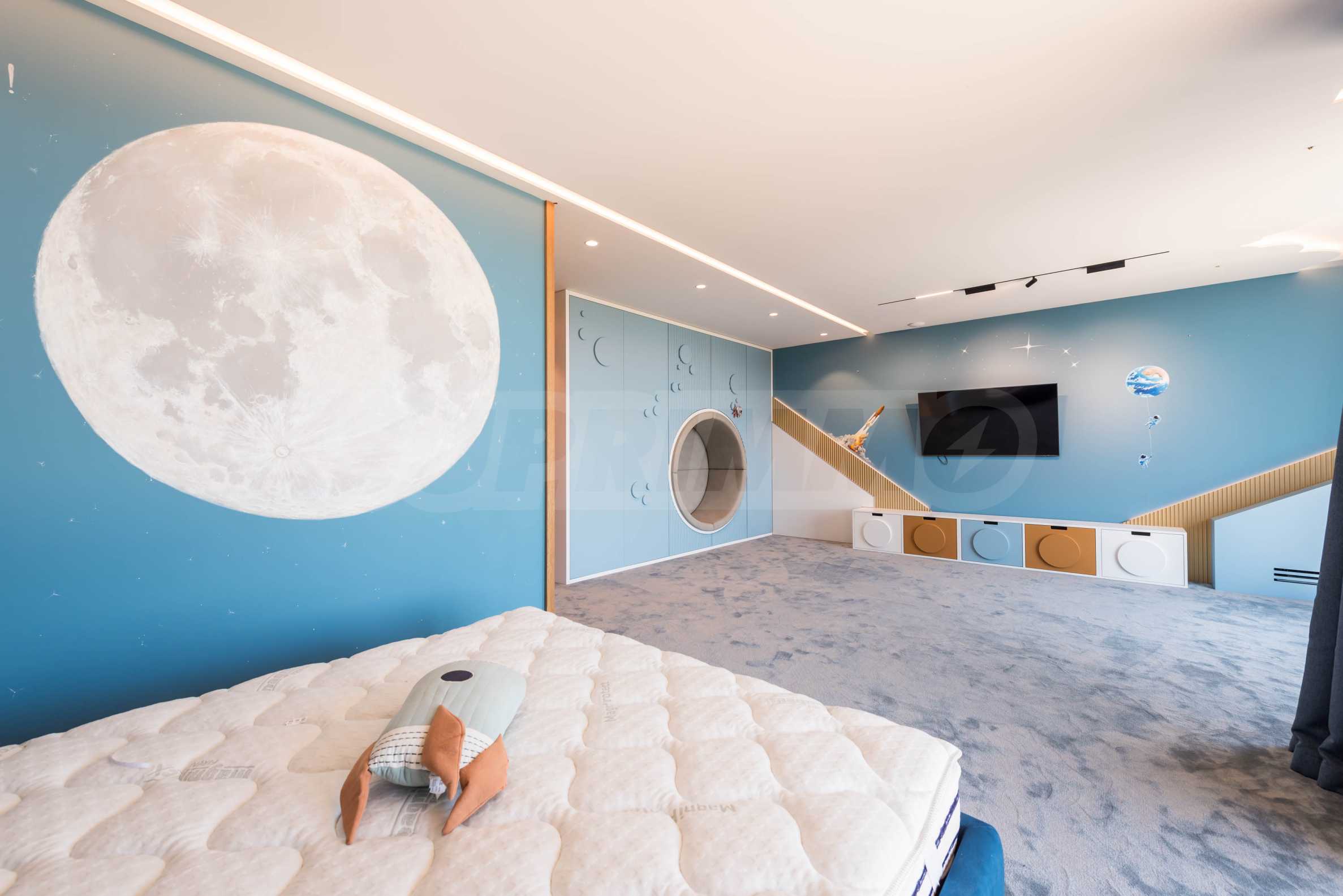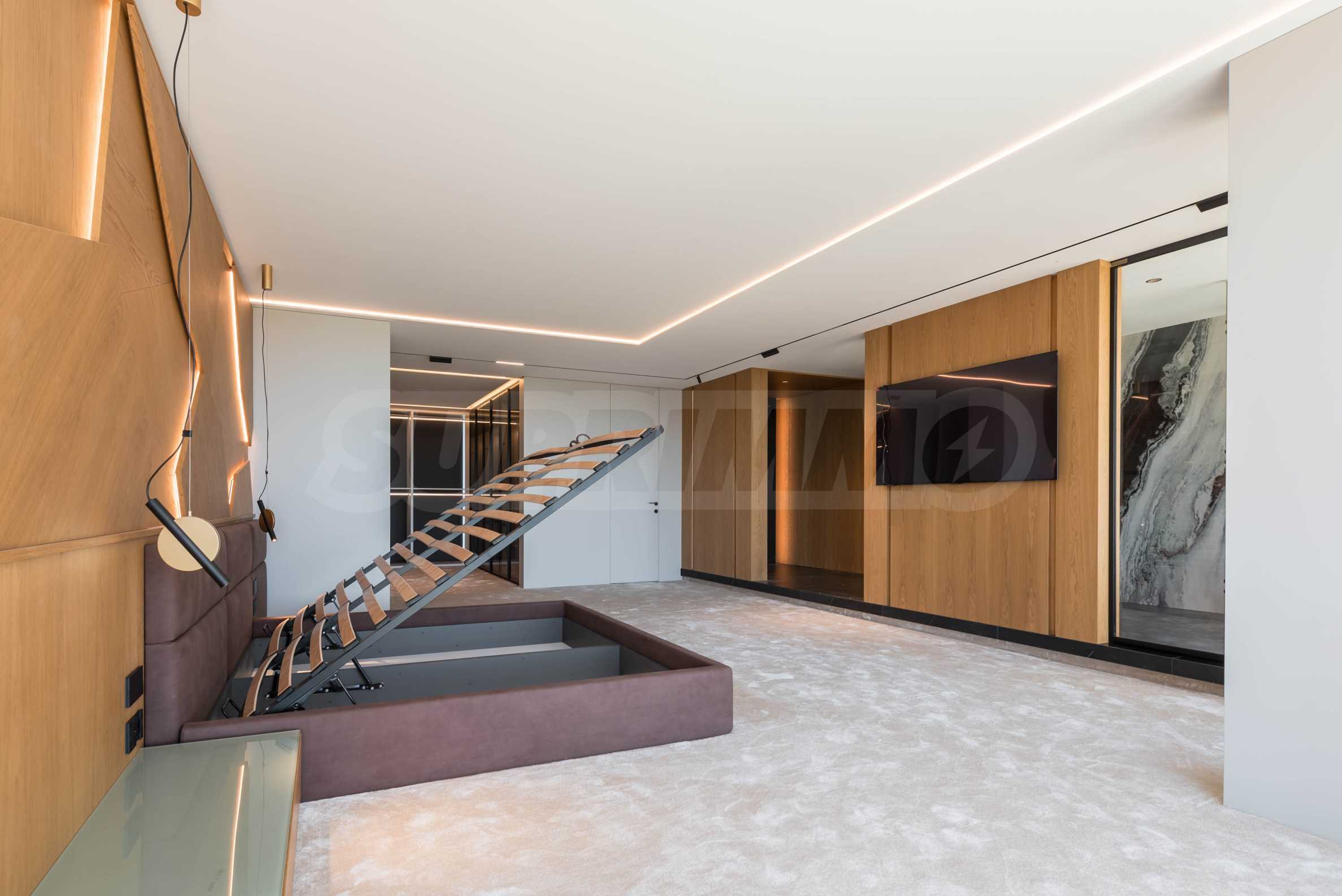Die Wohnung ist qualitativ mit hochwertigen Materialien ausgestattet und mit modernen und funktionalen Möbeln ausgestattet. Die Einbauküche wurde nach individuellem Projekt mit hochwertigen Miele-Geräten gefertigt. Zur Ausstattung gehören Backofen, Kochfeld, Geschirrspül- und Kaffeemaschine, Einbaukühlschrank mit Gefrierfach, Weinvitrine und Spüle. Die Böden sind im Wohnzimmer mit Naturparkett und in der Küchenecke mit italienischen Granitfliesen ausgelegt, in den Schlafzimmern mit weichem Textilboden und auf den Terrassen mit Dielen aus Verbundmaterial. Die Wände sind mit Furnierpaneelen mit integrierter Beleuchtung, Spiegeln und Glas verkleidet und im Kinderzimmer mit farbenfrohen Zeichnungen gefüllt. Die Decken sind mit eingebauter Beleuchtung und Hintergrundbeschallung (Bowers & Wilkins) abgehängt. Die meisten Zimmer sind komplett möbliert, im Wohnzimmer können Sie die Polstermöbel jedoch nach Ihrem Geschmack auswählen.