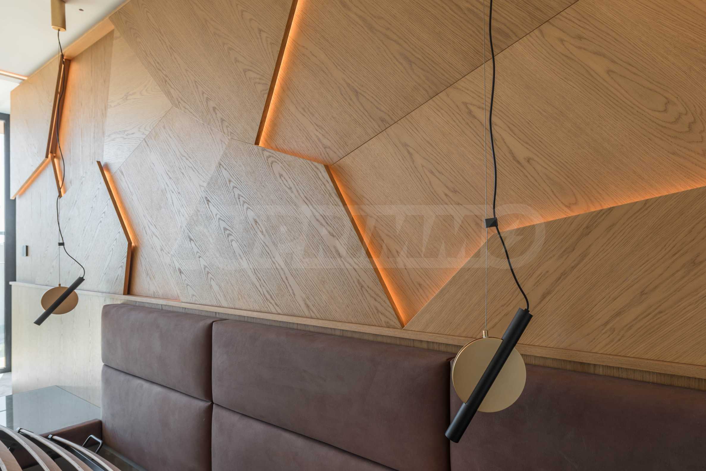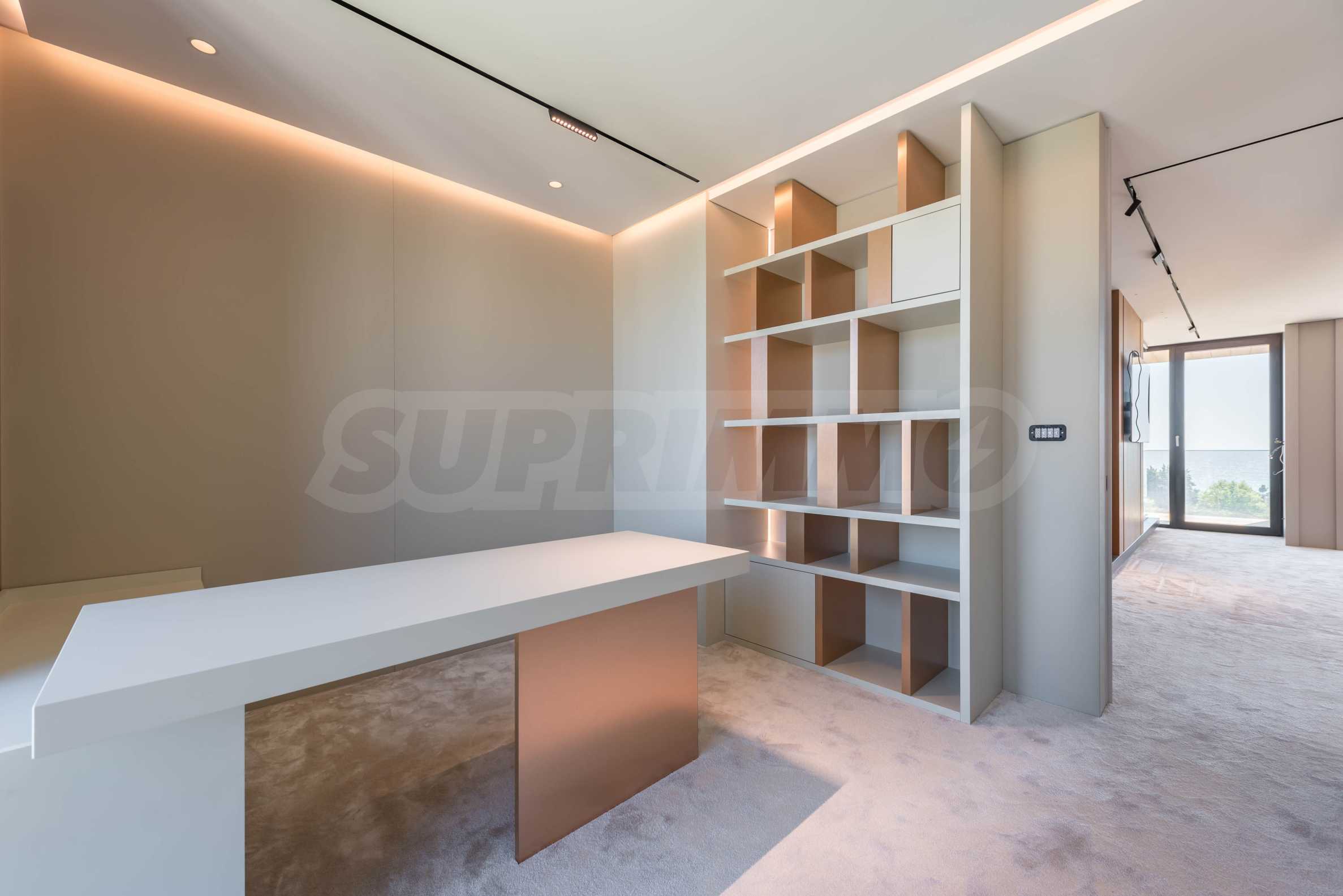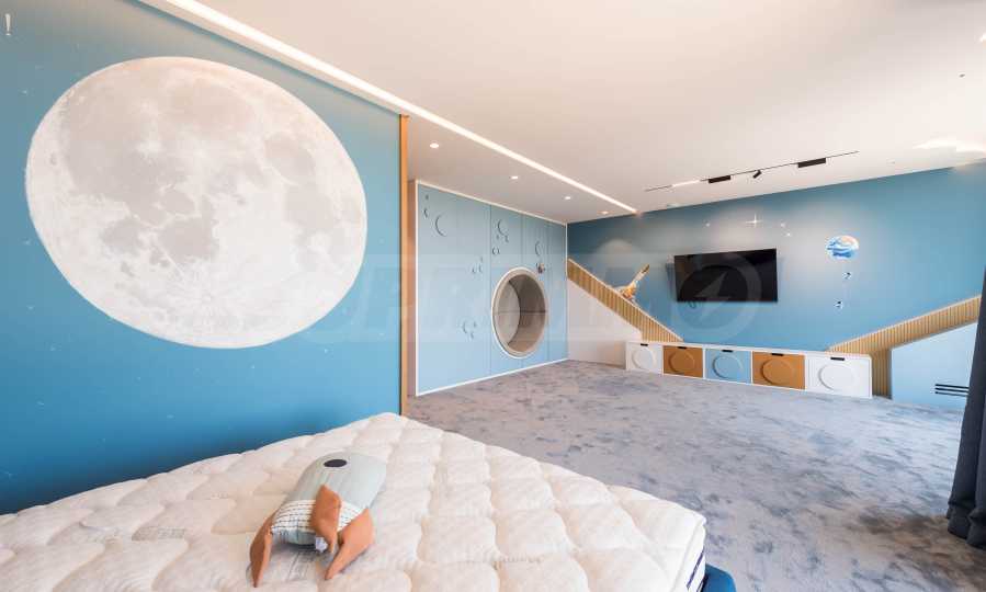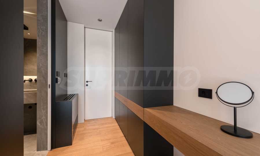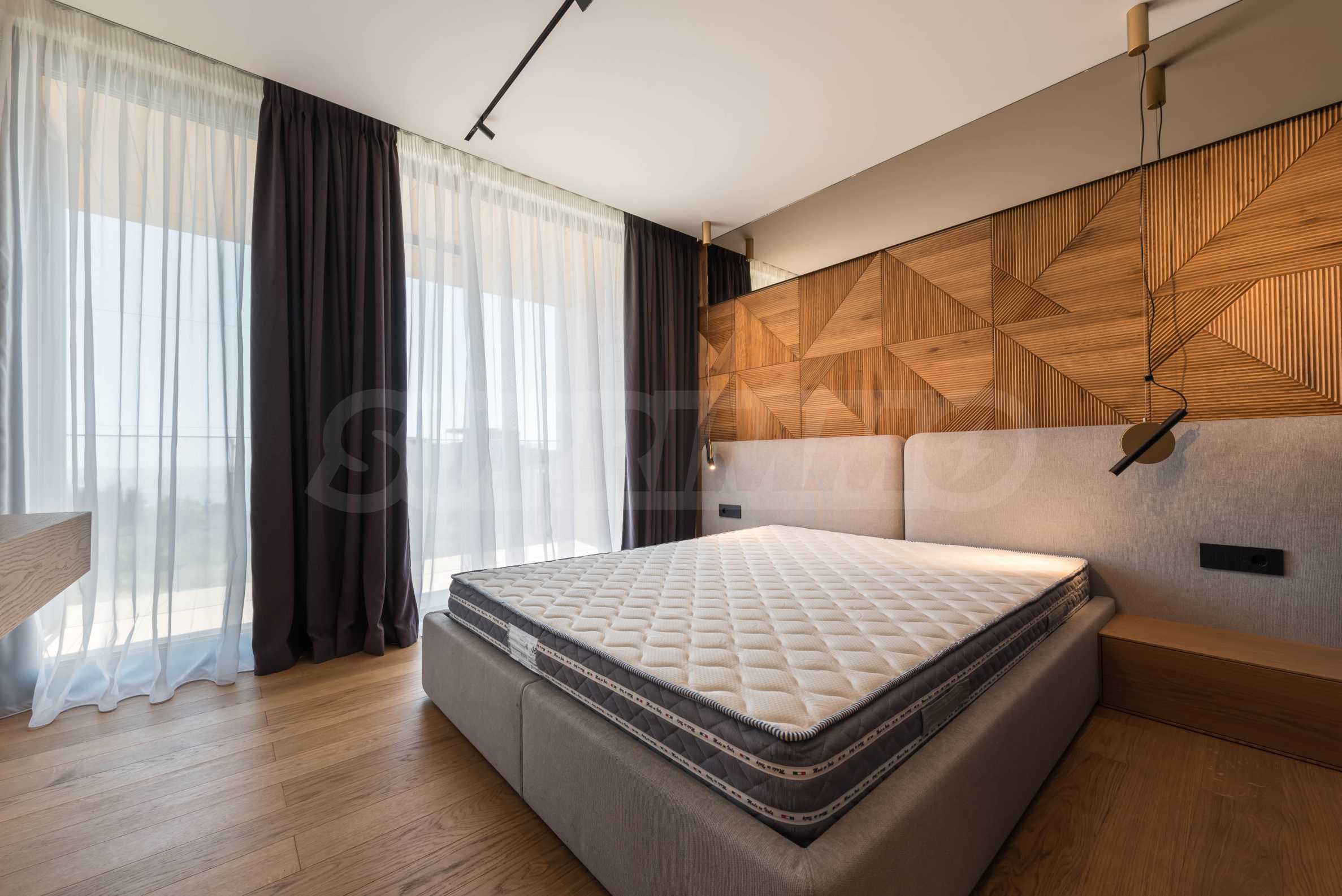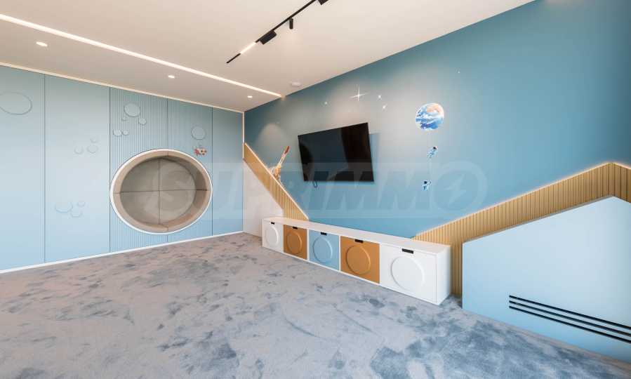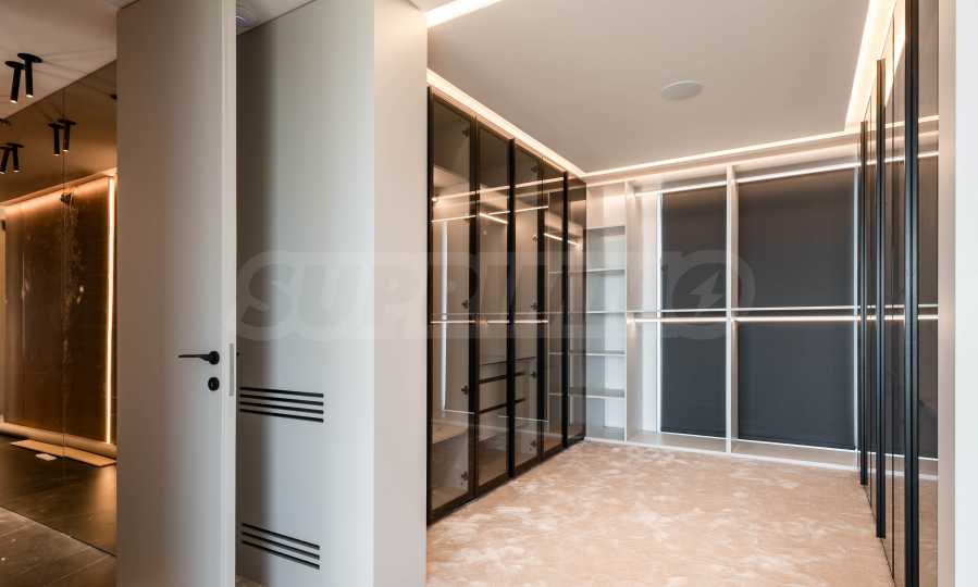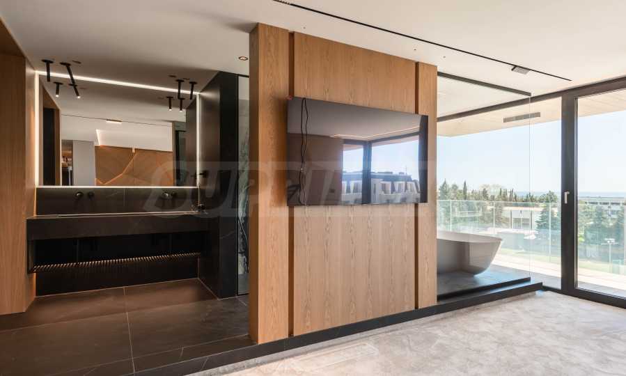 Die Wohnung ist qualitativ mit hochwertigen Materialien ausgestattet und mit modernen und funktionalen Möbeln ausgestattet. Die Einbauküche wurde nach individuellem Projekt mit hochwertigen Miele-Geräten gefertigt. Zur Ausstattung gehören Backofen, Kochfeld, Geschirrspül- und Kaffeemaschine, Einbaukühlschrank mit Gefrierfach, Weinvitrine und Spüle. Die Böden sind im Wohnzimmer mit Naturparkett und in der Küchenecke mit italienischen Granitfliesen ausgelegt, in den Schlafzimmern mit weichem Textilboden und auf den Terrassen mit Dielen aus Verbundmaterial. Die Wände sind mit Furnierpaneelen mit integrierter Beleuchtung, Spiegeln und Glas verkleidet und im Kinderzimmer mit farbenfrohen Zeichnungen gefüllt. Die Decken sind mit eingebauter Beleuchtung und Hintergrundbeschallung (Bowers & Wilkins) abgehängt. Die meisten Zimmer sind komplett möbliert, im Wohnzimmer können Sie die Polstermöbel jedoch nach Ihrem Geschmack auswählen.