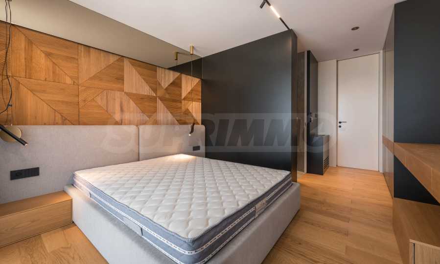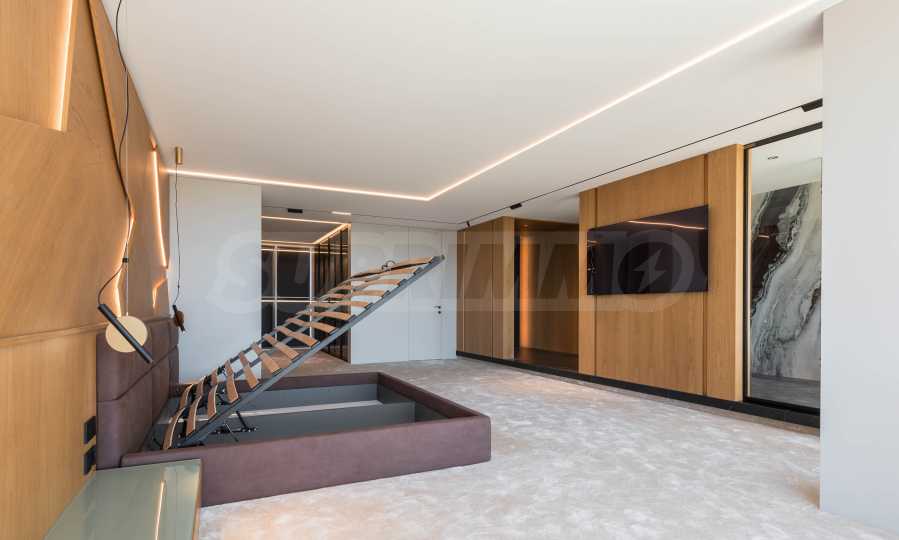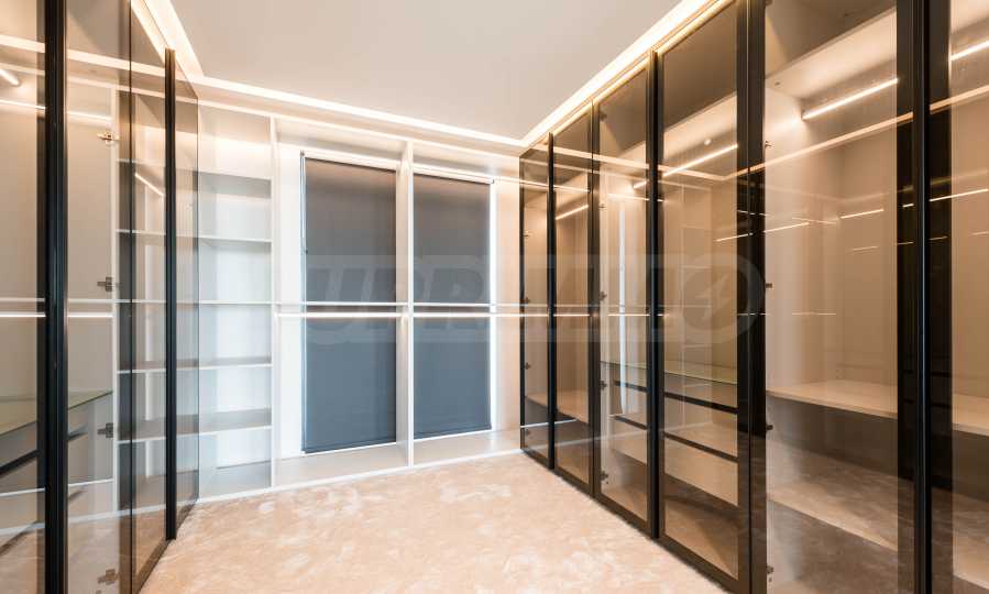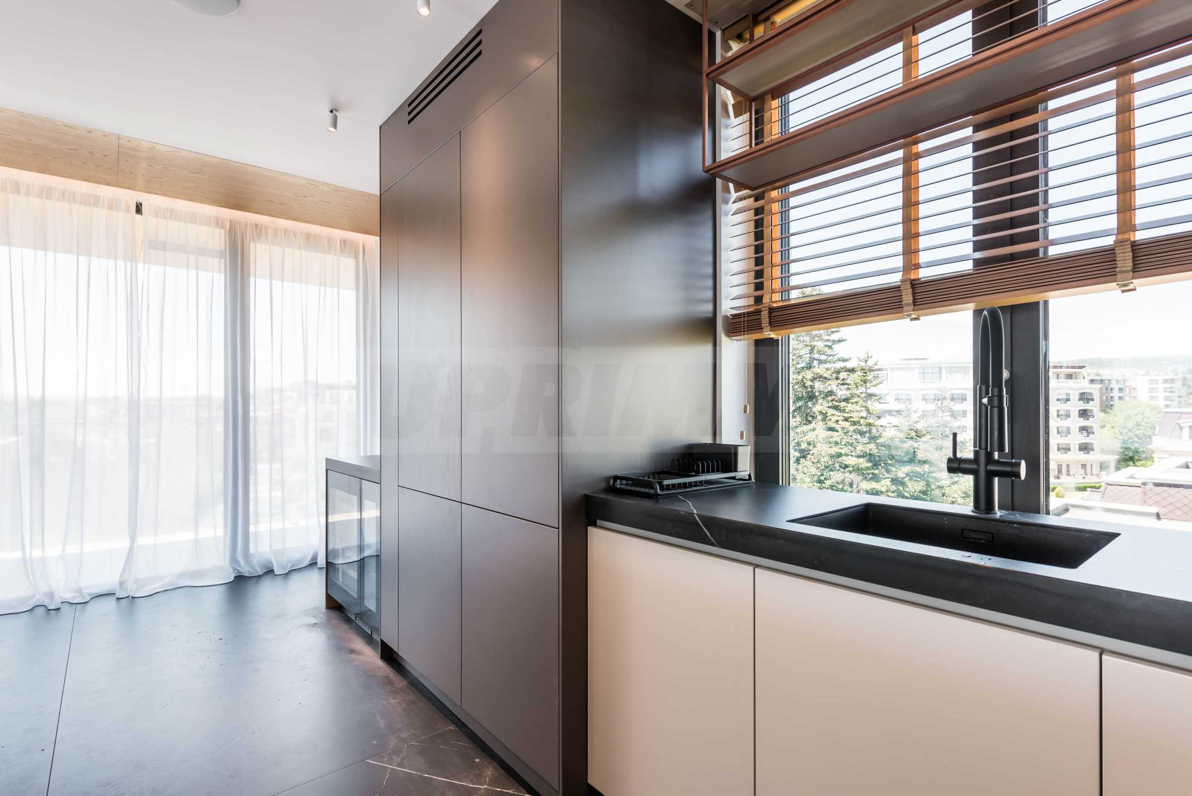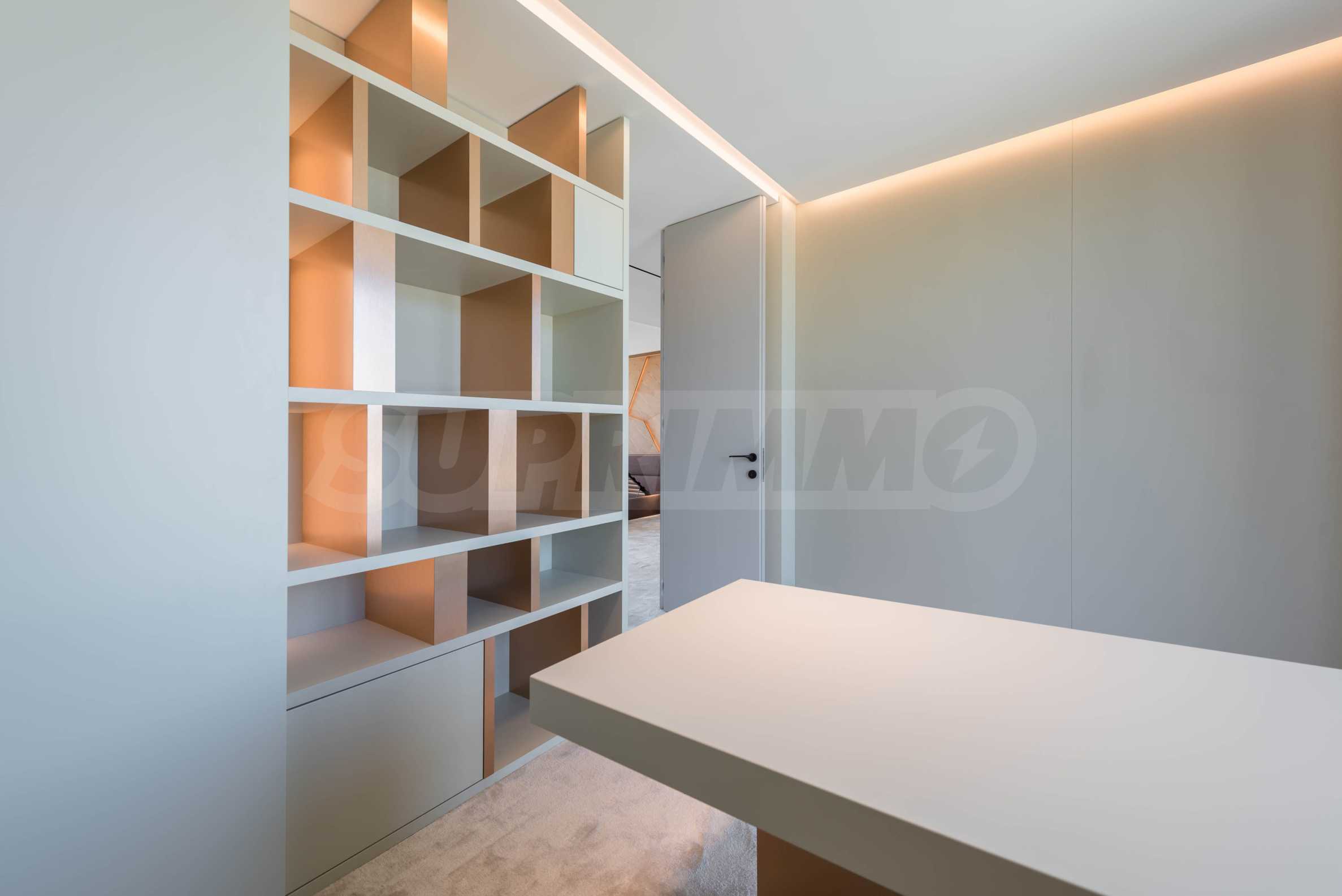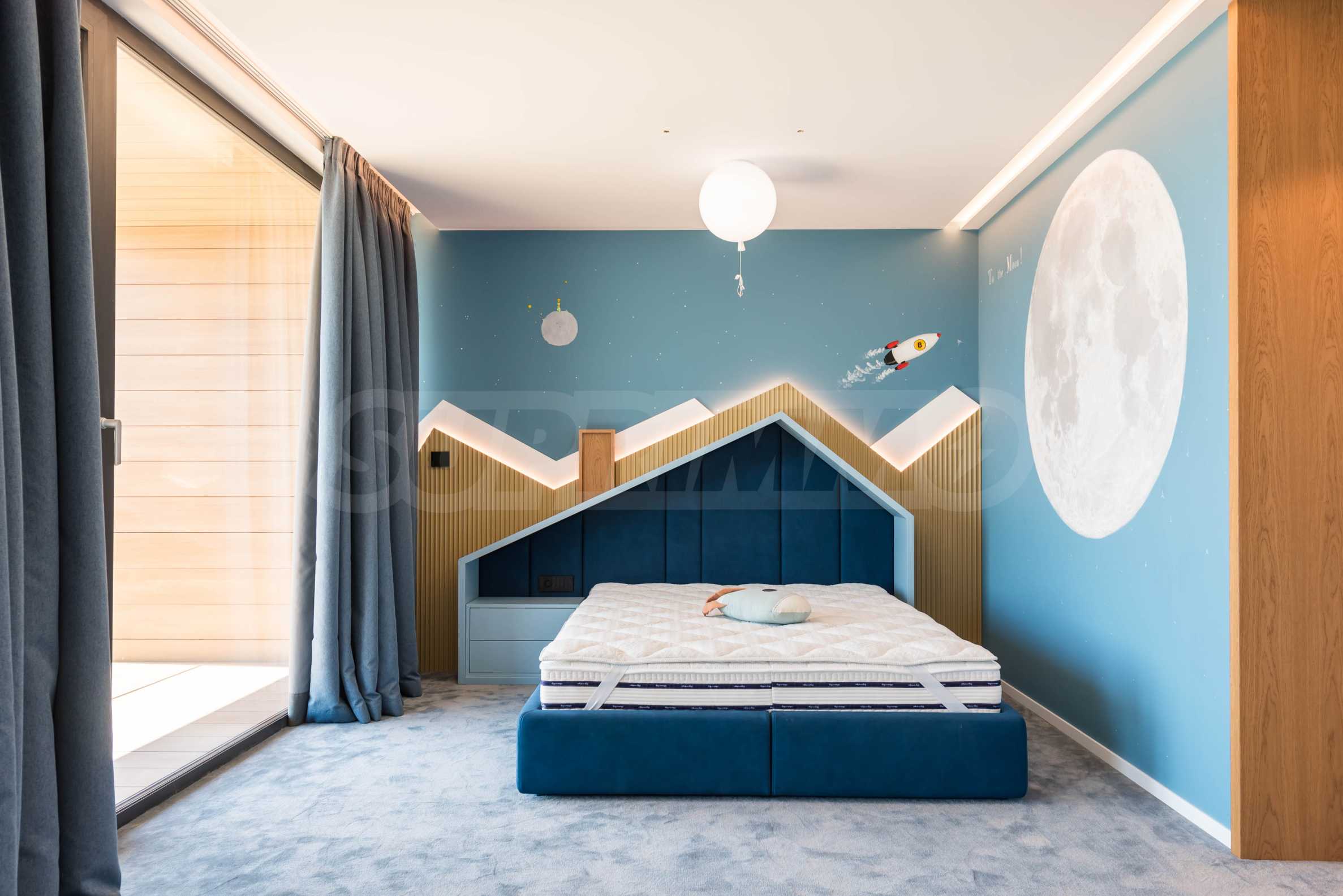 Die Wohnung ist qualitativ mit hochwertigen Materialien ausgestattet und mit modernen und funktionalen Möbeln ausgestattet. Die Einbauküche wurde nach individuellem Projekt mit hochwertigen Miele-Geräten gefertigt. Zur Ausstattung gehören Backofen, Kochfeld, Geschirrspül- und Kaffeemaschine, Einbaukühlschrank mit Gefrierfach, Weinvitrine und Spüle. Die Böden sind im Wohnzimmer mit Naturparkett und in der Küchenecke mit italienischen Granitfliesen ausgelegt, in den Schlafzimmern mit weichem Textilboden und auf den Terrassen mit Dielen aus Verbundmaterial. Die Wände sind mit Furnierpaneelen mit integrierter Beleuchtung, Spiegeln und Glas verkleidet und im Kinderzimmer mit farbenfrohen Zeichnungen gefüllt. Die Decken sind mit eingebauter Beleuchtung und Hintergrundbeschallung (Bowers & Wilkins) abgehängt. Die meisten Zimmer sind komplett möbliert, im Wohnzimmer können Sie die Polstermöbel jedoch nach Ihrem Geschmack auswählen.