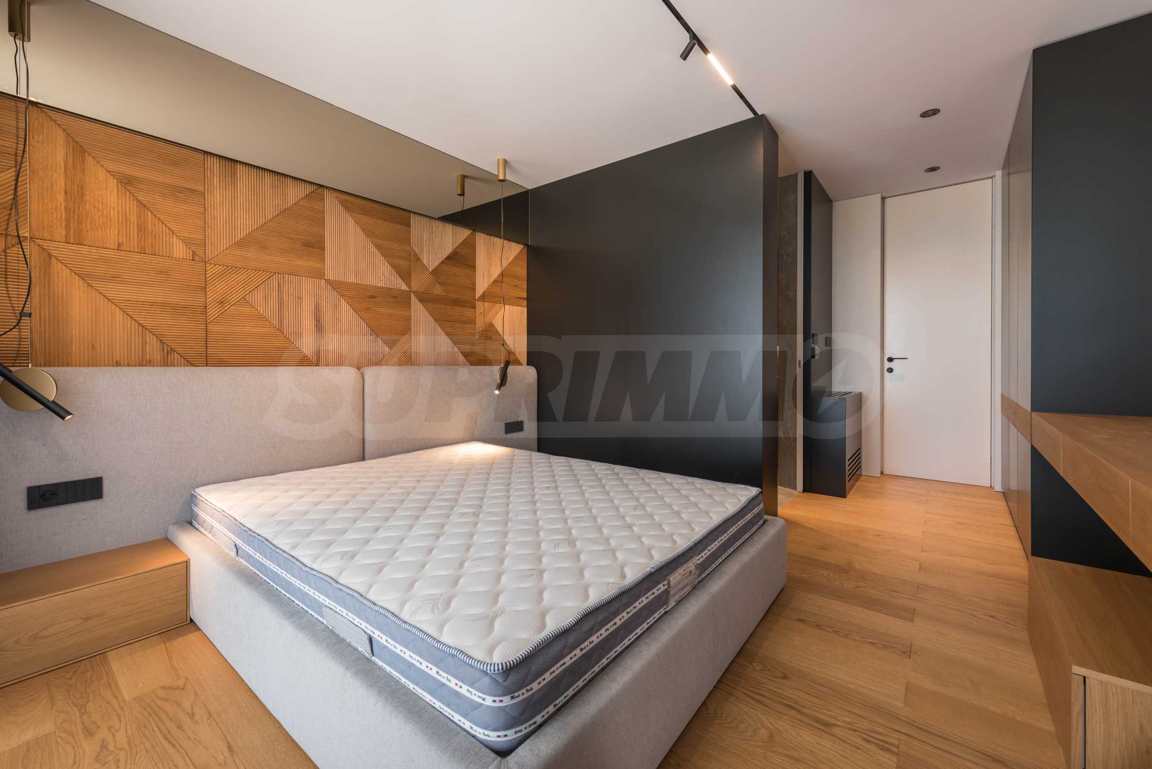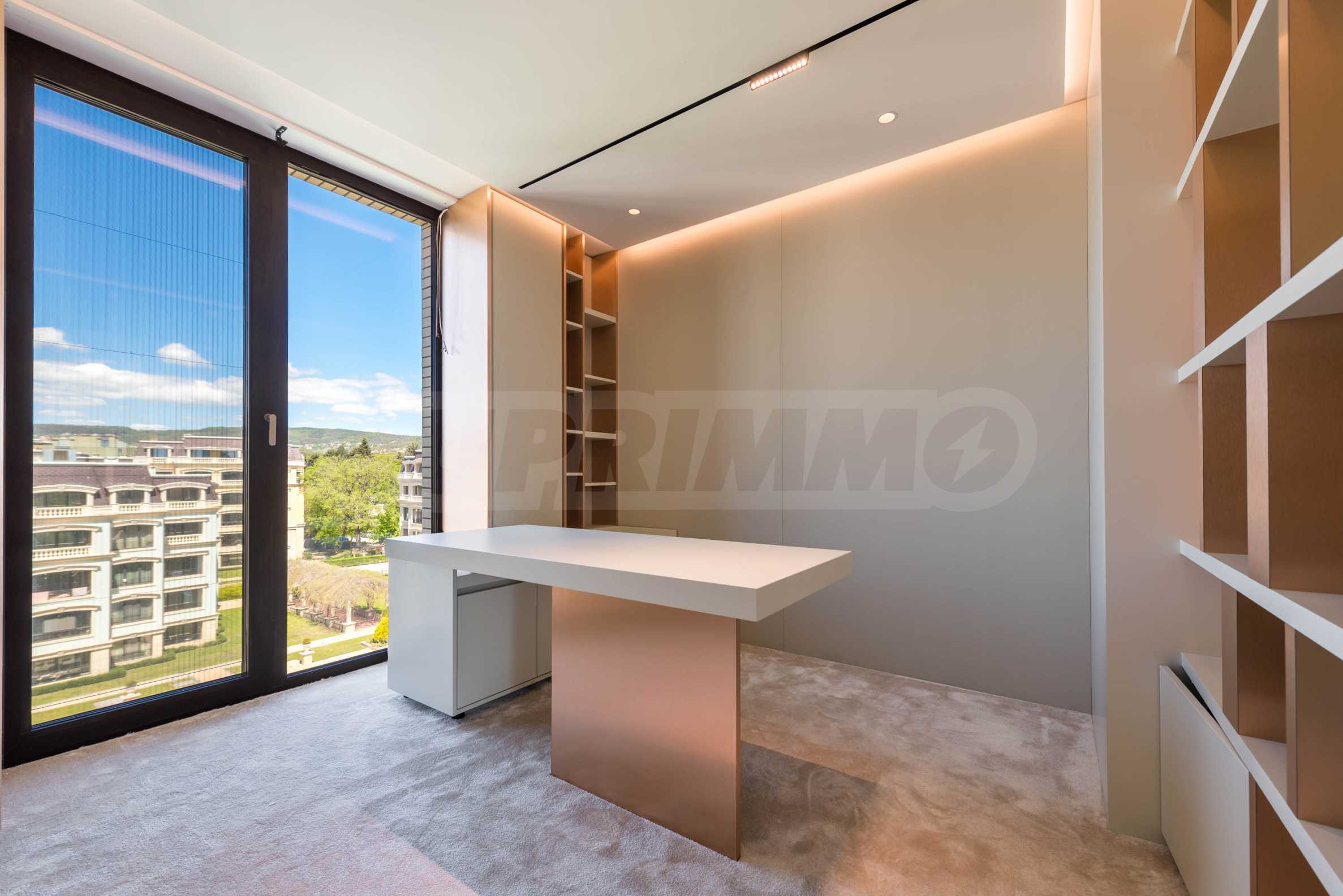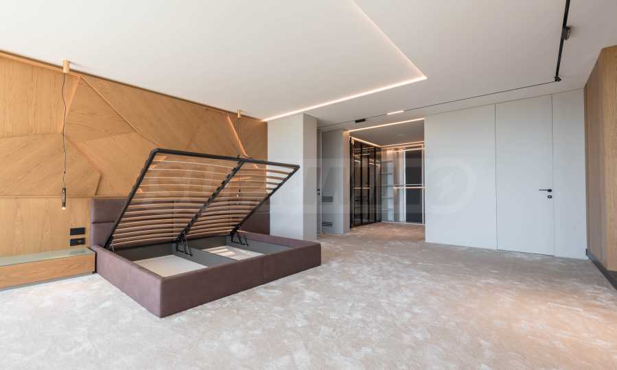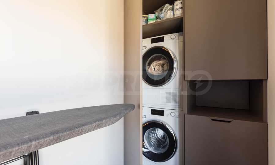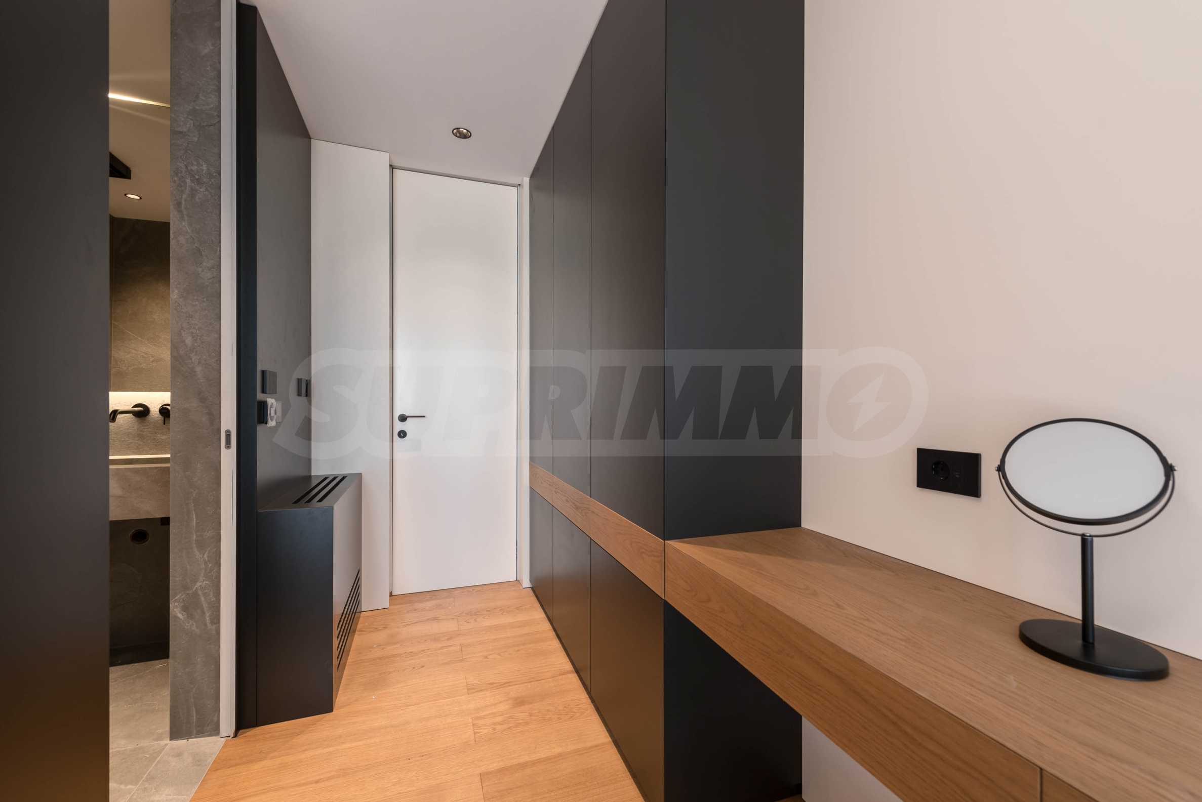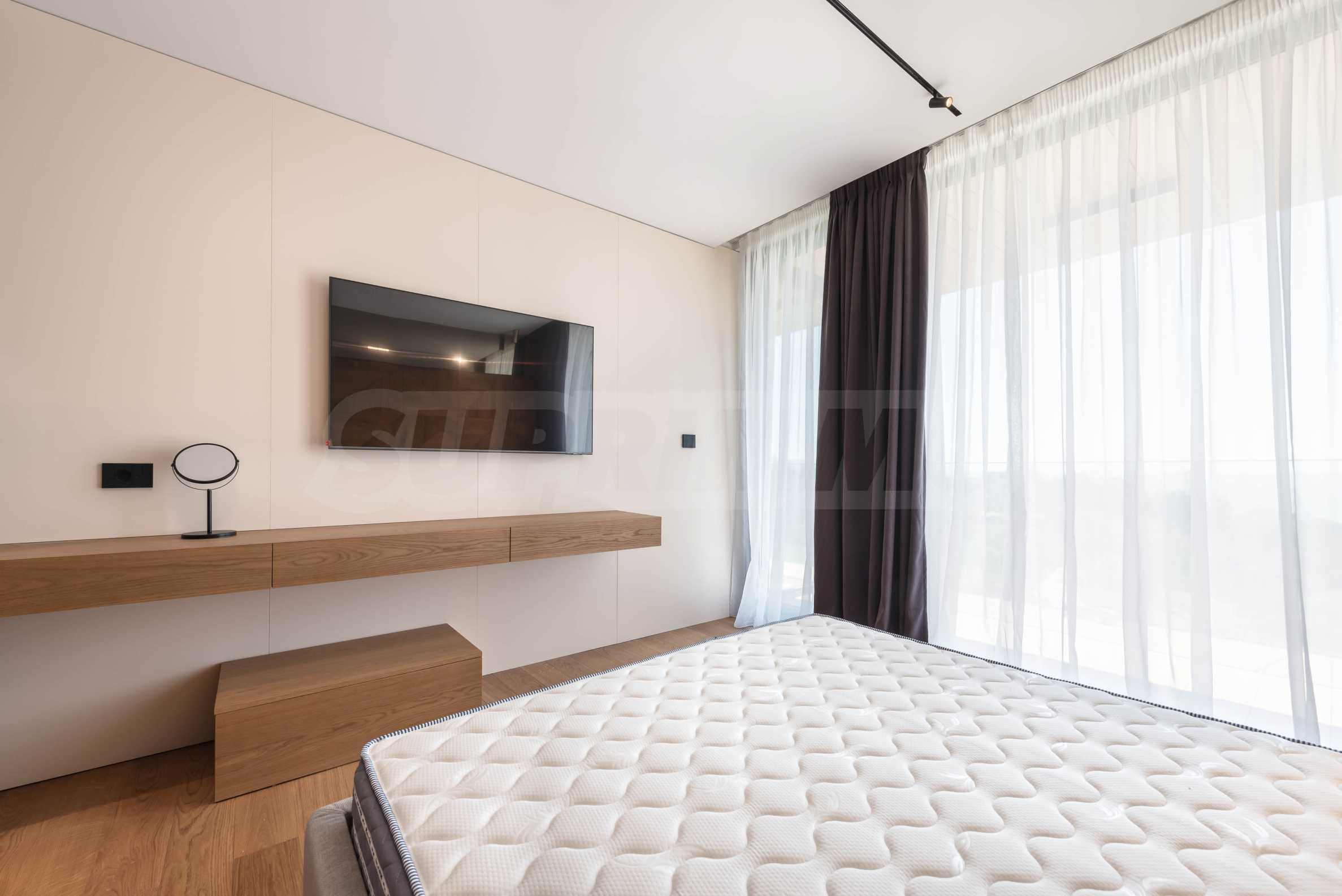 Die Wohnung ist qualitativ mit hochwertigen Materialien ausgestattet und mit modernen und funktionalen Möbeln ausgestattet. Die Einbauküche wurde nach individuellem Projekt mit hochwertigen Miele-Geräten gefertigt. Zur Ausstattung gehören Backofen, Kochfeld, Geschirrspül- und Kaffeemaschine, Einbaukühlschrank mit Gefrierfach, Weinvitrine und Spüle. Die Böden sind im Wohnzimmer mit Naturparkett und in der Küchenecke mit italienischen Granitfliesen ausgelegt, in den Schlafzimmern mit weichem Textilboden und auf den Terrassen mit Dielen aus Verbundmaterial. Die Wände sind mit Furnierpaneelen mit integrierter Beleuchtung, Spiegeln und Glas verkleidet und im Kinderzimmer mit farbenfrohen Zeichnungen gefüllt. Die Decken sind mit eingebauter Beleuchtung und Hintergrundbeschallung (Bowers & Wilkins) abgehängt. Die meisten Zimmer sind komplett möbliert, im Wohnzimmer können Sie die Polstermöbel jedoch nach Ihrem Geschmack auswählen.