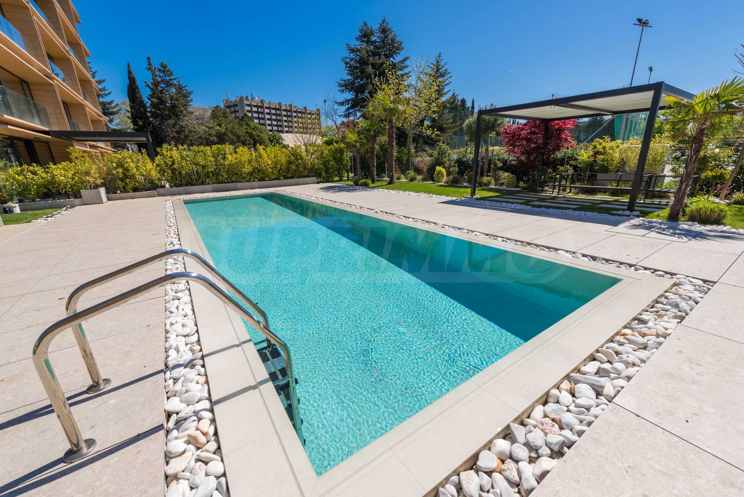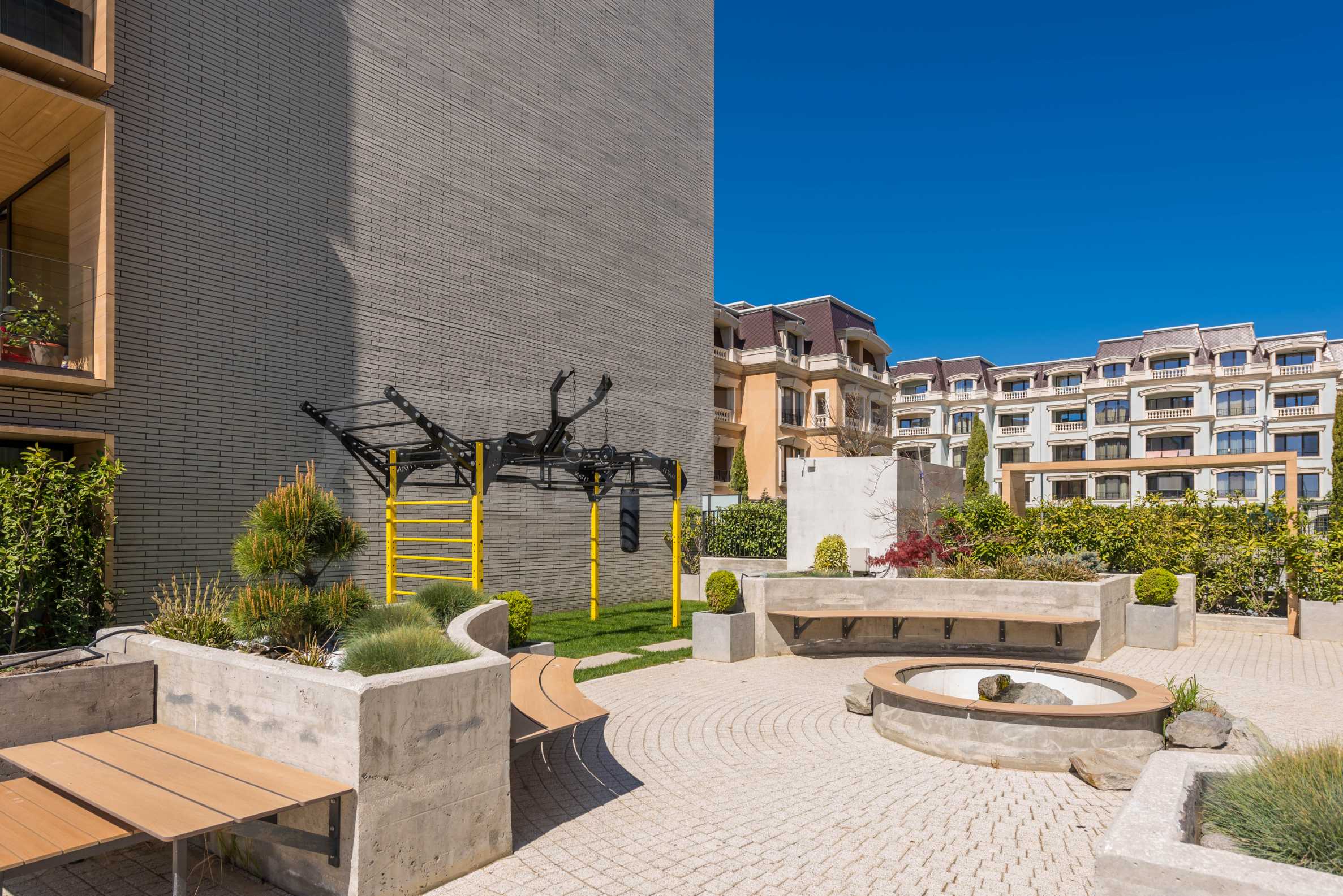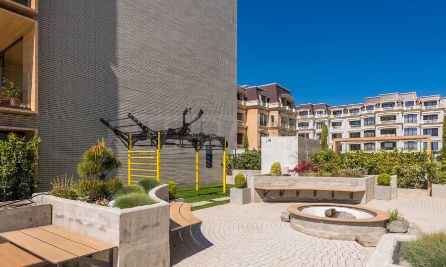 Der Komplex besteht aus zwei Gebäuden, die auf einem 2630 qm großen Grundstück errichtet wurden. Es handelt sich um eine geschlossene Wohnanlage mit kontrolliertem Zugang und Videoüberwachung, die allen Bewohnern Ruhe und Sicherheit garantiert. Es verfügt über einen Außenpool, einen Pavillon, einen Blumengarten, Fitnessbars im Freien sowie Außen- und Tiefgaragenparkplätze mit Garagen und Stellplätzen. Zur bequemen Nutzung des Pools oder Strandes gibt es auf dem Gelände ein Außenbad mit Toilette.