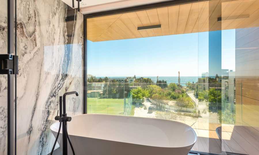 - drei Badezimmer mit Duschkabinen, wobei das Badezimmer des Hauptschlafzimmers über eine zusätzliche Badewanne mit Meerblick verfügt;