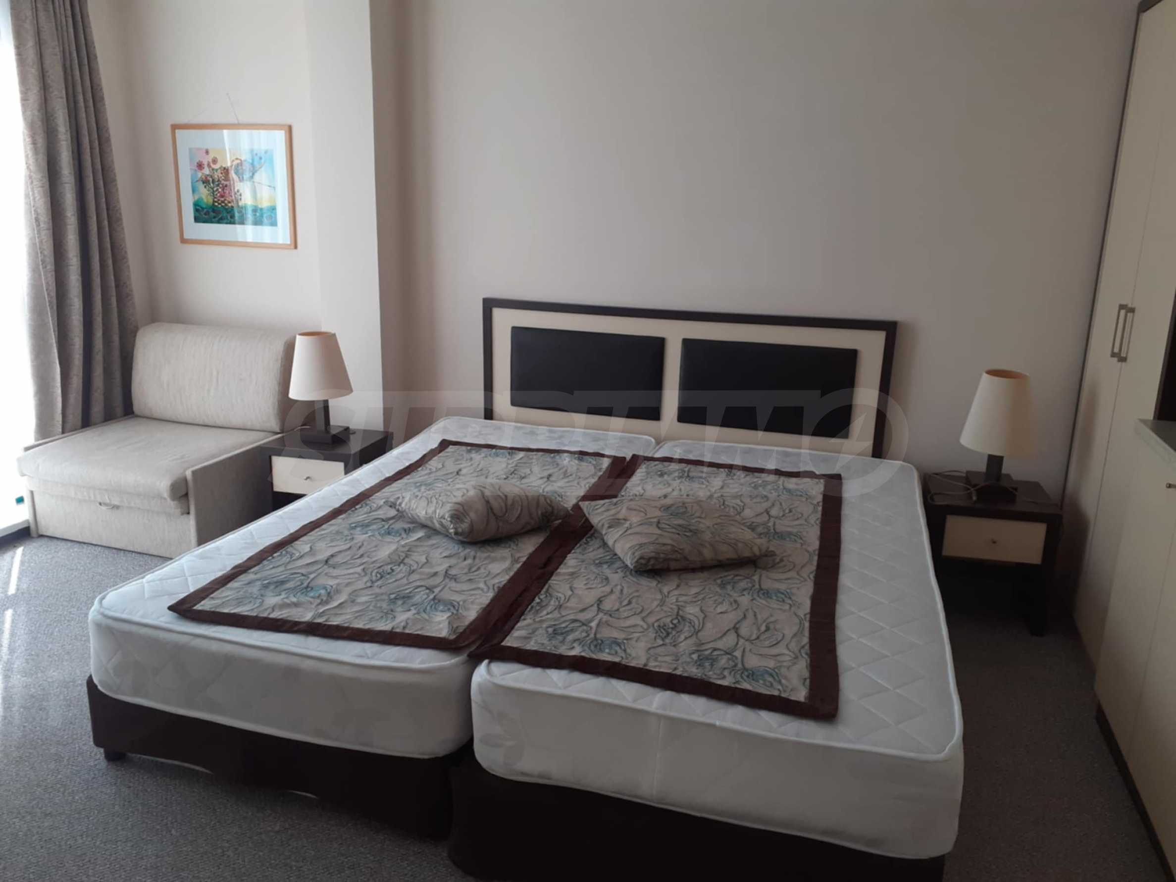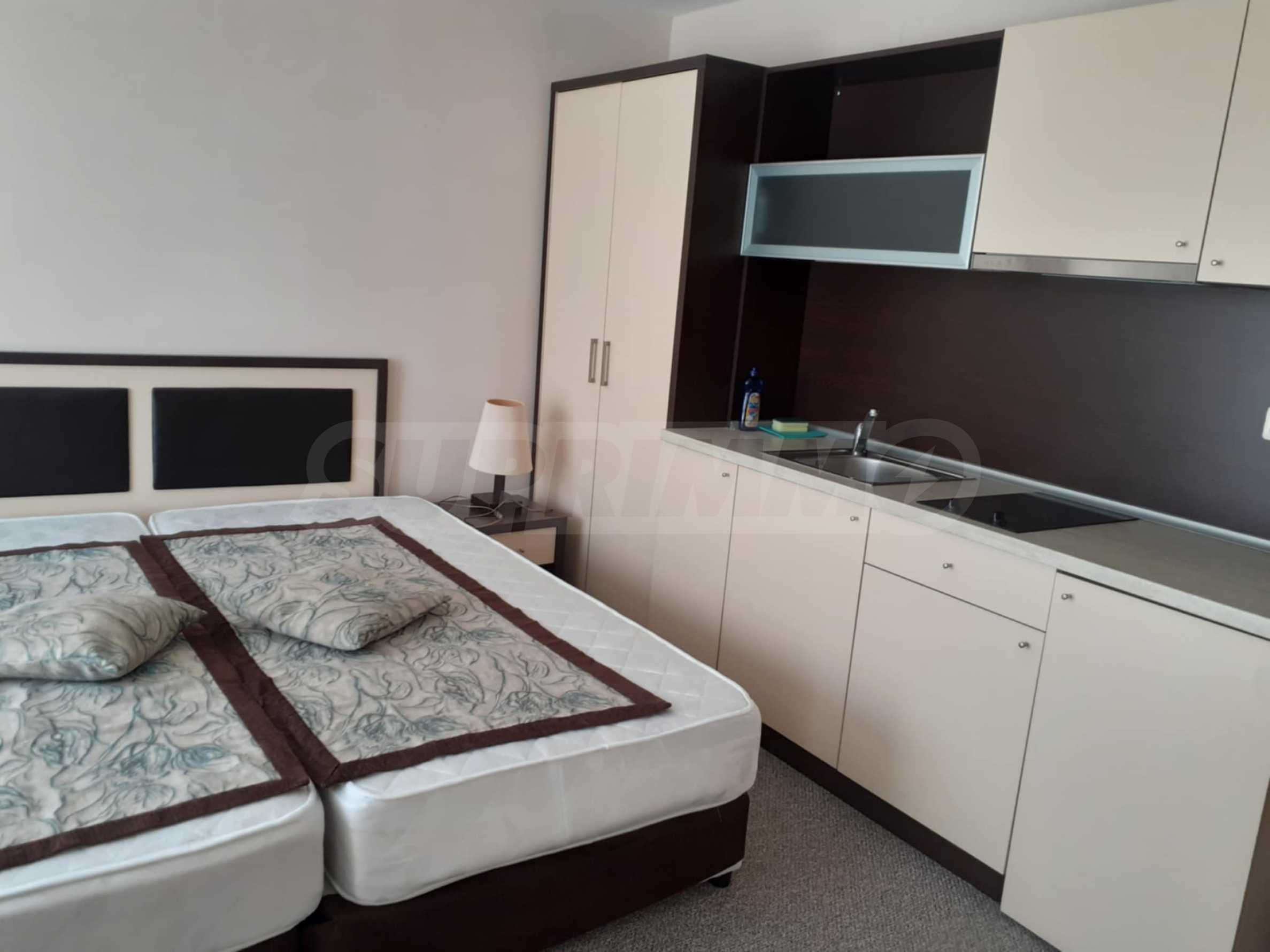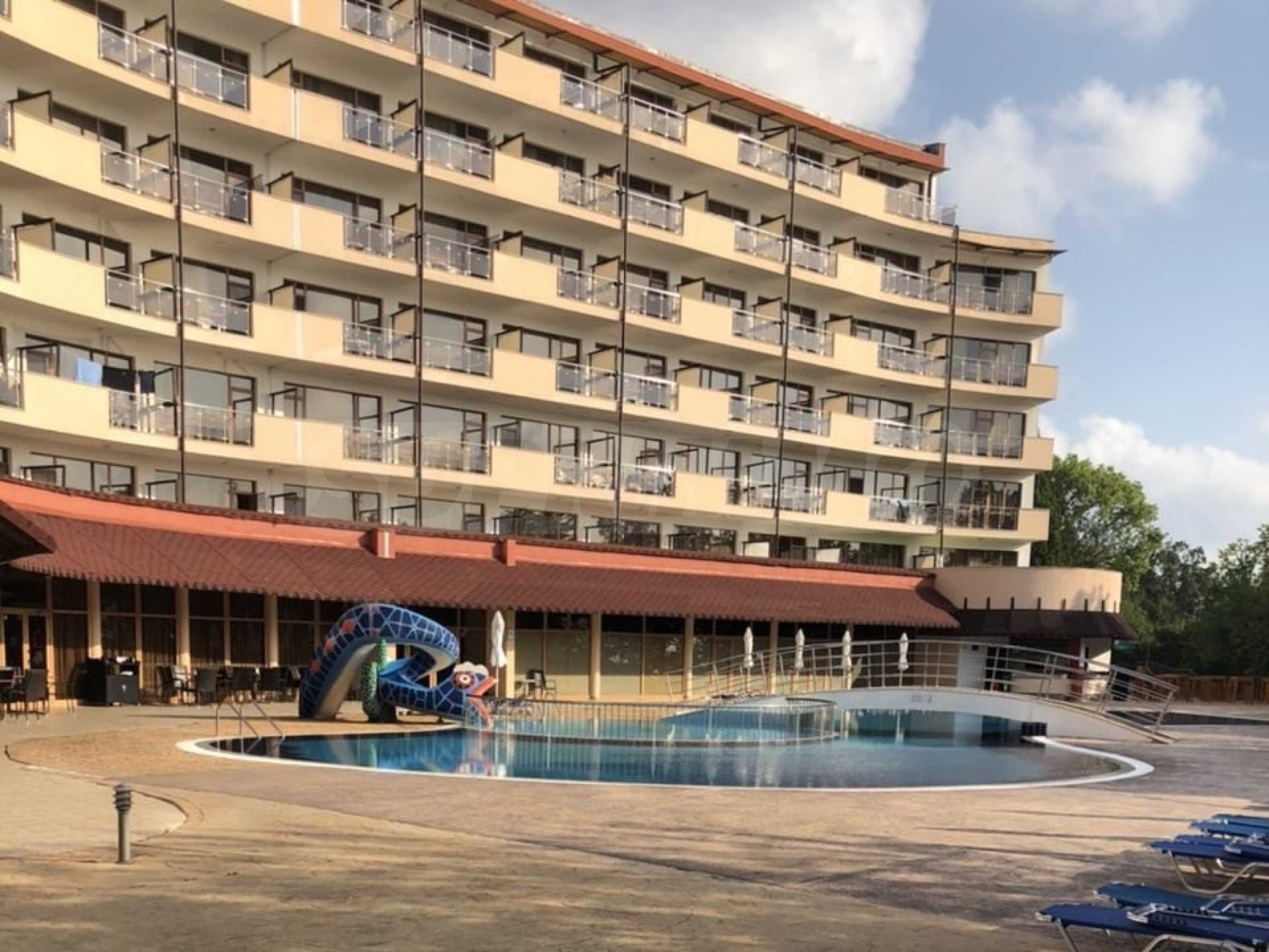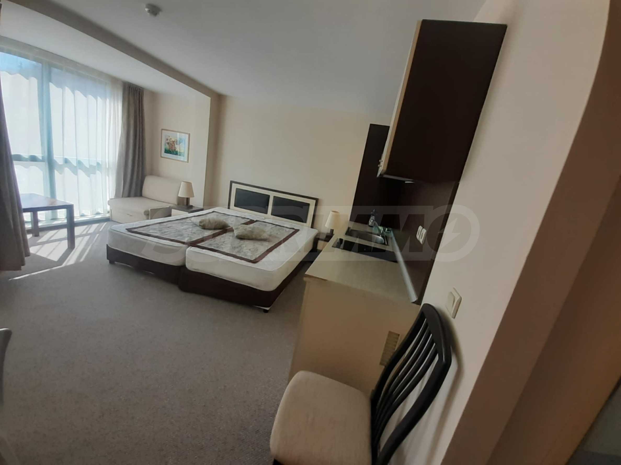 Wir präsentieren exklusiv ein möbliertes Studio zur Miete in einem Hotelkomplex mit Swimmingpool, in erster Strandreihe im Ferienort Goldstrand.