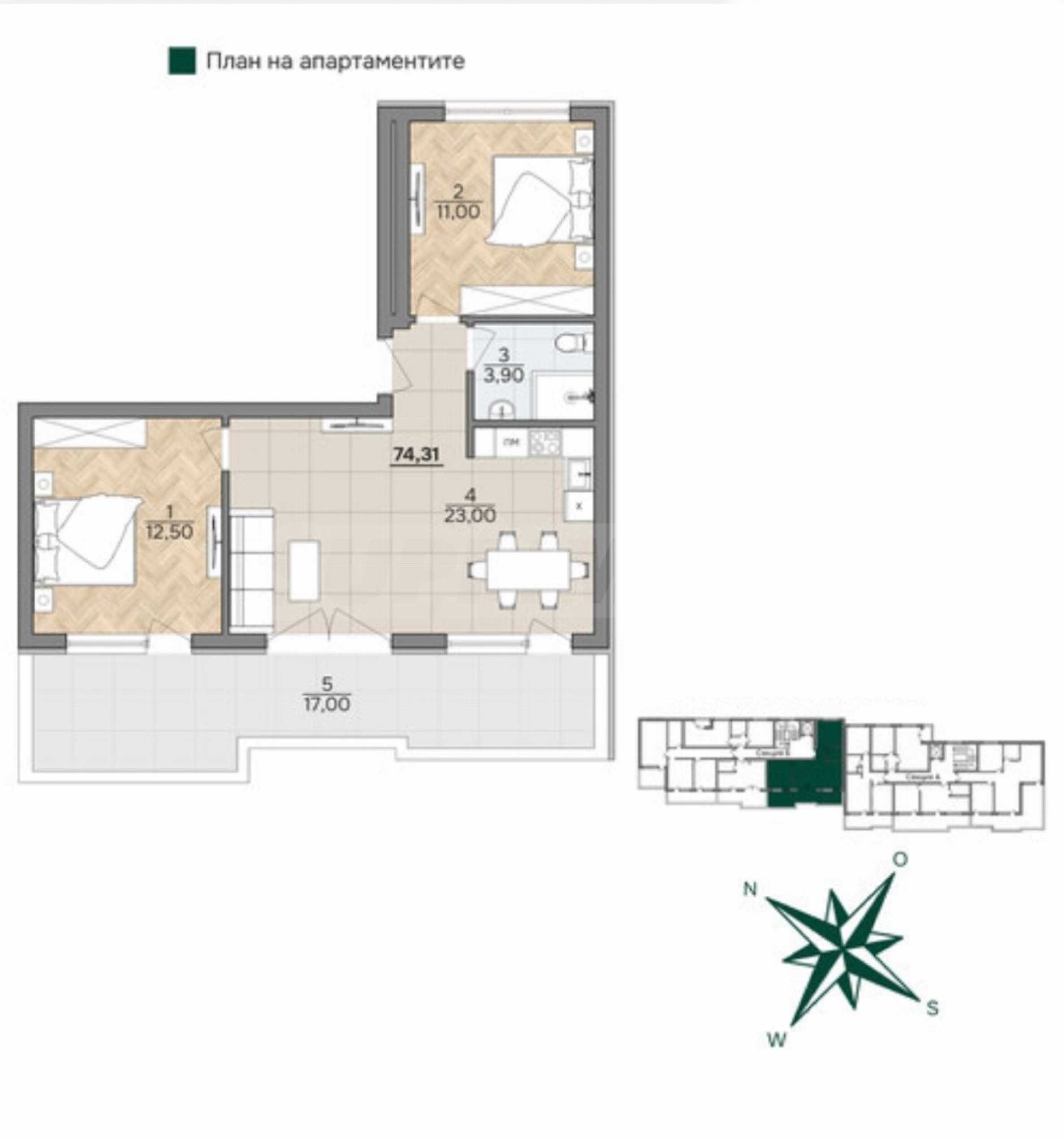 Die Wohnung mit einer Gesamtfläche von 74 qm befindet sich im 4. Stock eines 4. Stockwerks und hat folgende Raumaufteilung: