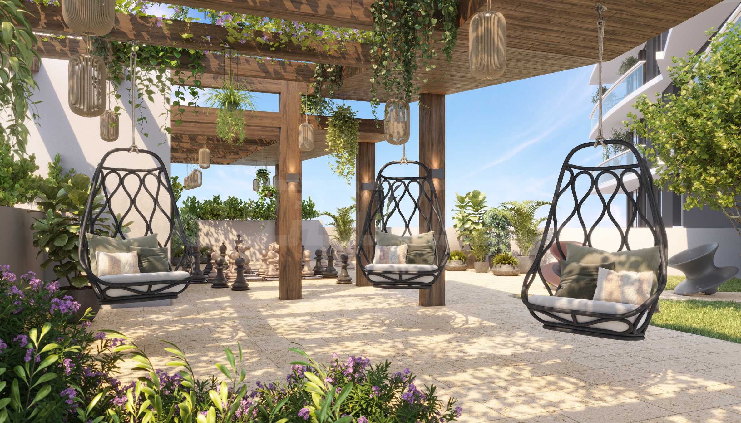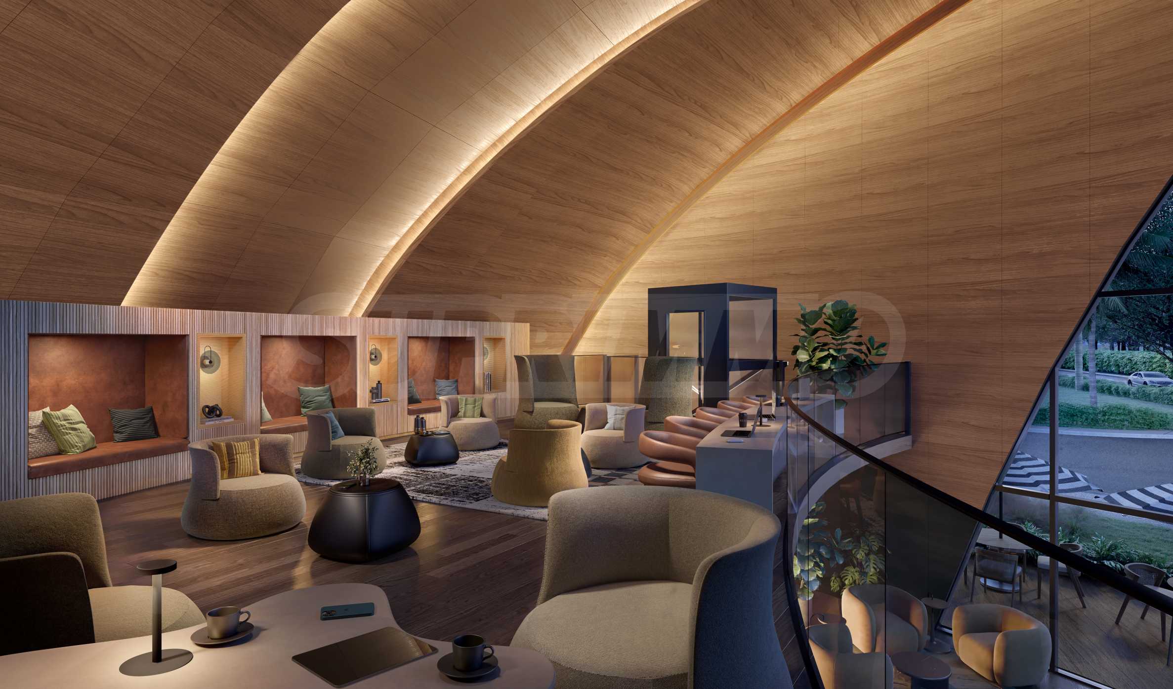 Inmitten üppigen Grüns finden Sie ein weiteres zweistöckiges Gebäude, das als flexibler Arbeitsbereich konzipiert ist ideal für Remote-Arbeit oder inspirierende Meetings. Im obersten Stockwerk erwartet Sie eine stilvolle Terrasse mit beeindruckendem Blick über die Stadt eine Kombination aus urbanem Charme und einem Gefühl von Zeitlosigkeit.