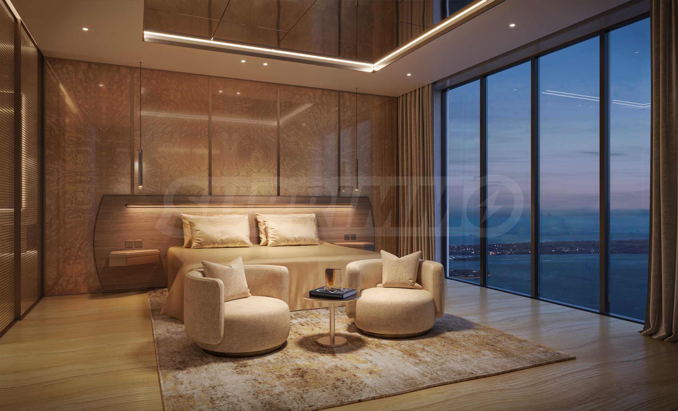 Das Projekt bietet eine Kombination aus Luxusresidenzen und einem Hotelbereich und einer der großen Vorteile ist die Möglichkeit der Kurzzeitmiete, die den Eigentümern Flexibilität bietet. Die Innenräume zeichnen sich durch hohe Decken, raumhohe Panoramafenster und ein Gefühl von Luftigkeit und Licht aus. Der spektakulärste Raum bleibt die 6 Meter hohe Lobby, die das Gefühl von Erhabenheit unterstreicht.