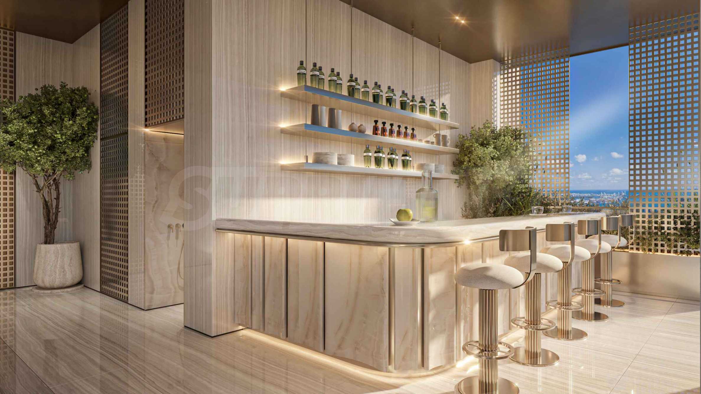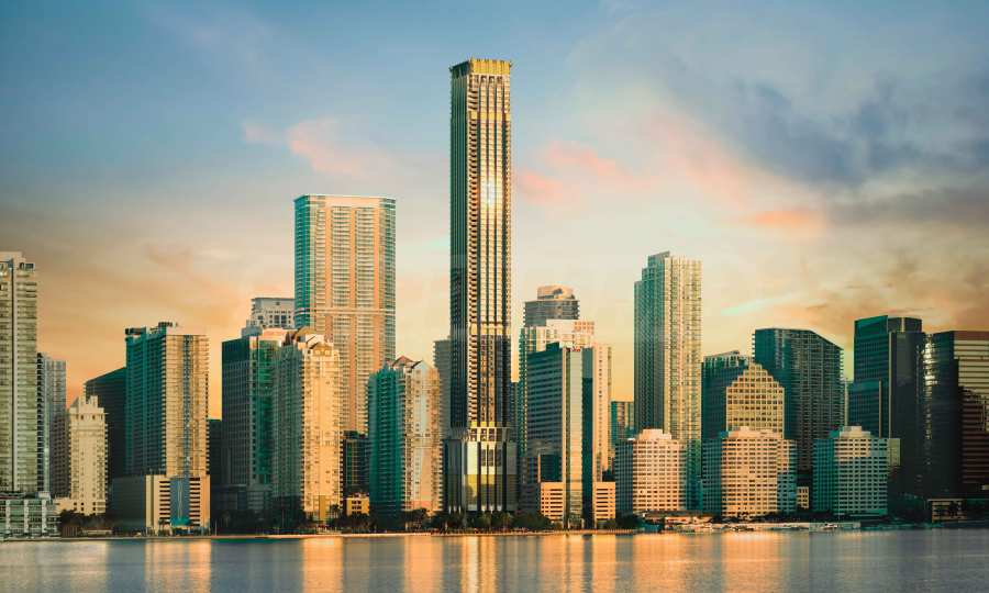 JDS Development Group und GV Development arbeiten Hand in Hand, um das 90-stöckige Gebäude zu errichten, das eine Höhe von fast 320 m erreichen wird. Der Eingang des Gebäudes besticht durch seine beeindruckende Erscheinung und die Kombination aus Marmor, Glas, asymmetrischer Beleuchtung und Metallelementen, die in perfekter Harmonie miteinander verschmelzen. Sie werden sogar von Springbrunnen vor dem Gebäude begrüßt, die an Sommertagen für Kühle sorgen und das Gefühl von Luxus und Komfort verstärken, das das Gebäude ausstrahlt.