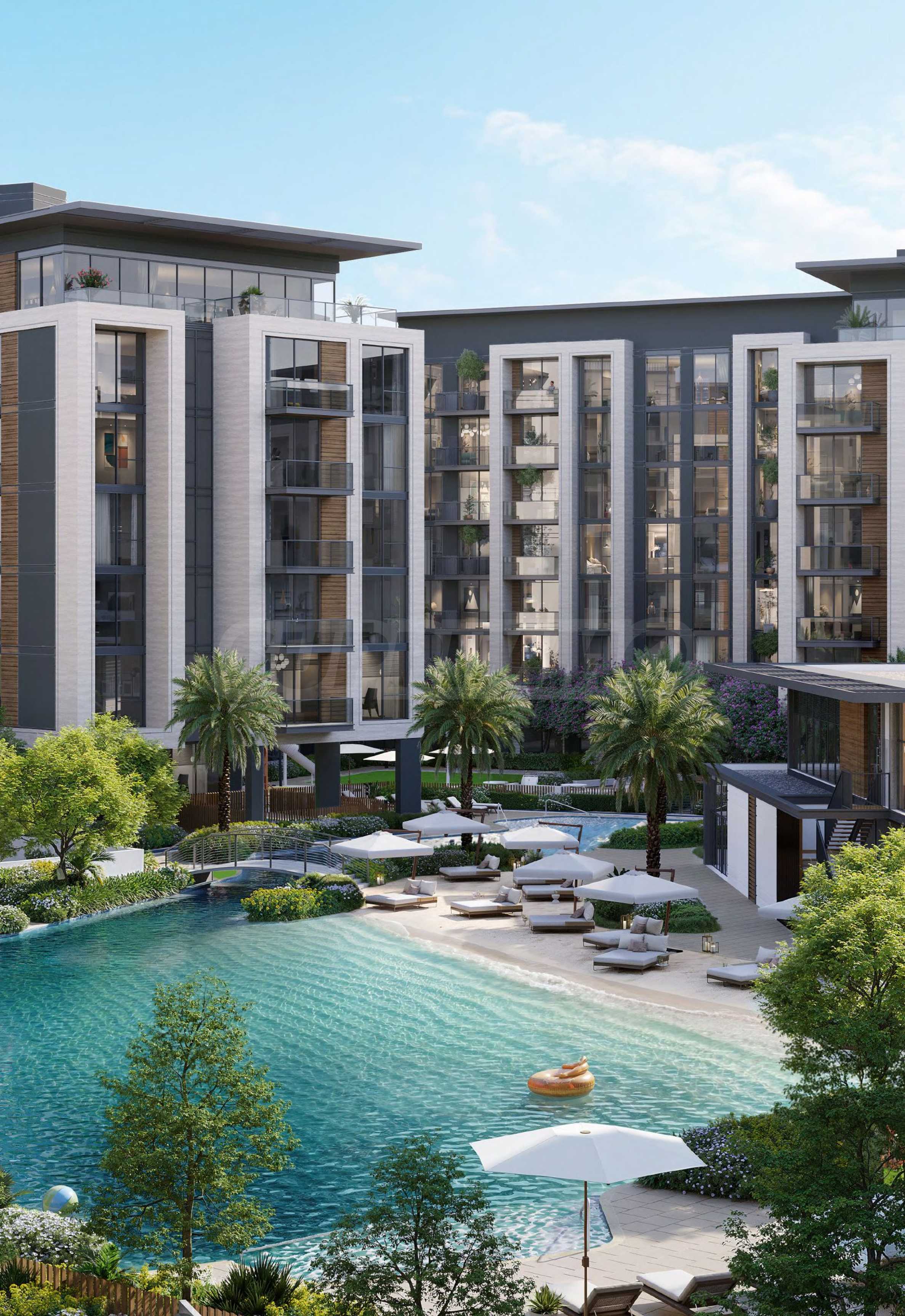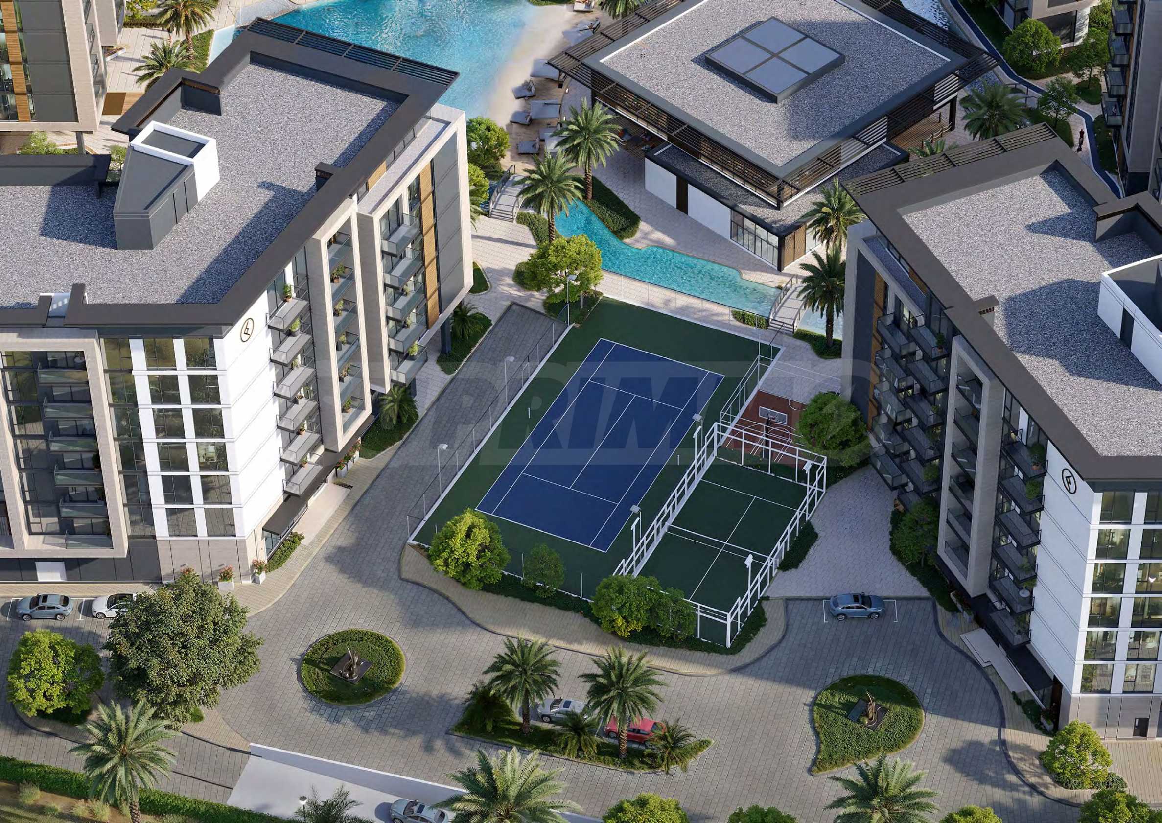 Einer der ikonischen Akzente des Komplexes ist der LAZY RIVER – ein malerischer Wasserkanal, der sich um die Gebäude schlängelt und das Gefühl vermittelt, im Einklang mit der Natur zu leben, wie an einem ruhigen See. Dieses Element vermittelt den Geist einer Urlaubsoase, und die Fülle an Grünflächen und Wasserflächen verwandelt die Umgebung in eine Erweiterung des persönlichen Wohnkomforts.