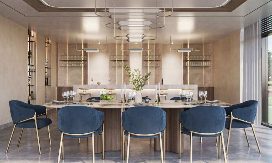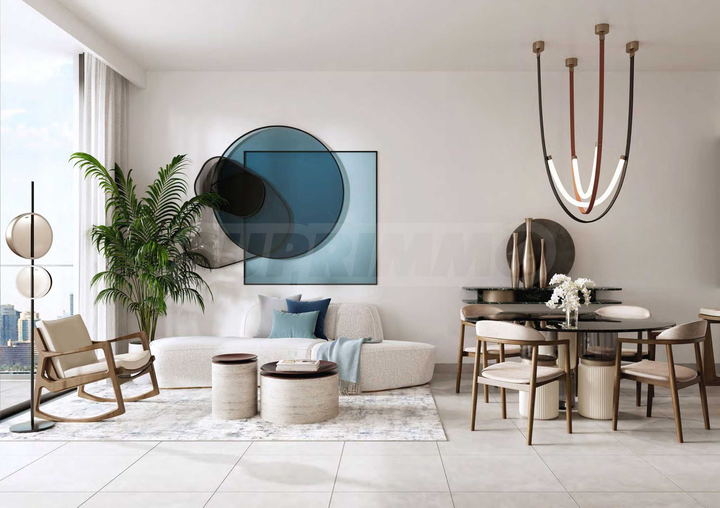 Elegant gestaltet mit hohen Decken und viel Tageslicht bieten die Wohnbereiche eine großzügige und einladende Atmosphäre. Ein Esstisch aus Stein verleiht Eleganz, während ein modulares Sofa, moderne Beistelltische und weiche Teppiche eine stilvolle und gemütliche Atmosphäre schaffen. Geschickt platzierte Regale und ein elegantes TV-Möbel vereinen Form und Funktion und machen den Raum zum idealen Ort zum Entspannen und für Unterhaltung.