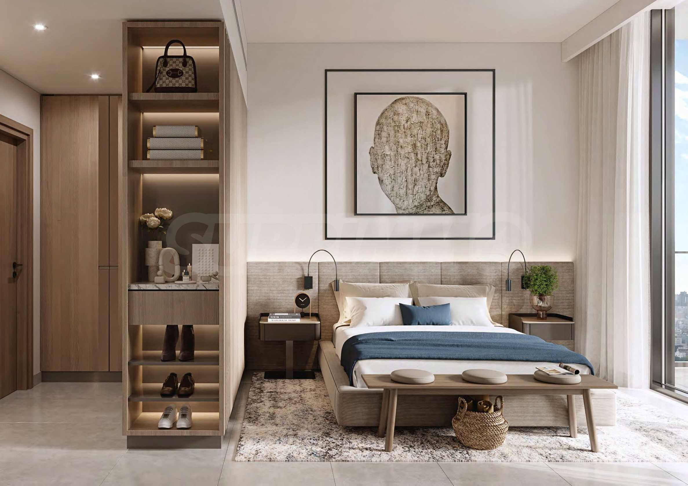 Für die Schlafzimmer wurden sanfte, natürliche Farbtöne und sorgfältig ausgewählte Details gewählt. Gepolsterte Kopfteile, klare Metallrahmen und integrierte Nachttischbeleuchtung schaffen eine entspannte Atmosphäre. Einbauschranktüren und Nischen-Frisiertische verbinden Eleganz mit Komfort, während Wandspiegel und offene Regale den Raum optisch erweitern. Große Fenster lassen natürliches Licht in den Raum und verstärken das Gefühl von Ruhe und Verbundenheit mit der Natur.