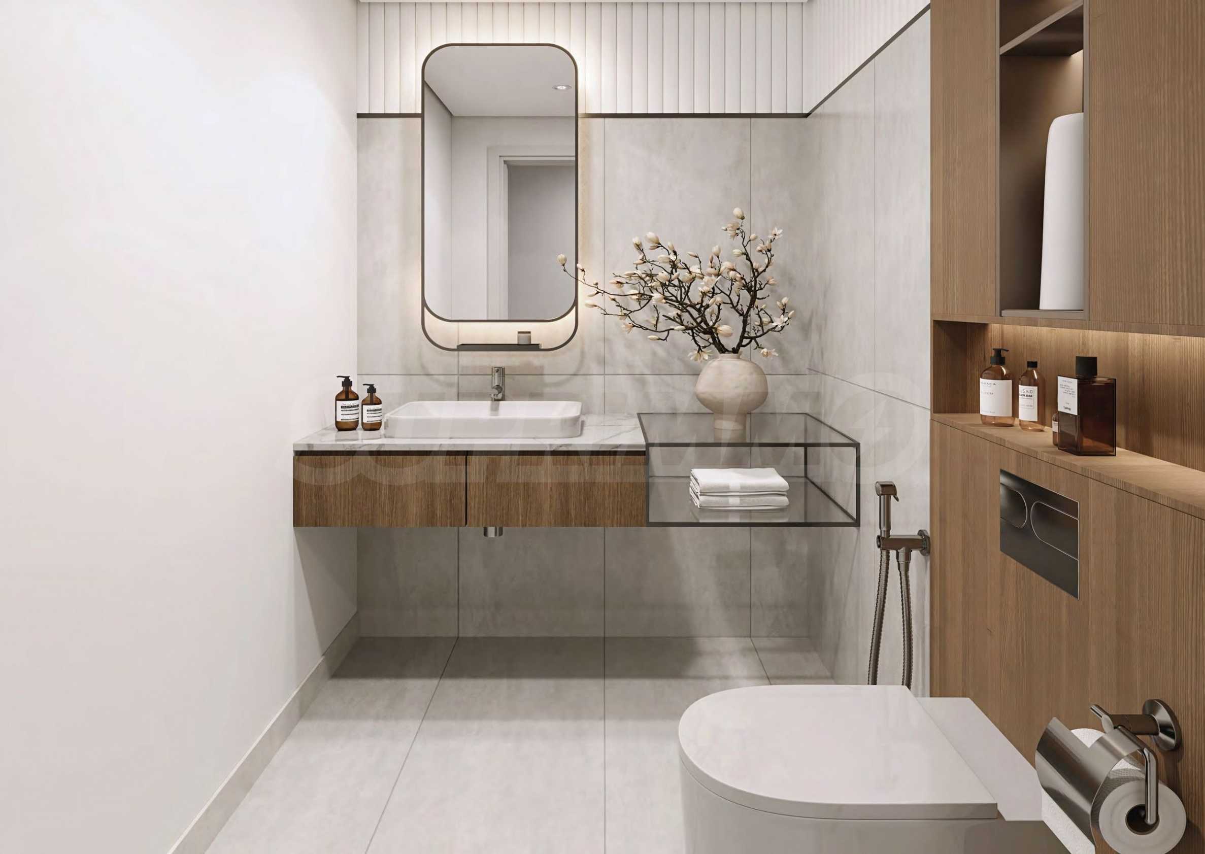 Die Badezimmer überzeugen mit eleganten Glaswaschtischen, stilvollen Schränken und funktional gestalteten Handtuchhaltern. Sanfte Beleuchtung unterstreicht das moderne Design, verleiht Wärme und schafft ein Gefühl der Ruhe. Die verwendeten hochwertigen Materialien garantieren Langlebigkeit und Luxus und machen jedes Badezimmer zu einer perfekten Kombination aus Stil und Funktionalität.