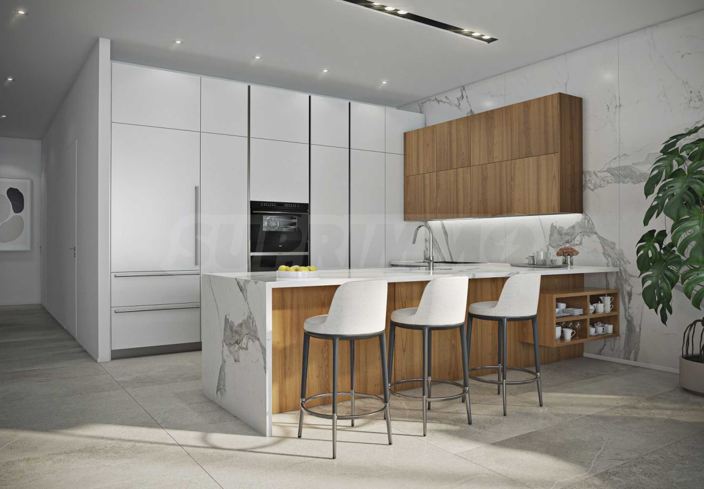 Die funktionale Aufteilung umfasst ein geräumiges Wohnzimmer kombiniert mit einer eleganten Küche und einem Essbereich, drei separate Schlafzimmer – jedes mit eigenem Bad und Kleiderschrank, eine Gästetoilette und eine große Terrasse zum Entspannen und Unterhalten.