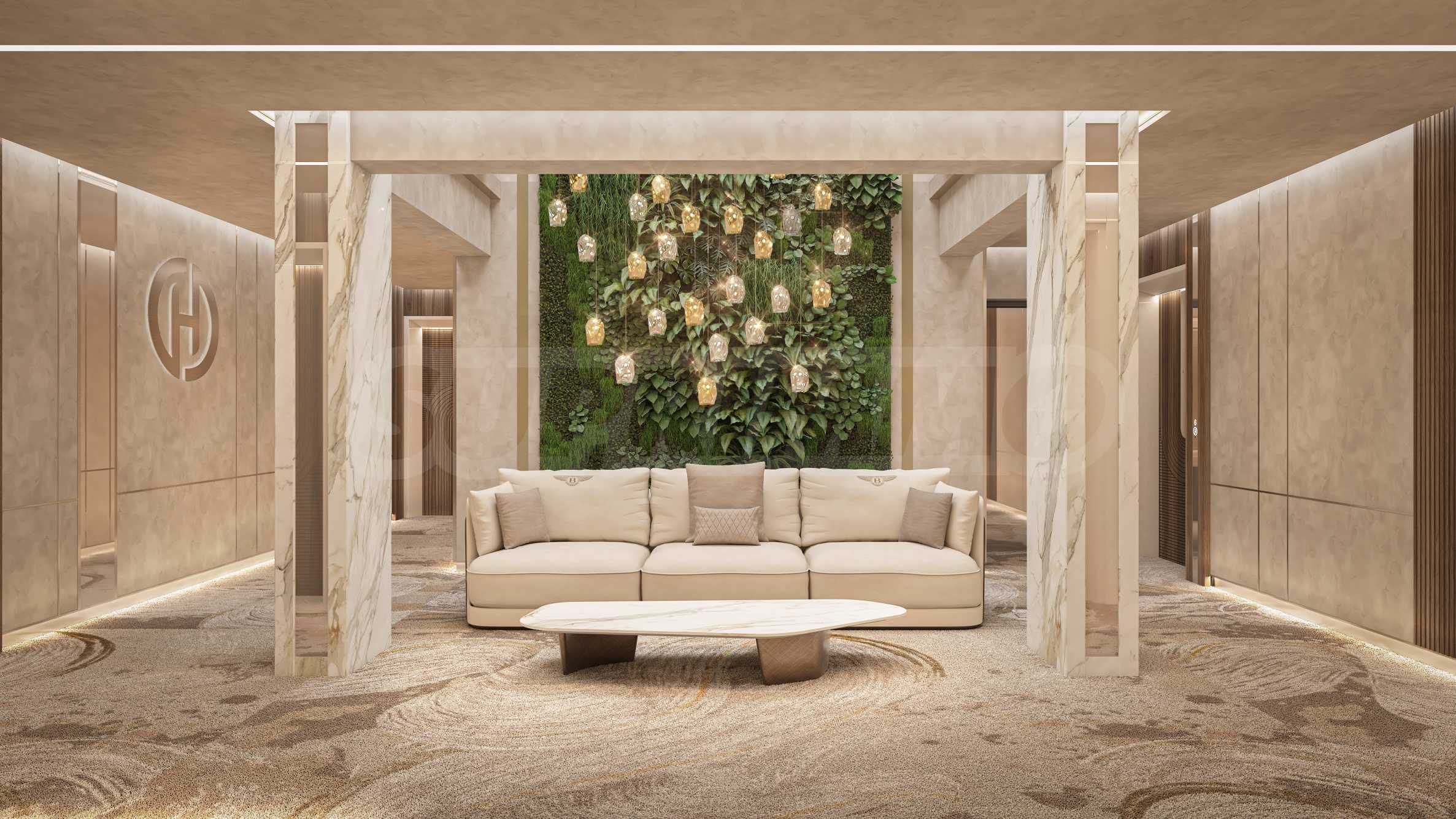 • Elegante Lobby mit Naturmarmor verkleidet, mit Polstermöbeln von Bentley Home ausgestattet, akzentuiert durch grüne Lampenschirme und einen spektakulären Kamin;
