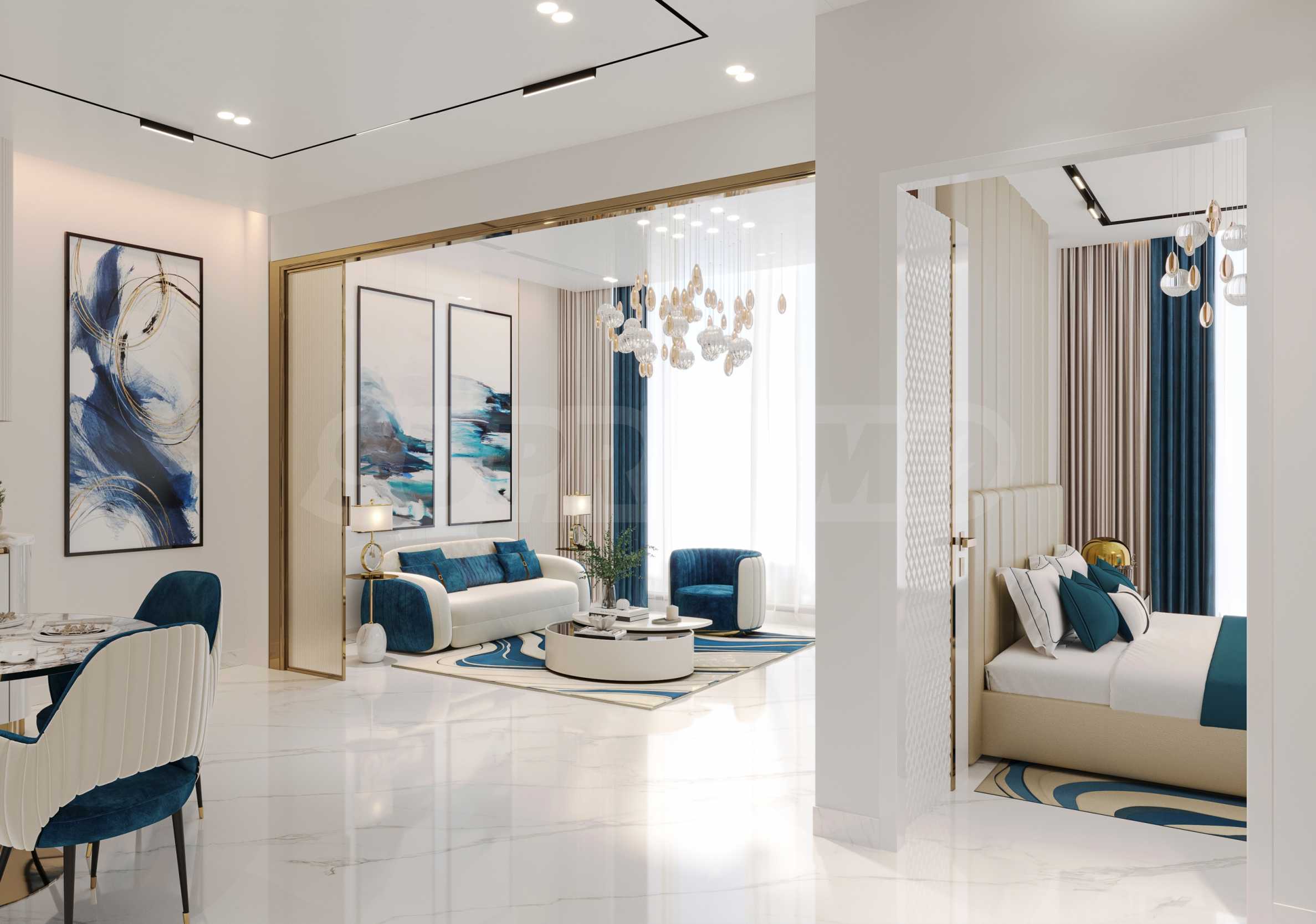 Die Wohnung befindet sich im neunten Stock und bietet eine Wohnfläche von 128,11 m². Sie bietet maximalen Komfort und eine praktische Raumaufteilung. Das geräumige Wohnzimmer geht in eine moderne Küche und einen Essbereich über. Der großzügige Balkon umgibt die gesamte Wohnung und bietet Blick auf die Stadt und den Garten des Komplexes. Die Immobilie verfügt über ein Hauptschlafzimmer mit eigenem Ankleidezimmer und Bad sowie zwei weitere Schlafzimmer mit Bädern.
