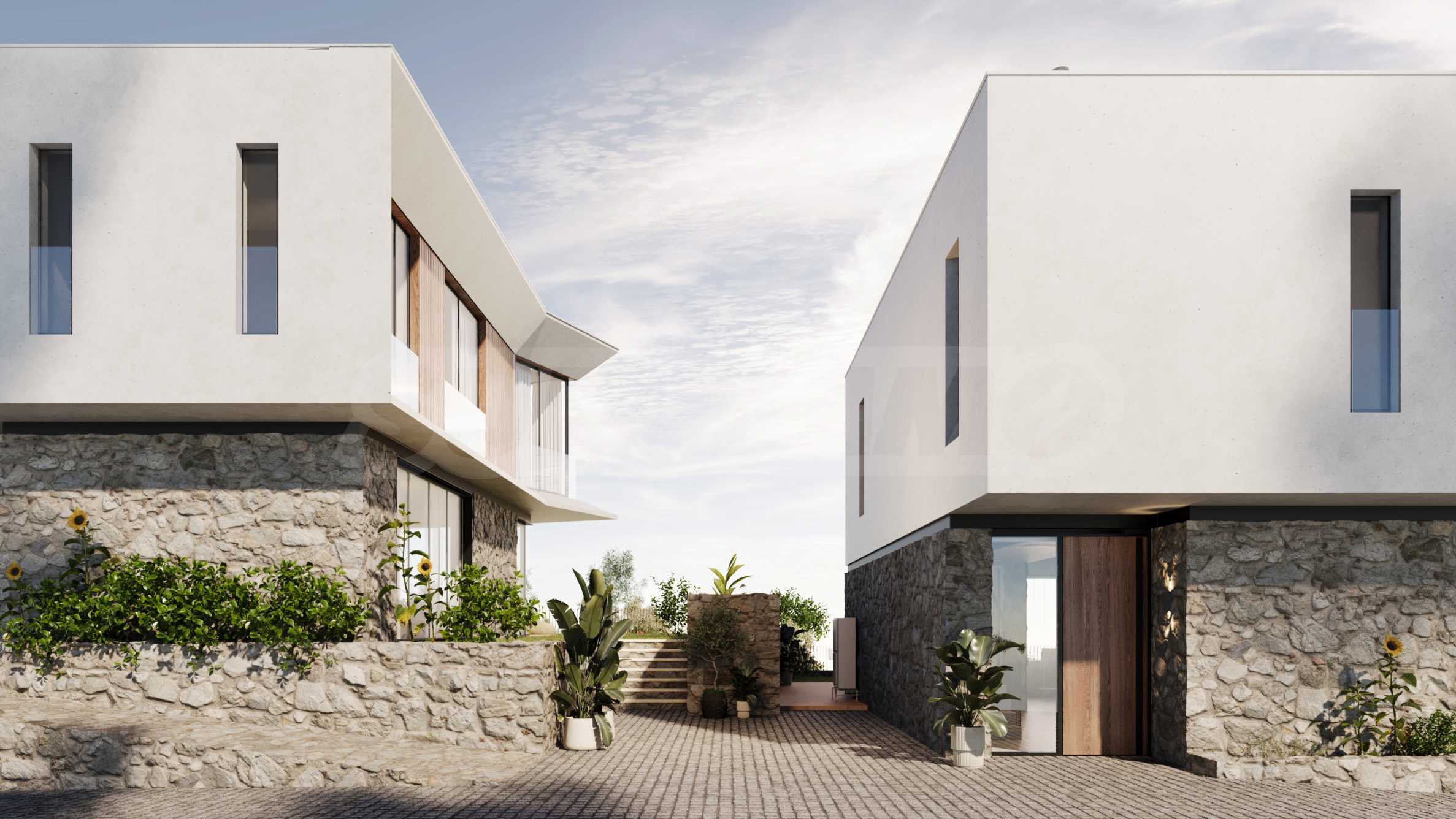 Der Komplex ist in einem zeitgenössischen Architekturstil mit geraden Linien und futuristischen Akzenten gestaltet. Die Häuser verfügen über einen modernen und funktionalen Grundriss, verteilen sich auf zwei Etagen und haben separate, begrünte Innenhöfe.