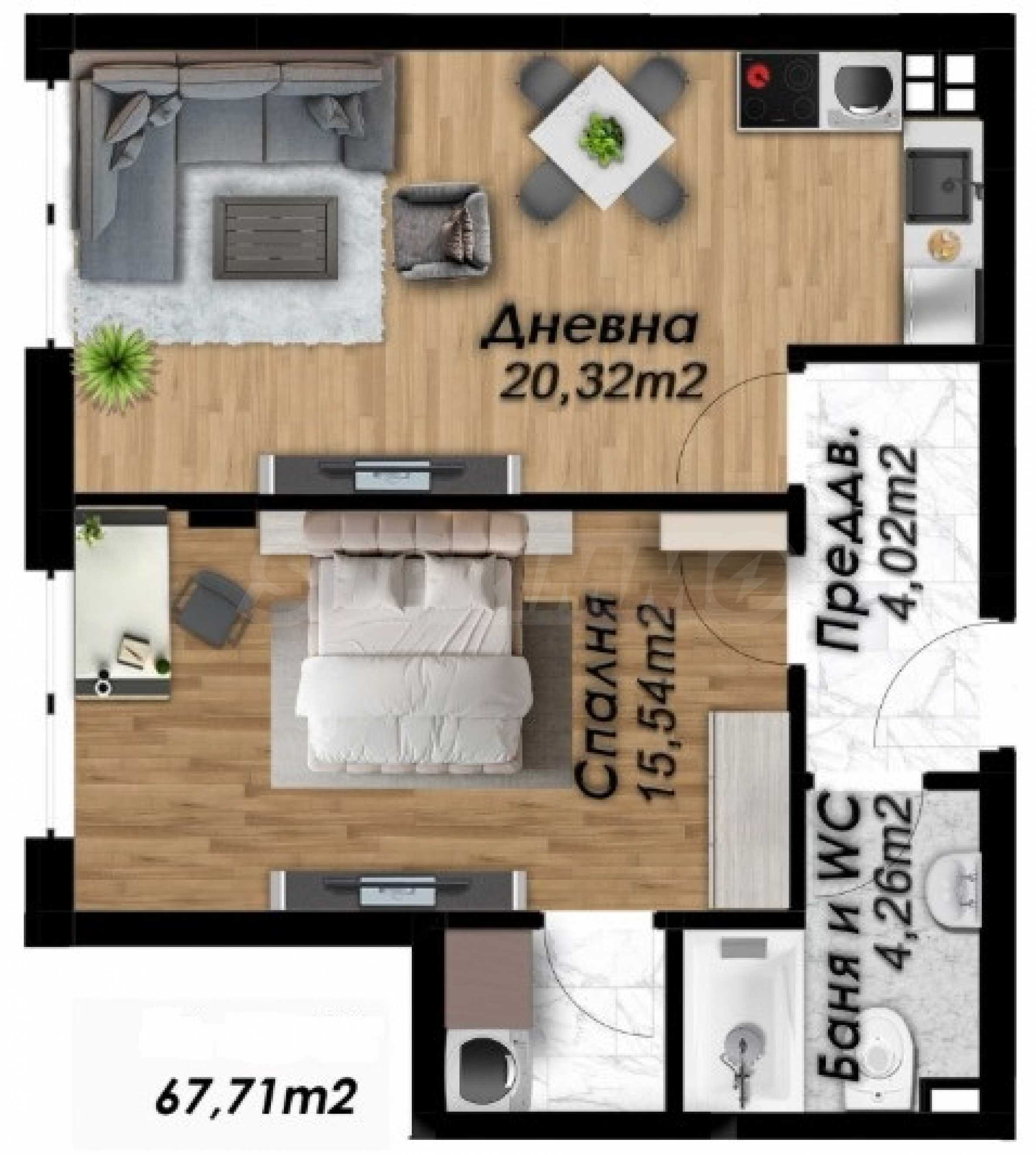 Wir präsentieren eine Einzimmerwohnung in einem neuen Komplex im Stadtteil „Belomorski“. Die Gegend ist eine der sich am schnellsten entwickelnden in Plovdiv. Sie ist aufgrund zahlreicher Parks, großer Lebensmittelketten und einer schnellen Anbindung an das Stadtzentrum, die Ringstraße und das südliche Industriegebiet äußerst begehrt und gefragt. In der Nachbarschaft entstehen ständig neue Fuß- und Radwege, Kinderparks und öffentliche Parkplätze. In der Nähe befinden sich Schulen, Kindergärten und alle notwendigen Kommunikationsmittel für die Bedürfnisse eines modernen Menschen.