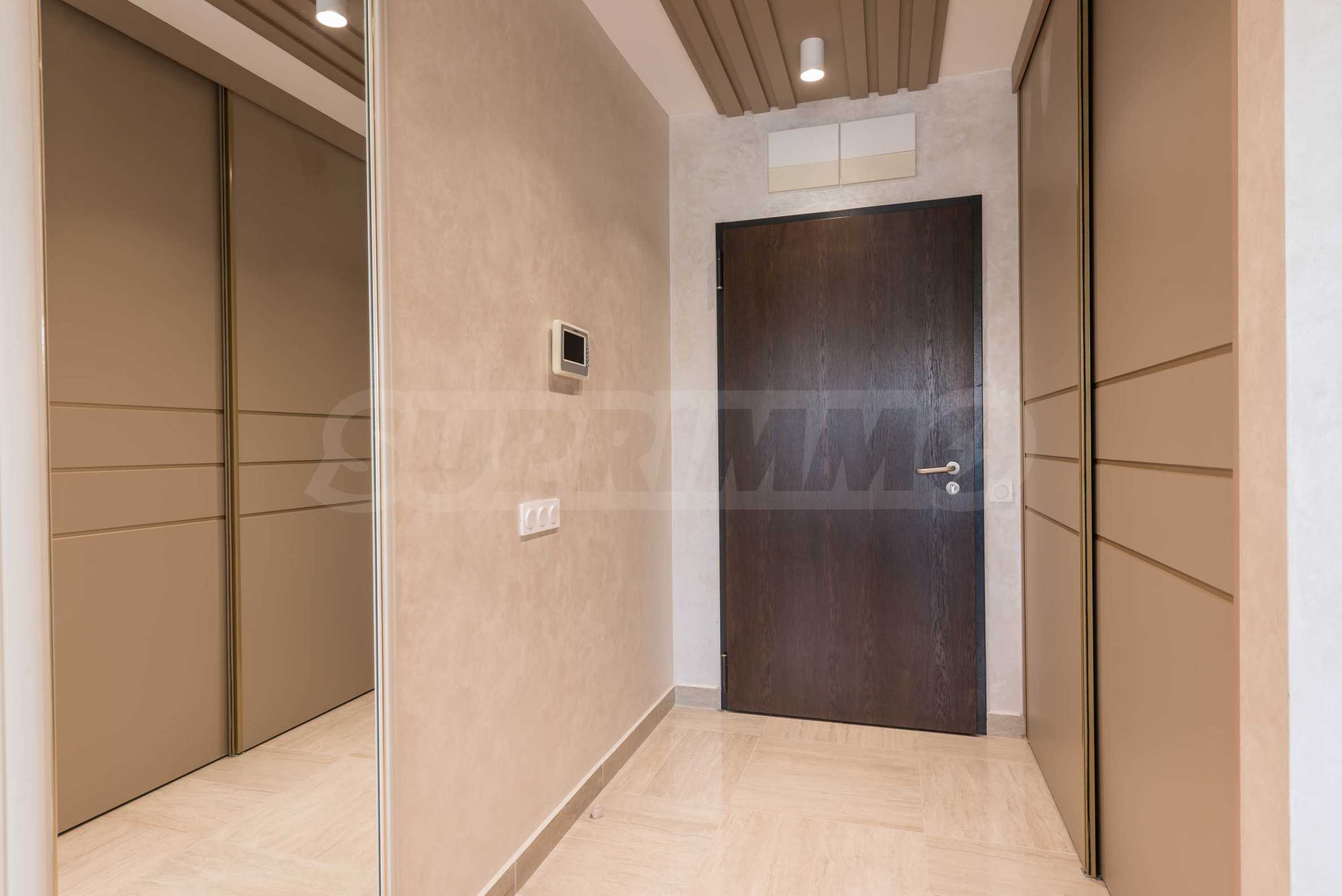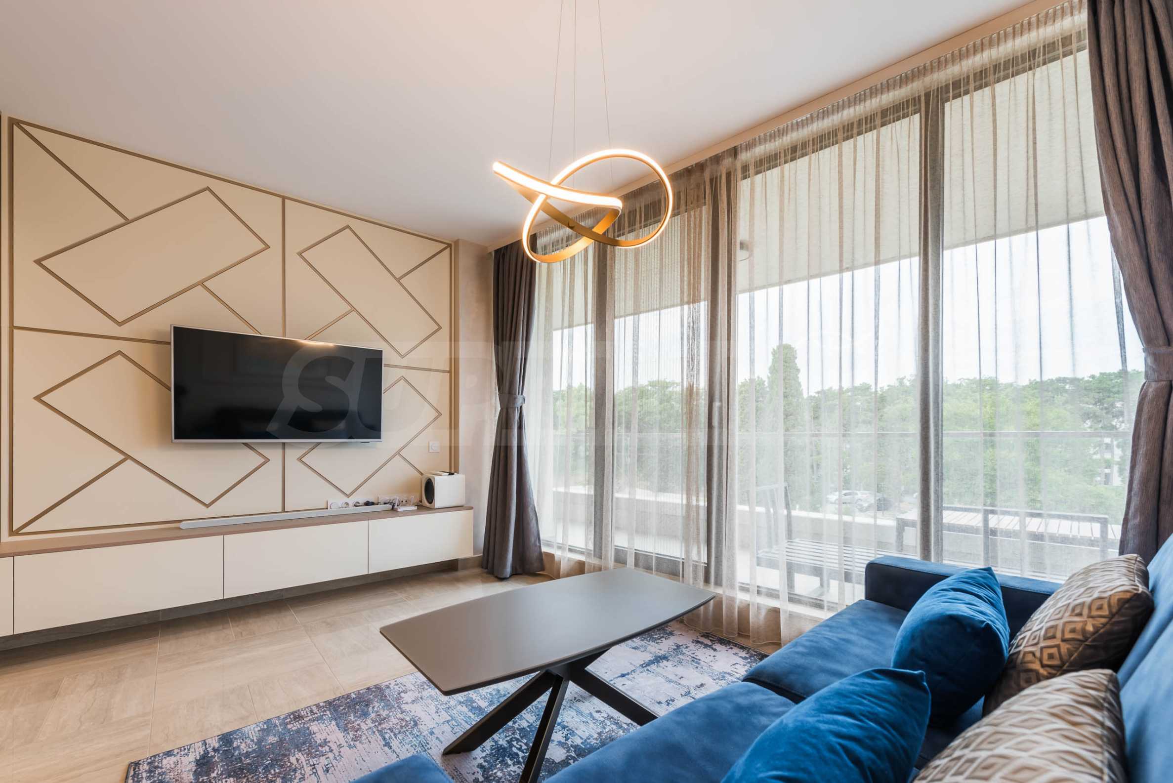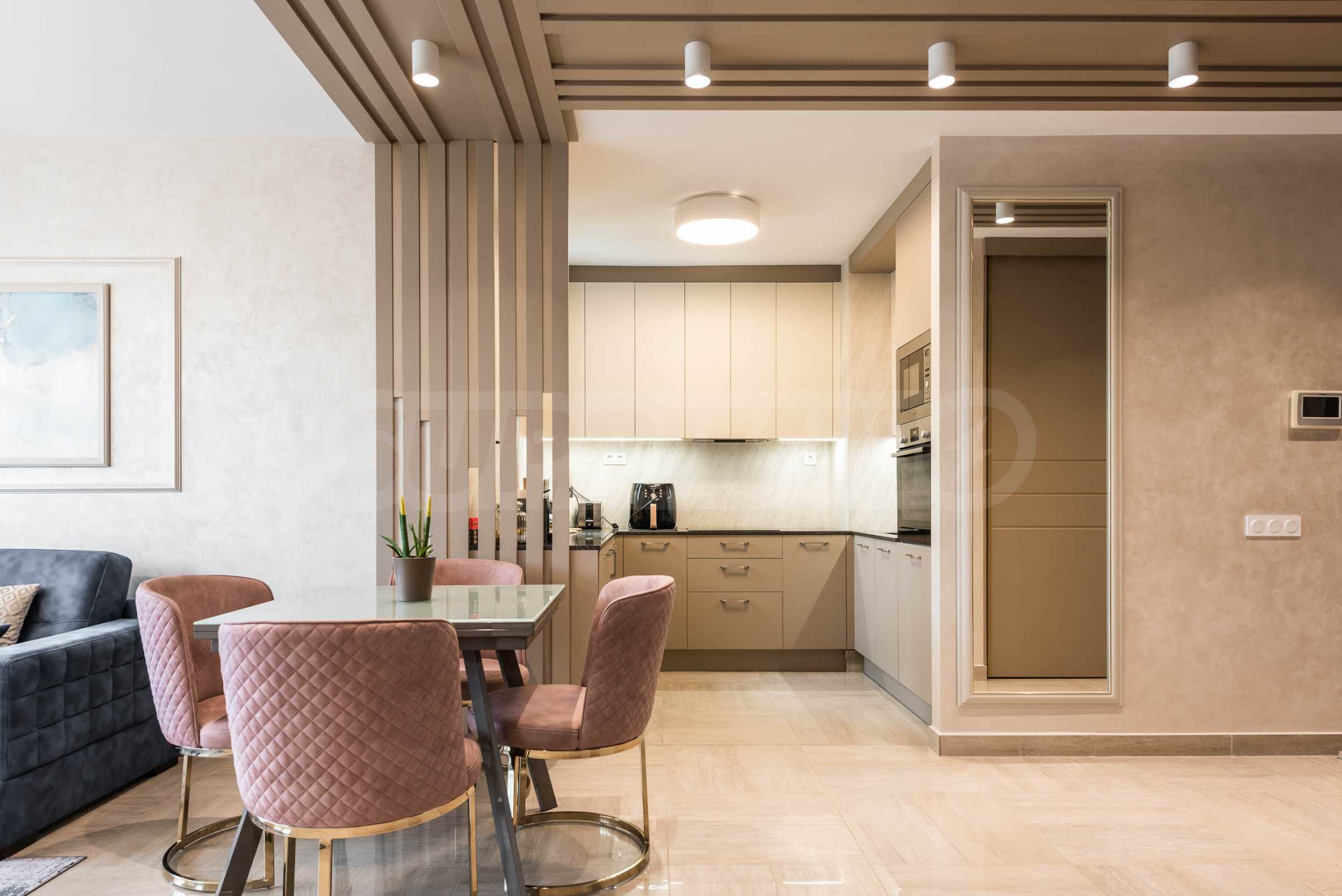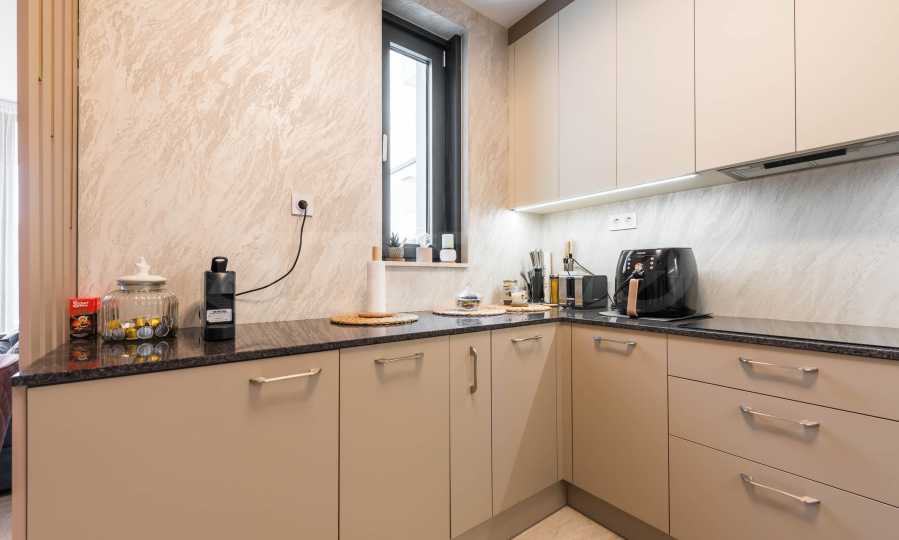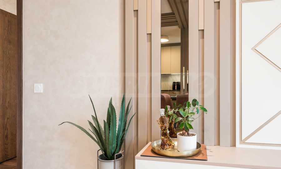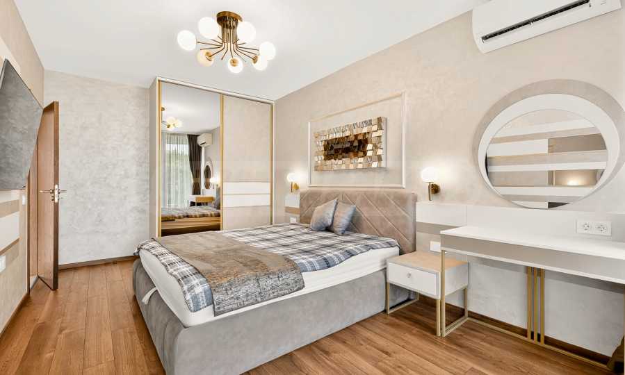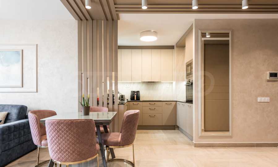 Die Wohnung besticht durch ein modernes Interieur, das mit Geschmack und Liebe zum Detail ausgewählt wurde. Die Einrichtung ist Designer, mit hochwertigen Möbeln und Geräten – alles, was Sie für einen komfortablen Alltag und eine wohlverdiente Erholung benötigen. Die Panoramafenster füllen das Haus mit Licht und schaffen ein Gefühl von Großzügigkeit und Leichtigkeit.