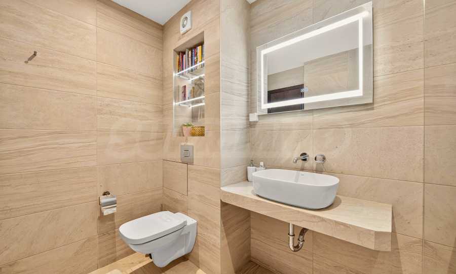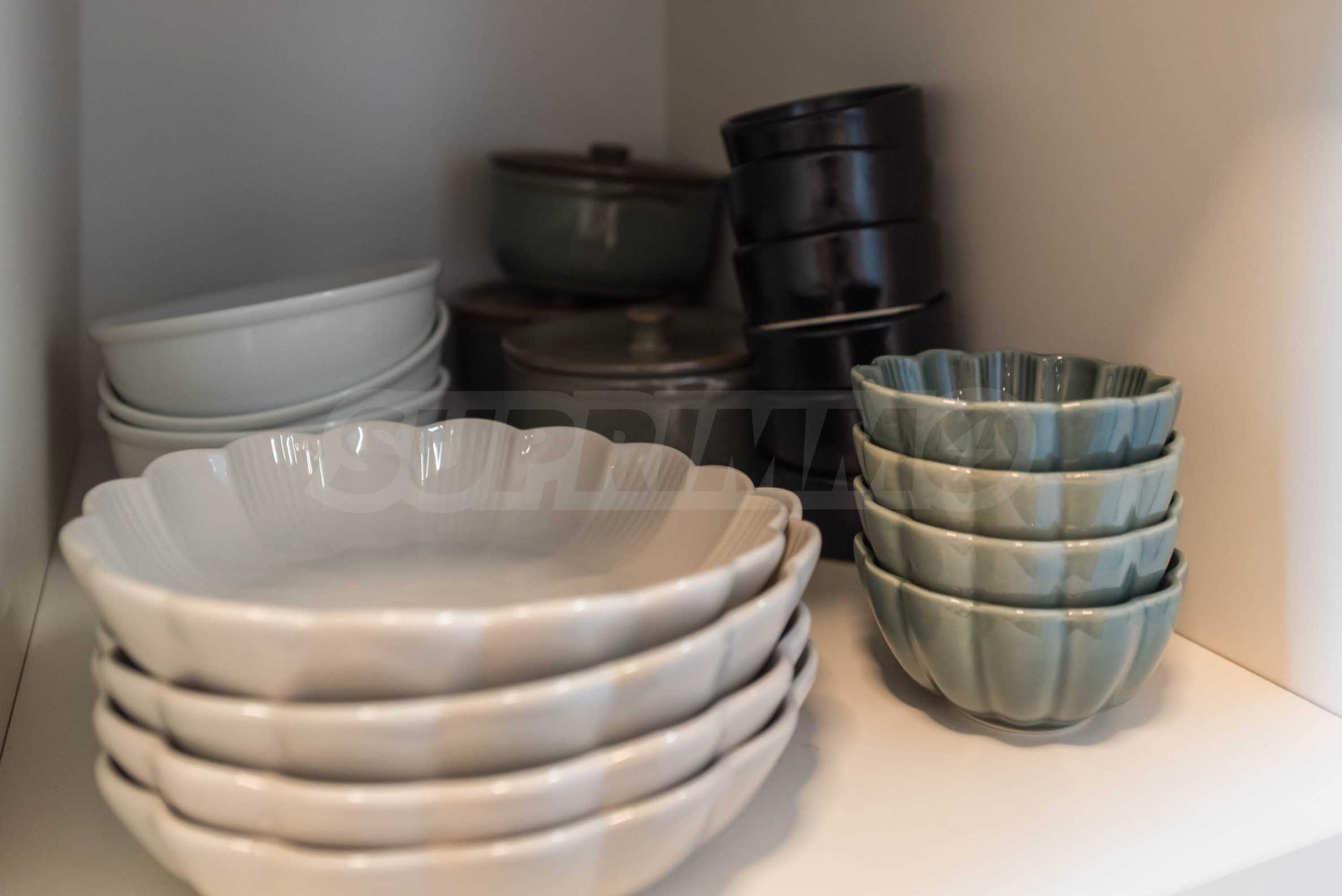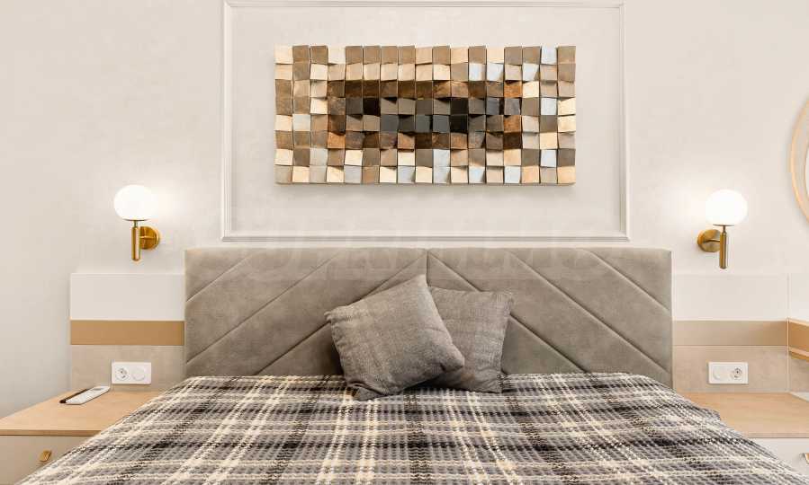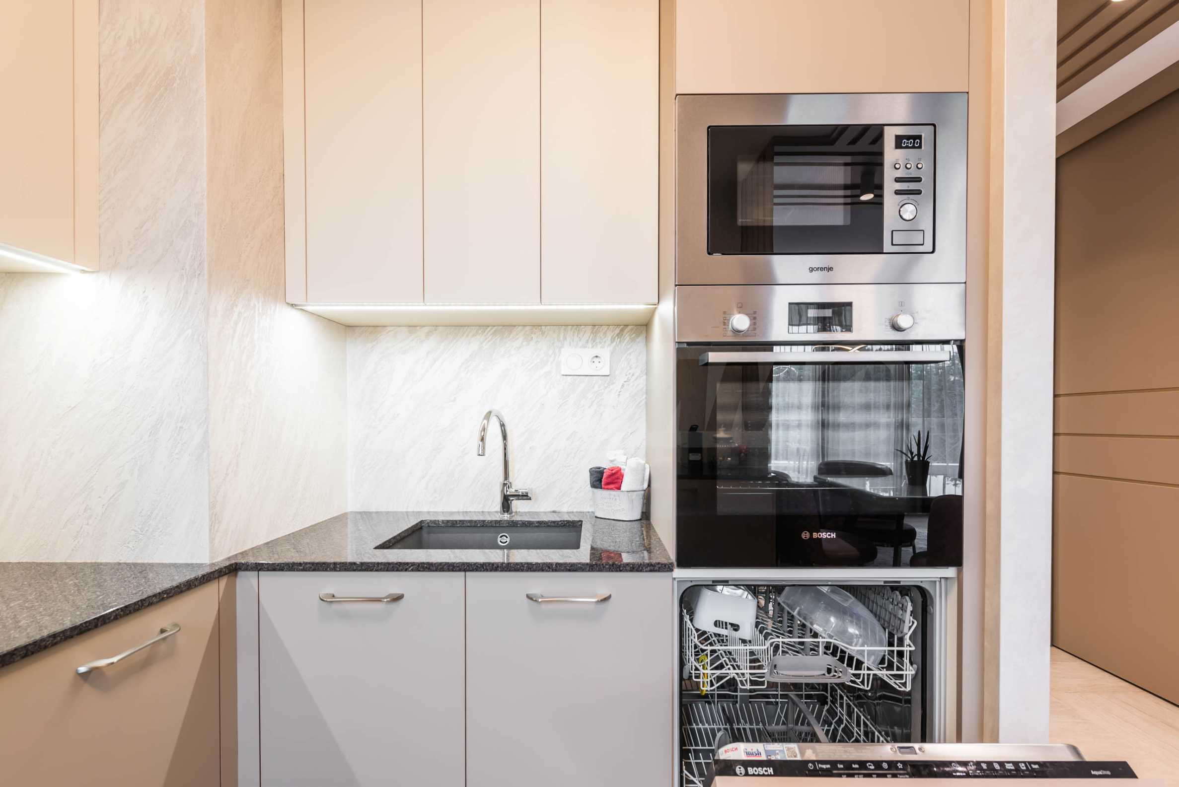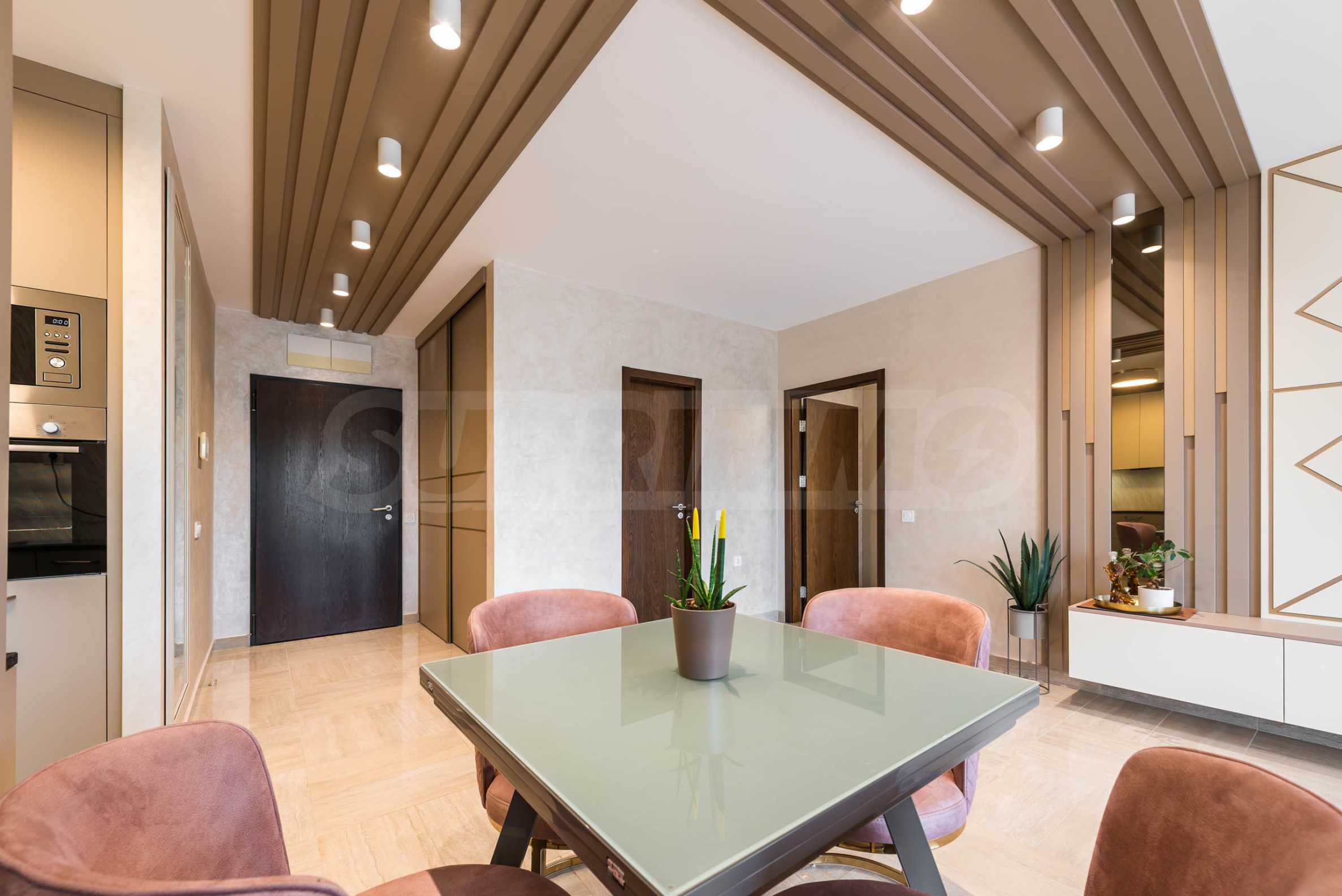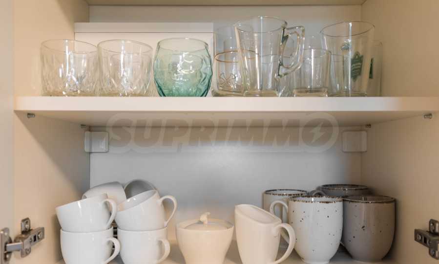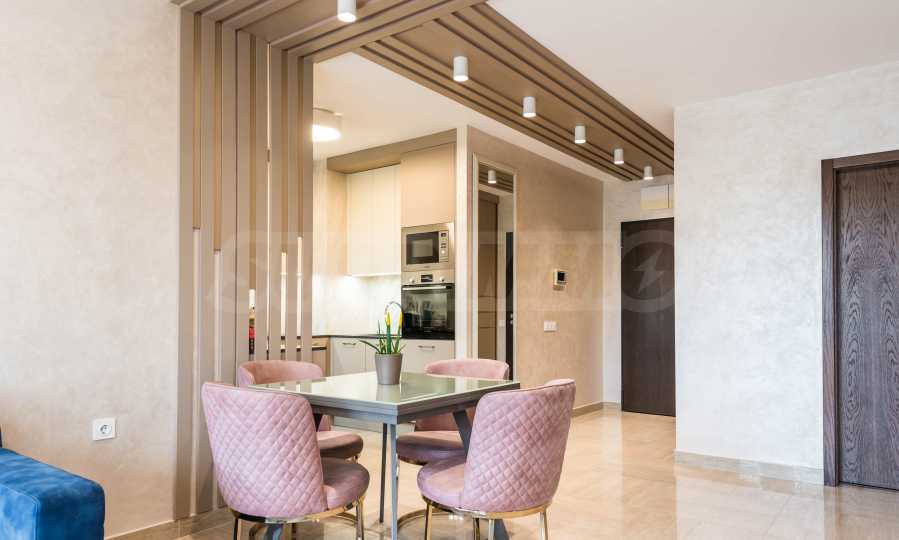 Die Wohnung besticht durch ein modernes Interieur, das mit Geschmack und Liebe zum Detail ausgewählt wurde. Die Einrichtung ist Designer, mit hochwertigen Möbeln und Geräten – alles, was Sie für einen komfortablen Alltag und eine wohlverdiente Erholung benötigen. Die Panoramafenster füllen das Haus mit Licht und schaffen ein Gefühl von Großzügigkeit und Leichtigkeit.