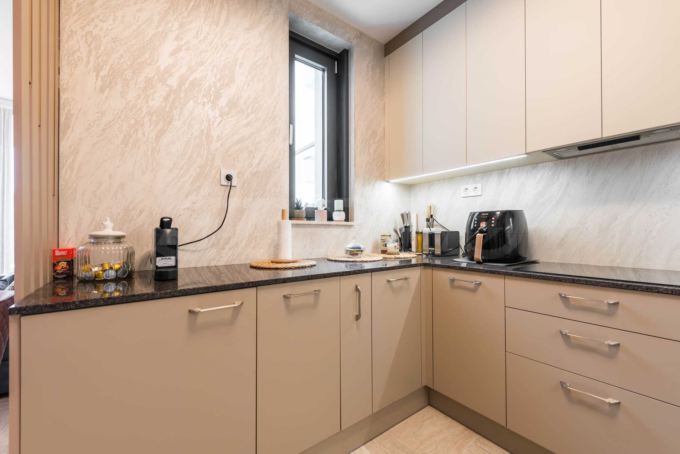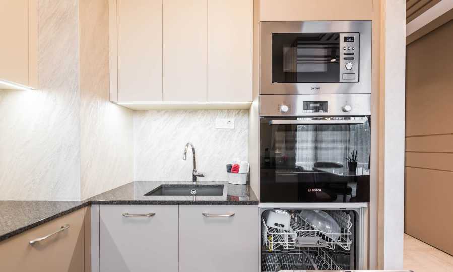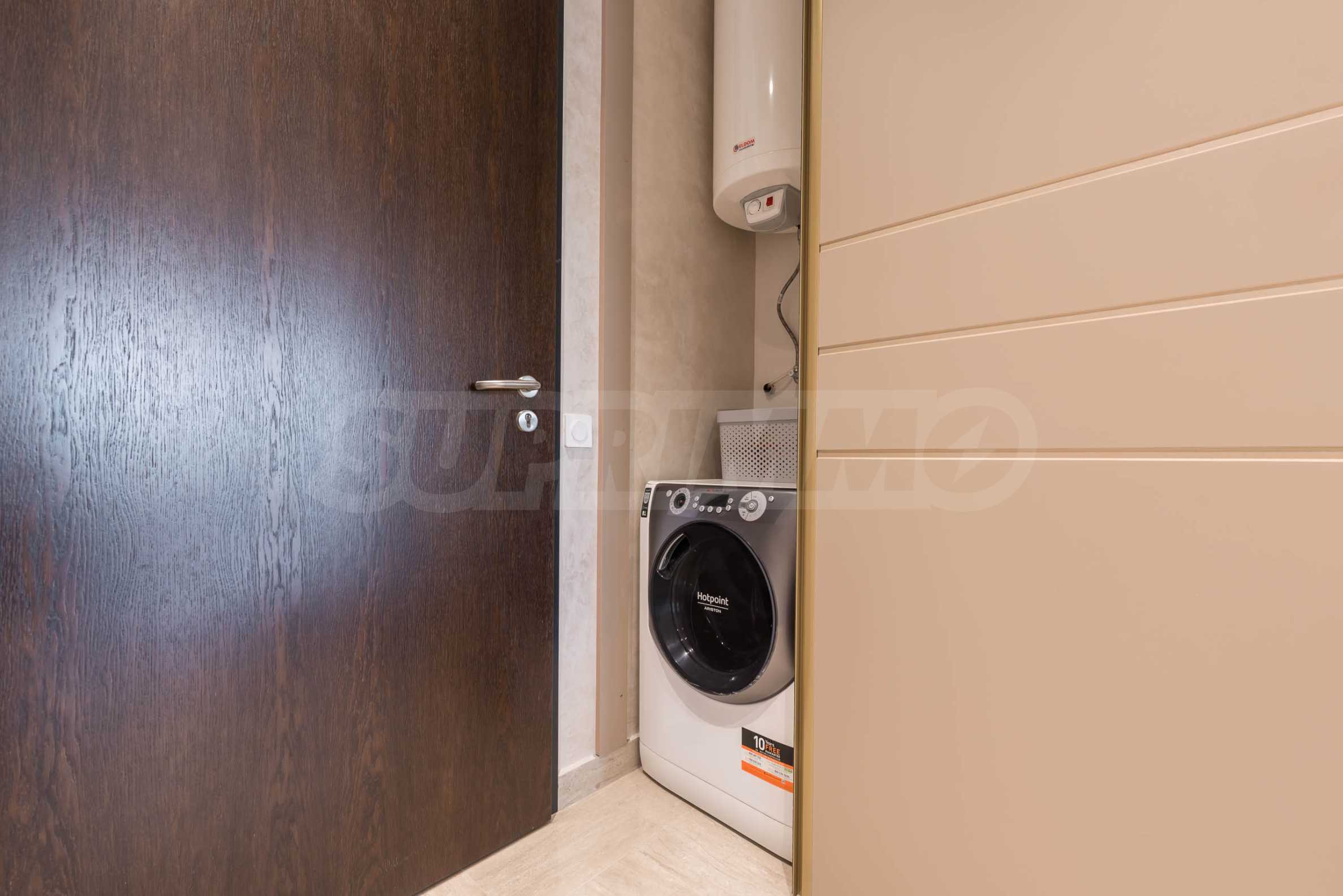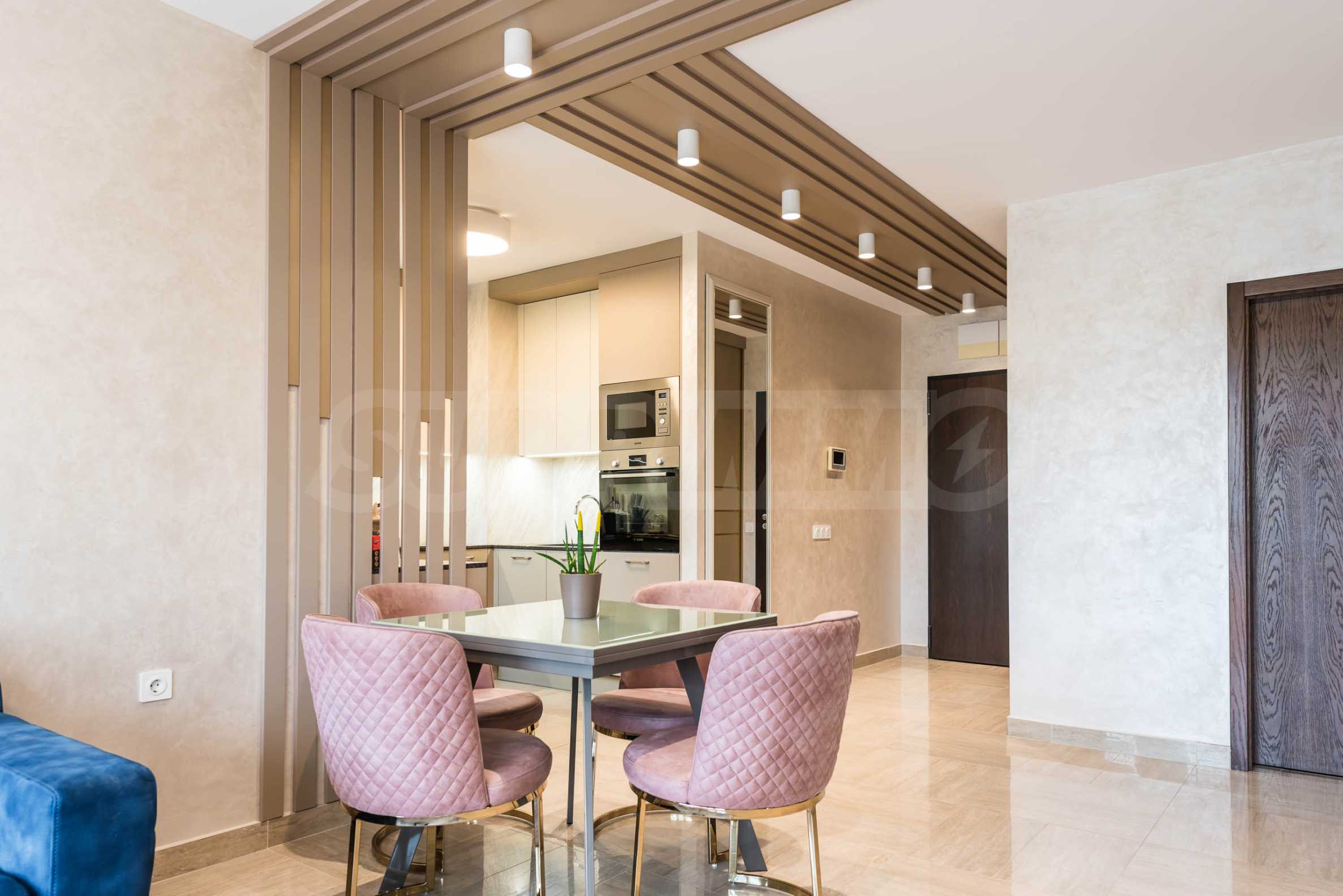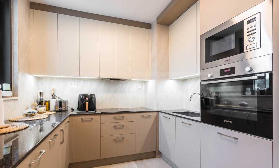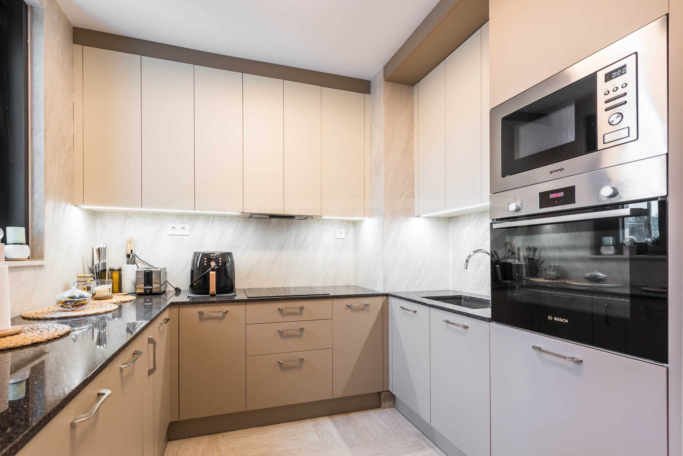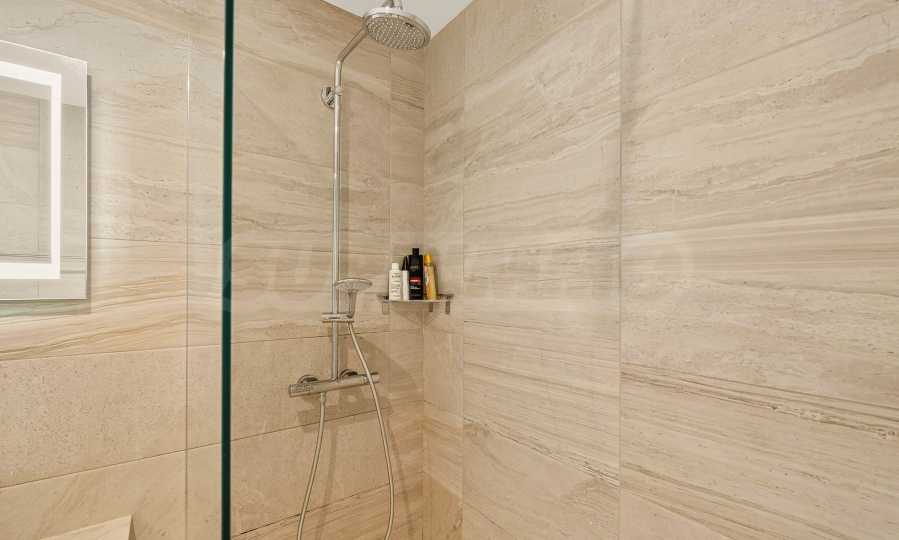 Die Wohnung besticht durch ein modernes Interieur, das mit Geschmack und Liebe zum Detail ausgewählt wurde. Die Einrichtung ist Designer, mit hochwertigen Möbeln und Geräten – alles, was Sie für einen komfortablen Alltag und eine wohlverdiente Erholung benötigen. Die Panoramafenster füllen das Haus mit Licht und schaffen ein Gefühl von Großzügigkeit und Leichtigkeit.
