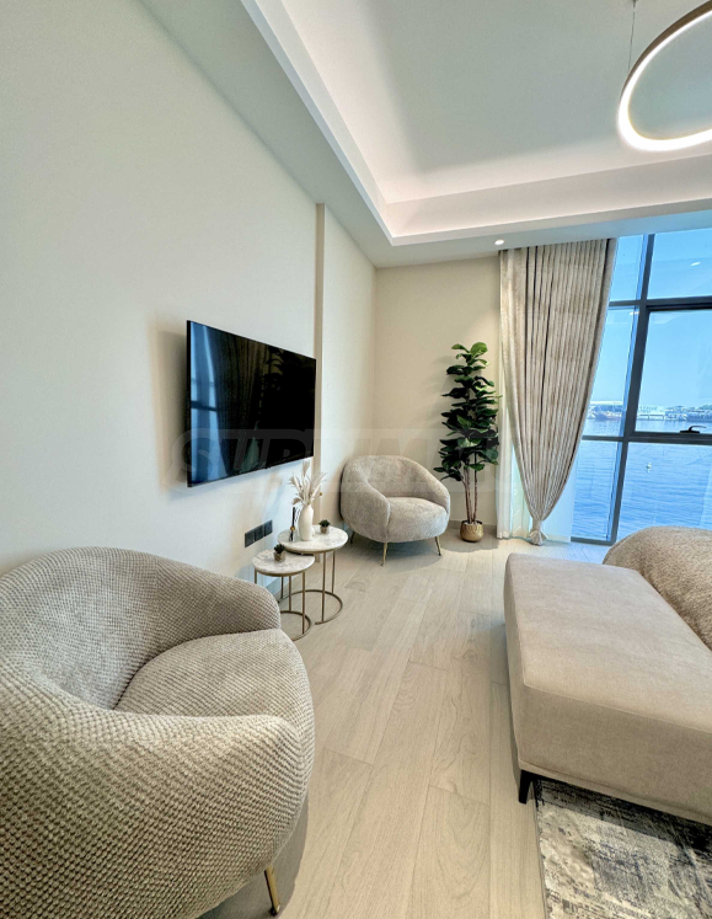 Die Ajman Creek Towers bestehen aus fünf Türmen mit moderner Architektur, die geschwungene Linien, helle Farben und Glas kombiniert, das die glitzernde Silhouette des Kanals widerspiegelt. Die Lobby der Gebäude empfängt Sie mit hohen Decken und Braun- und Beigetönen, die in perfekter Harmonie miteinander verschmelzen. Hier befinden sich die Rezeption sowie der Entspannungsbereich, ideal für Treffen mit Nachbarn und Freunden.