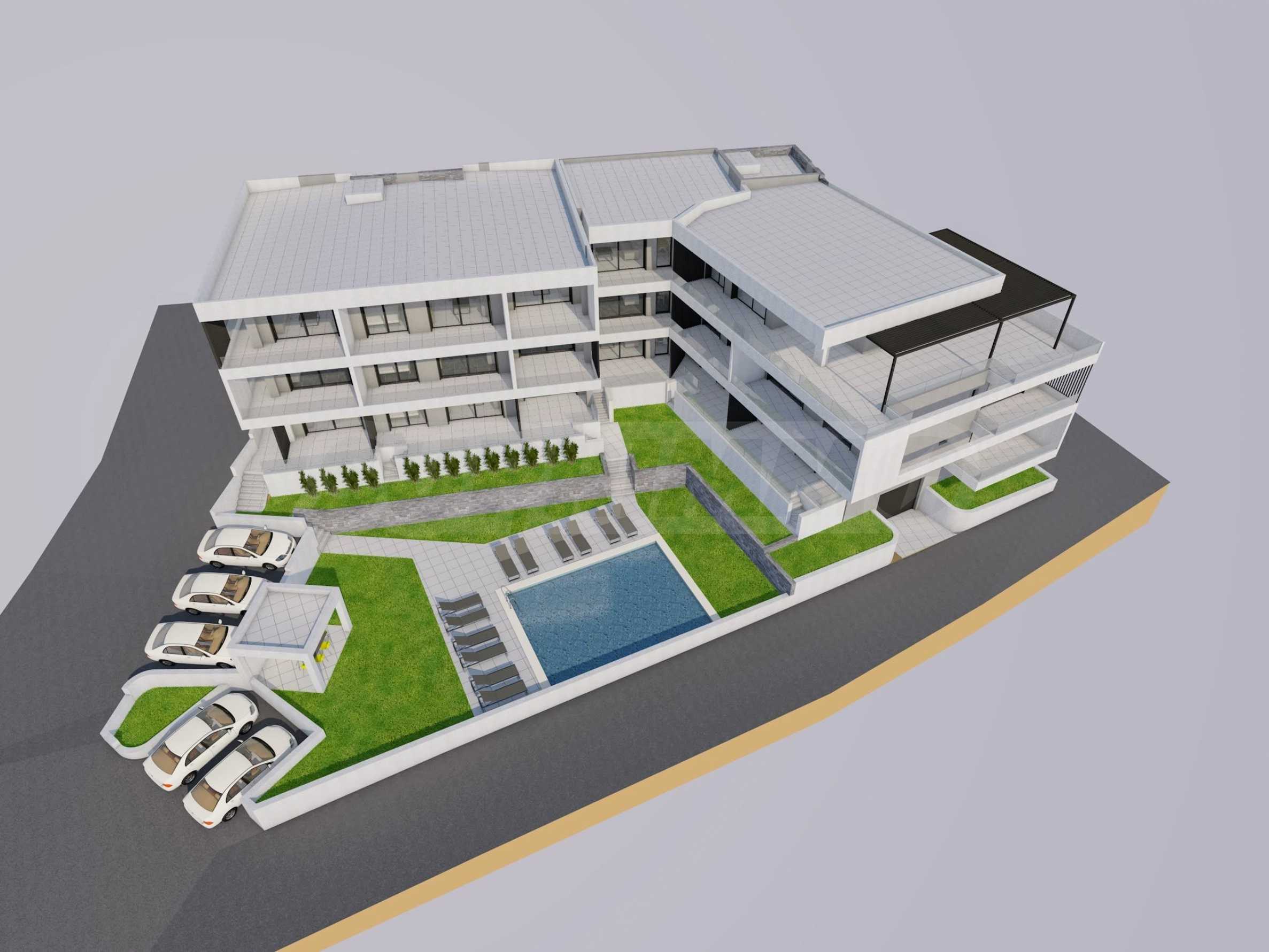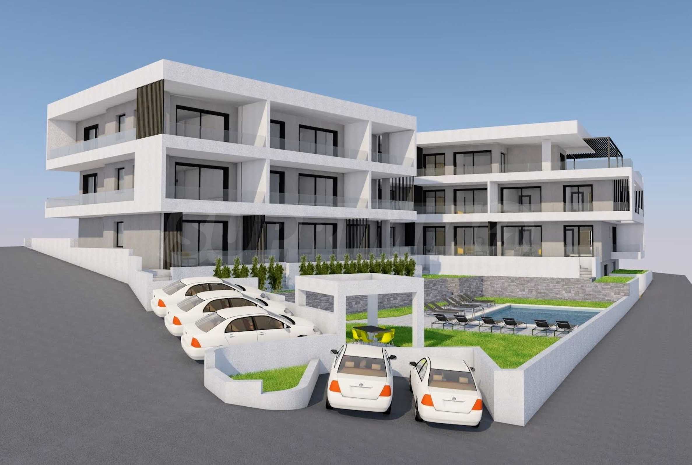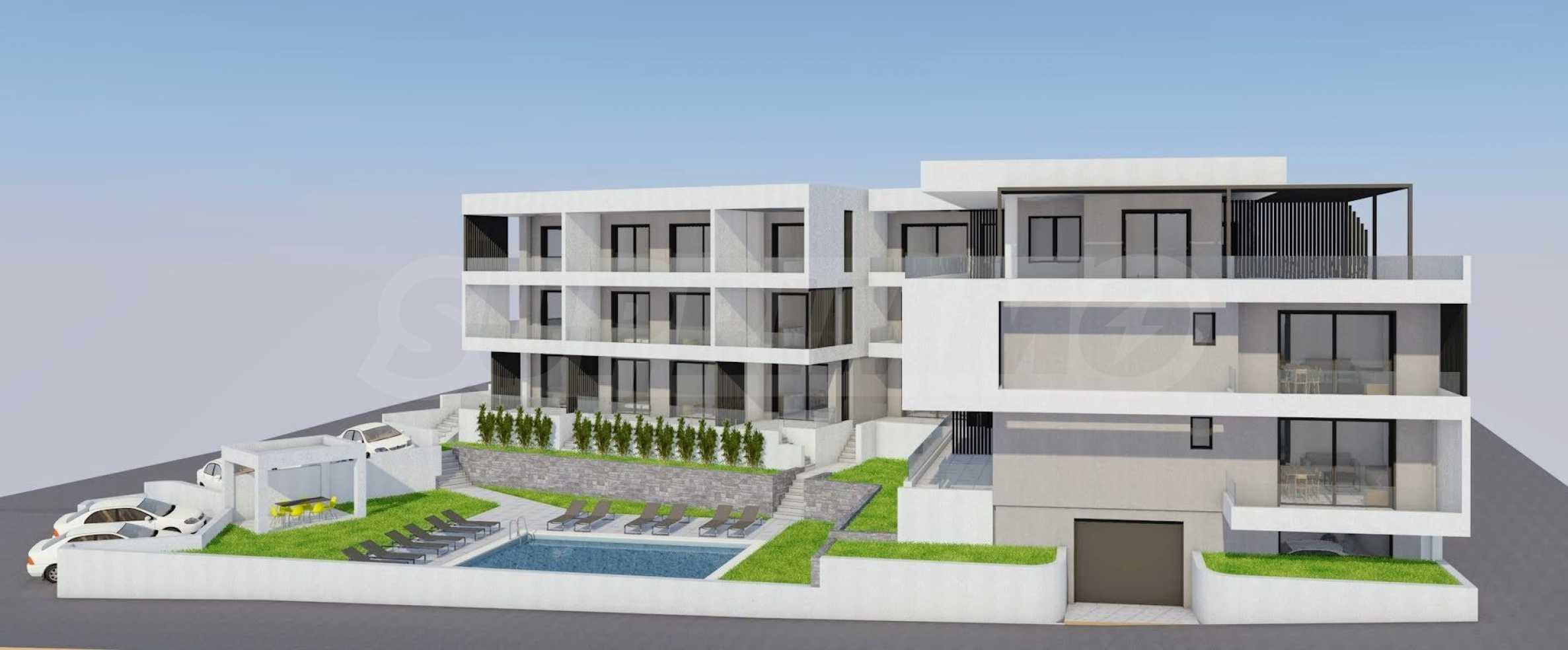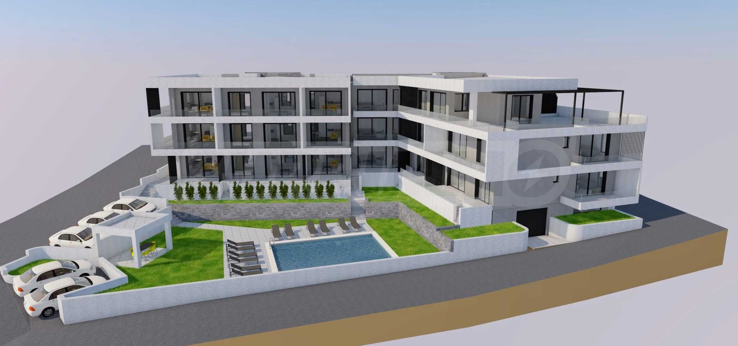 Der Komplex umfasst zwei dreistöckige Gebäude (K1 und K2) mit insgesamt 19 Wohnungen, zwei Aufzügen, einem 6 x 9 m großen Swimmingpool und einem ganzjährig nutzbaren Grillplatz. Es stehen eine Tiefgarage (Kaufmöglichkeit, 2 Plätze frei) sowie Parkplätze rund um das Gebäude zur Verfügung. Die Bauqualität ist kompromisslos, und die Instandhaltung wird auf hohem Niveau erfolgen, da die Eigentümer des Projekts Wohnungen in der Anlage besitzen werden.