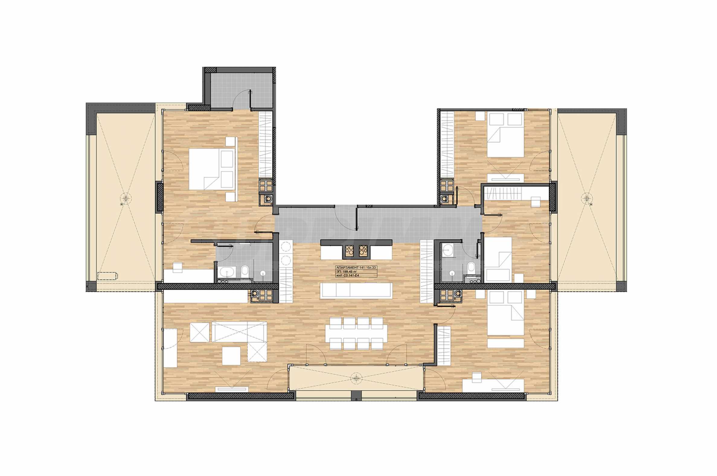 Die Wohnung befindet sich im 5. Obergeschoss und hat eine Gesamtfläche von 243,27 m², davon 199,48 m² Nettofläche. Die Ausrichtung ist Südosten, Nordwesten und Nordosten.