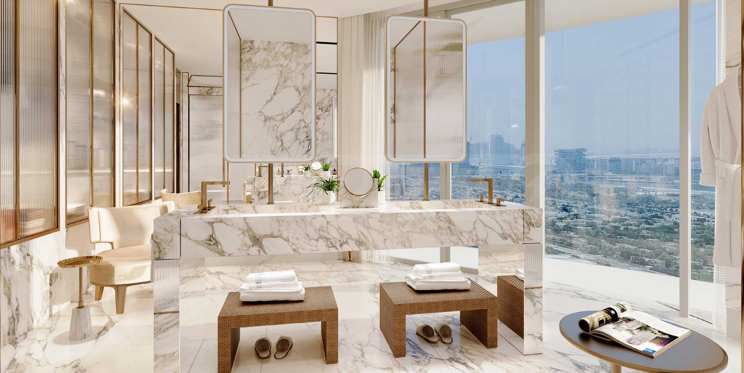 Die Küchen sind komplett möbliert und mit stilvollen Schränken und hochwertigen Geräten ausgestattet. Sie werden zum Lieblingsort für die Zubereitung Ihrer schnellen Snacks oder kulinarischen Meisterwerke. Auch die Badezimmer sind komplett ausgestattet. Marmor- und Goldelemente verleihen den Räumen ein elegantes, zeitloses Aussehen.