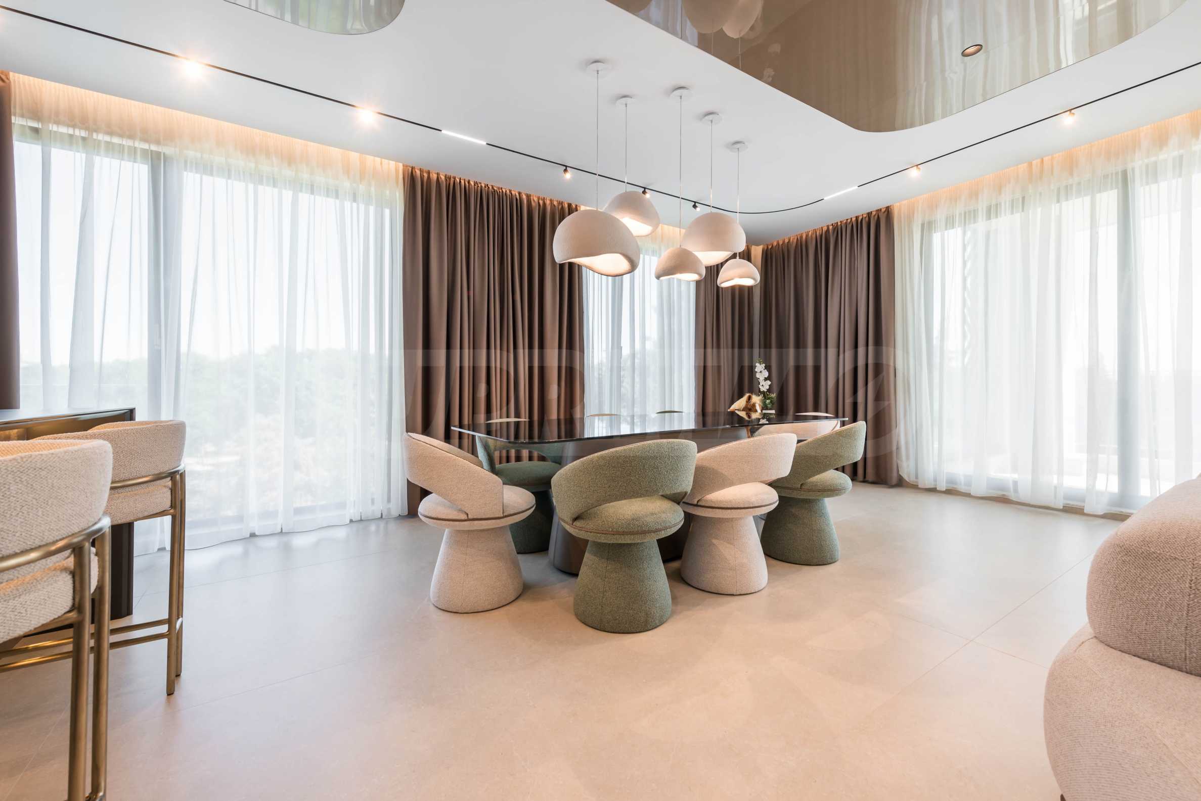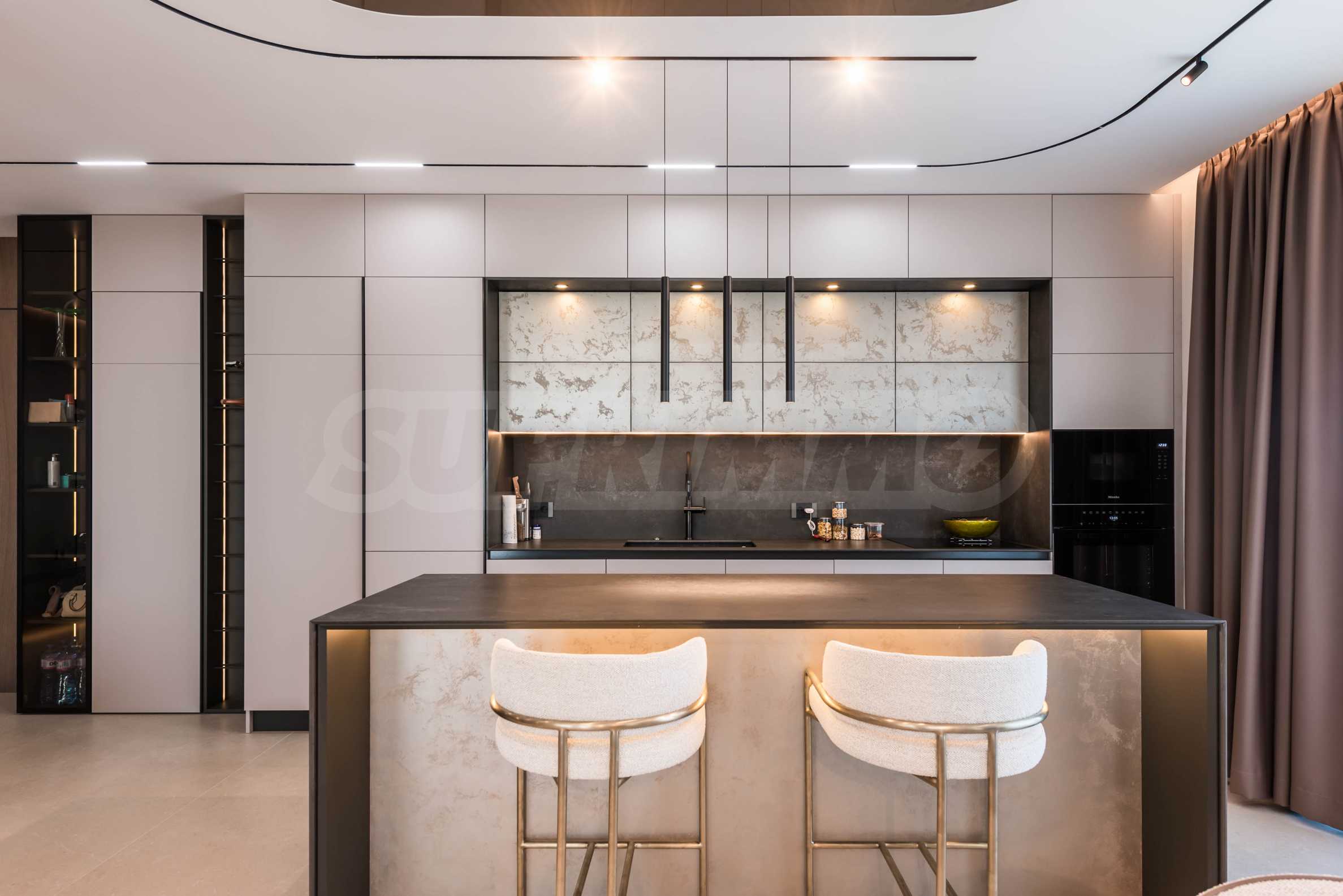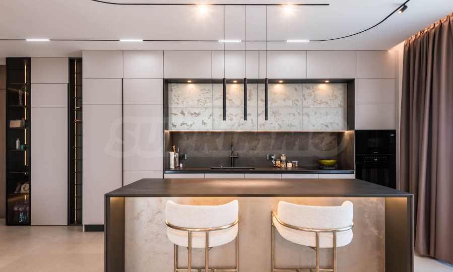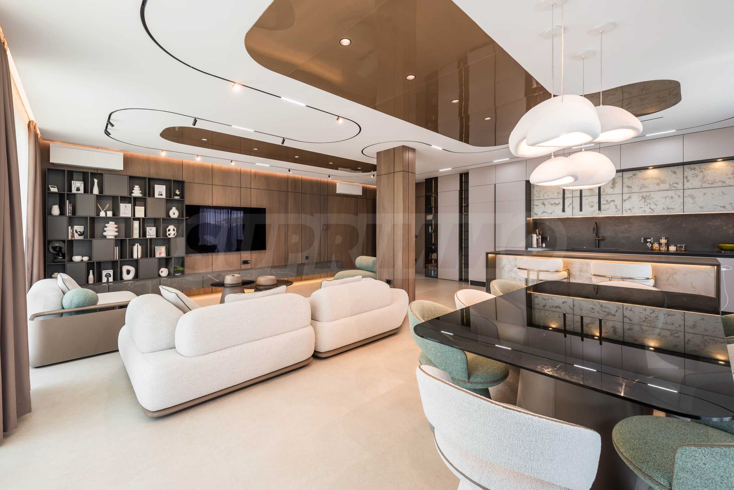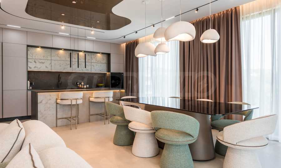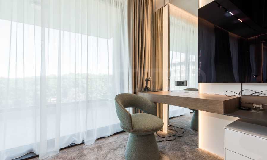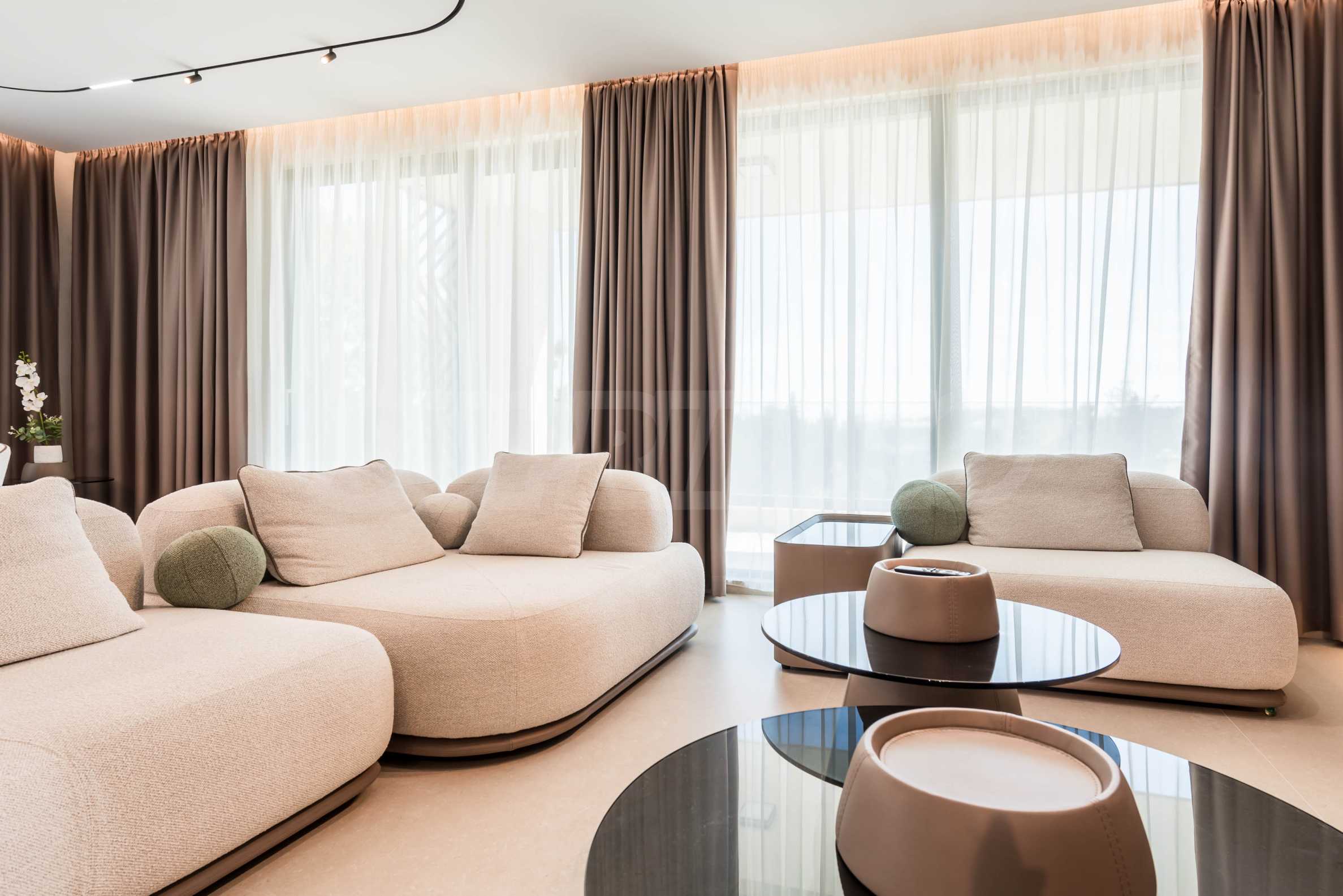 Das Innere der Immobilie strahlt moderne Eleganz und außergewöhnliche Liebe zum Detail aus. Das Apartment ist nach einem Designerprojekt luxuriös mit maßgefertigten italienischen Möbeln und hochwertigen Miele-Geräten eingerichtet. Im Wohnbereich beeindrucken ausgewählte Möbel mit organischen Formen – bequeme Sofas und Sessel, kombiniert mit niedrigen Tischen und einem stilvollen TV-Modul. Der Raum ist in sanften Erdtönen gestaltet und Akzente werden durch attraktive moderne Decken mit zeitgenössischer Beleuchtung gesetzt – eingebaute, lineare und Designer-Pendelleuchten, die die Bereiche hervorheben und der Immobilie Charakter verleihen. Die Schlafzimmer folgen dem gleichen Konzept – Erdtöne, Akzentbeleuchtung und Designerlösungen, die Komfort und Stil vereinen. Die Atmosphäre ist so durchdacht, dass sie Luxus und gleichzeitig Ruhe vermittelt.