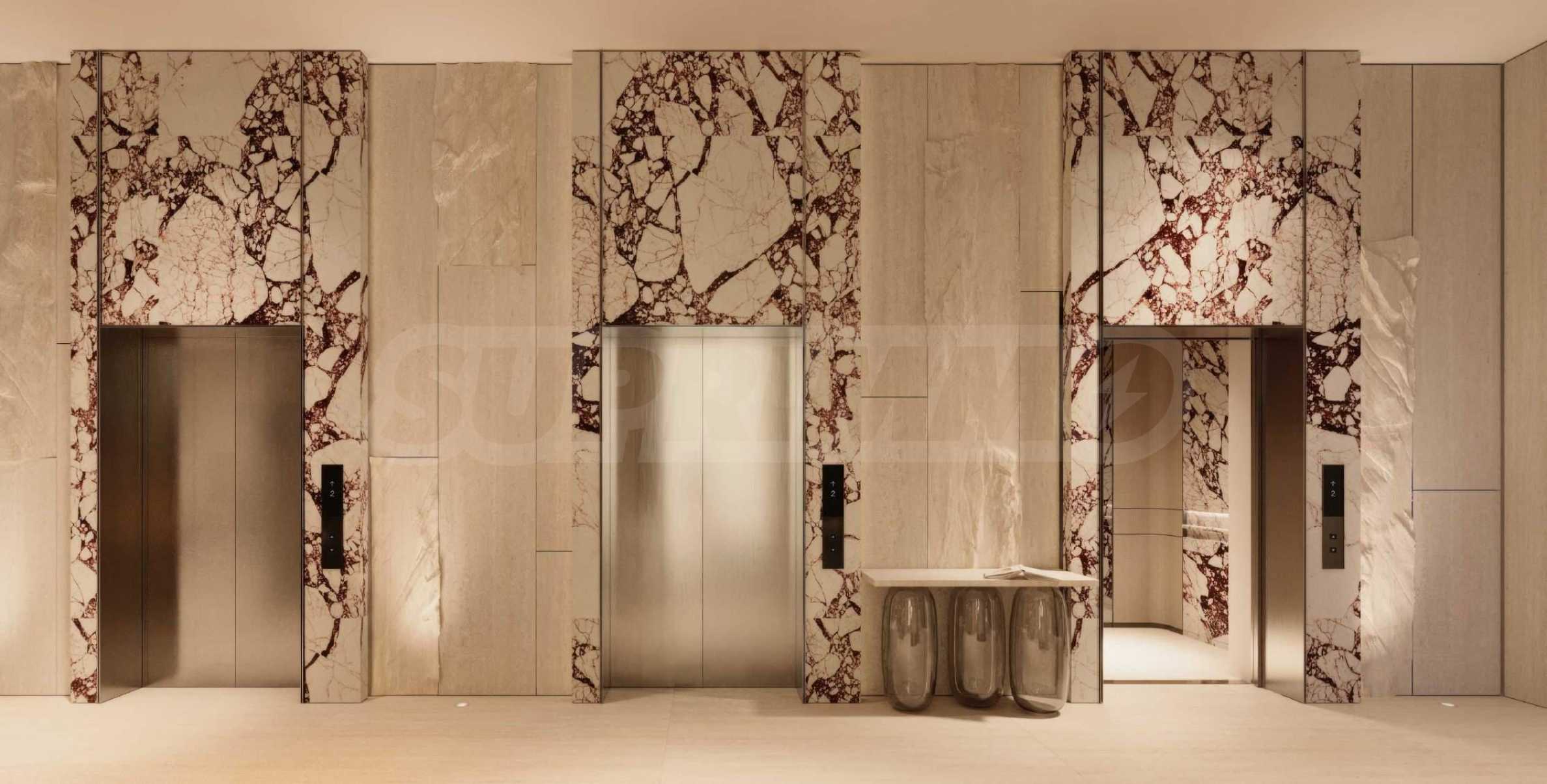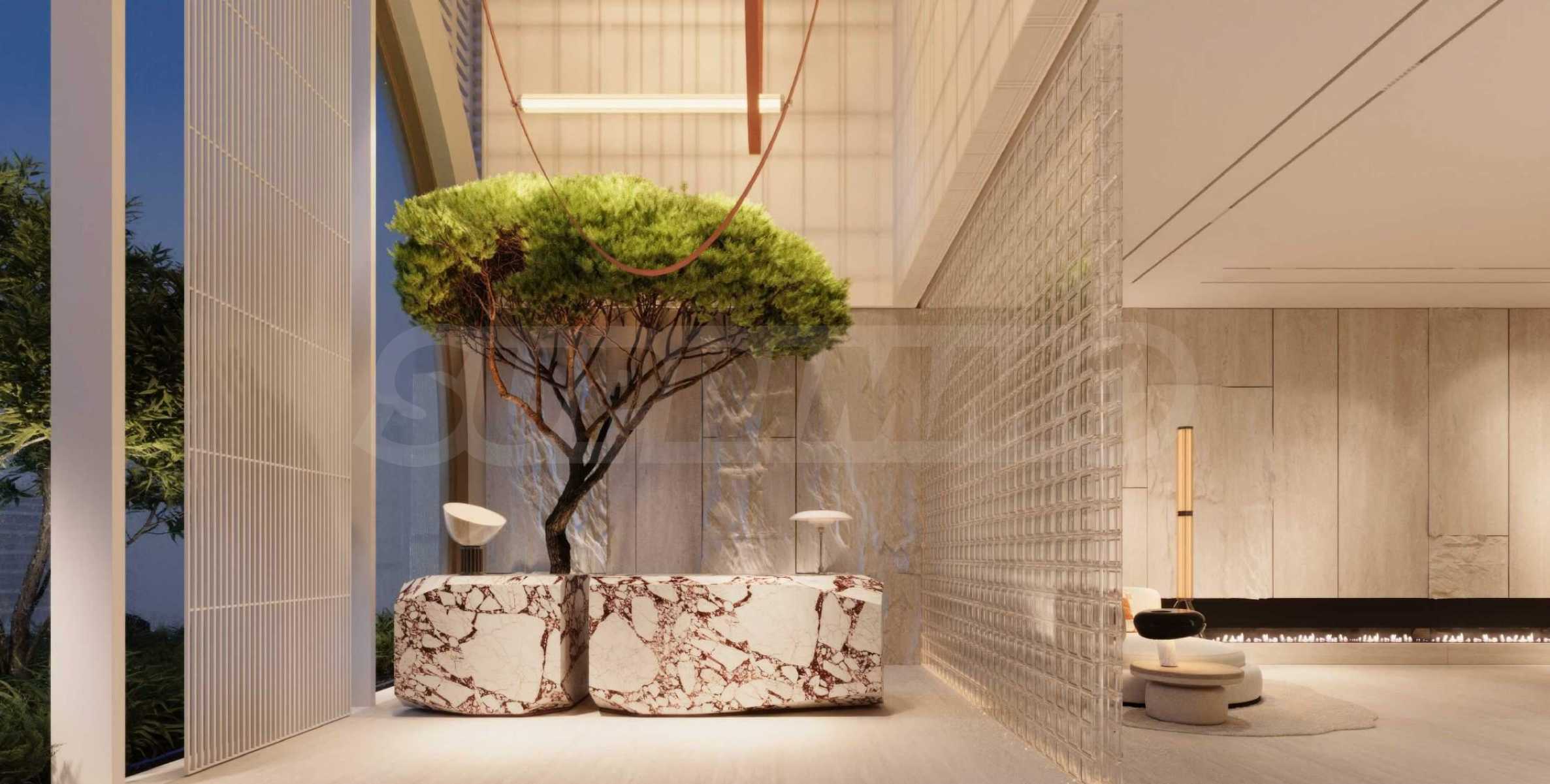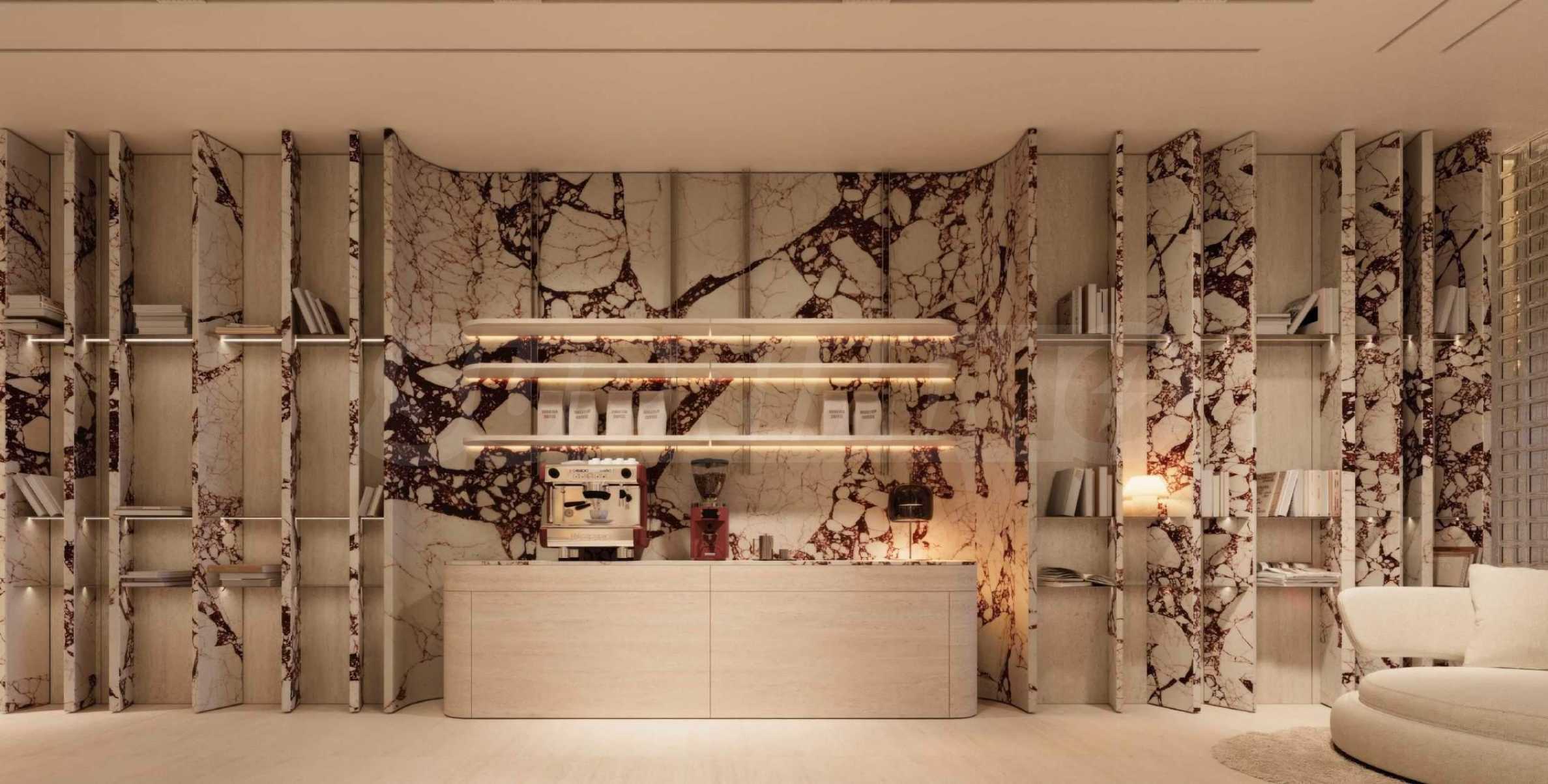 Die Lobby empfängt ihre Besucher mit außergewöhnlicher Großzügigkeit und einem beeindruckenden Interieur mit Cassina-Möbeln und Glaswänden der tschechischen Marke Lasvit. Auch bei der Gestaltung der Wände wurden Natursteinelemente verwendet, die nicht nur zum eleganten Gesamtbild beitragen, sondern auch eine natürliche Verbindung zur Natur schaffen. Gemütlichkeit und Komfort umgibt Sie in den Loungebereichen zum Entspannen und für Treffen mit Freunden und Nachbarn. Die Kaffeebar erwartet Sie täglich für einen energiegeladenen Start in den Tag.