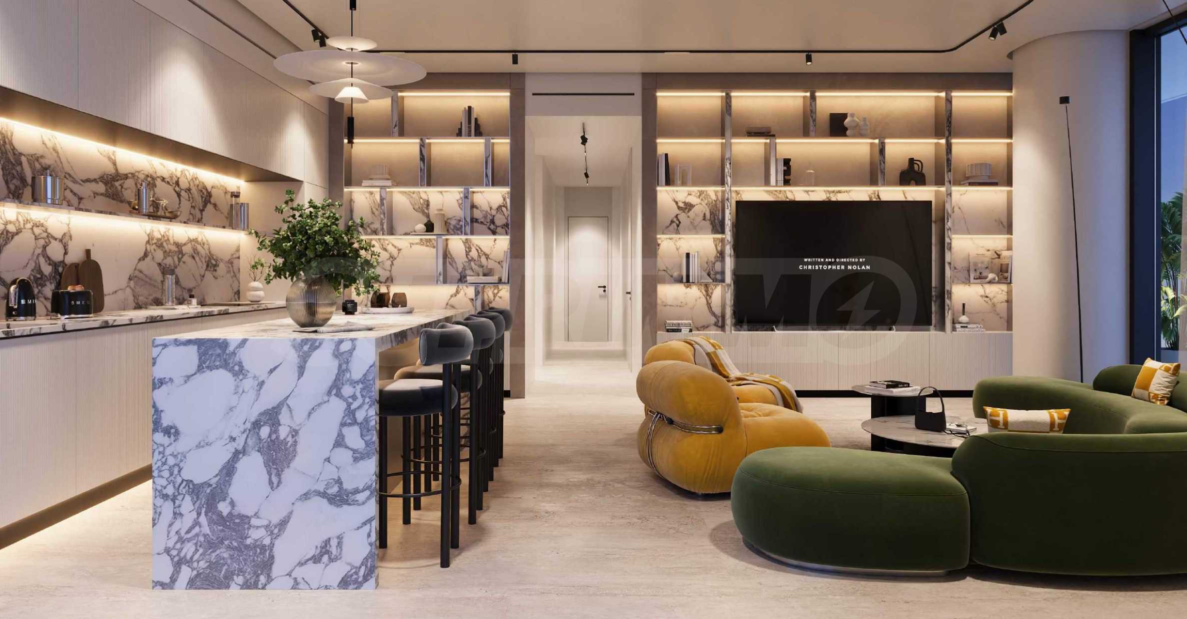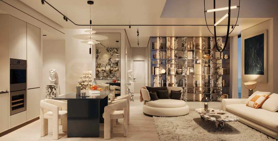 Die Küchen sind bis ins kleinste Detail durchdacht und laden zu kulinarischen Experimenten ein – sei es für ein anspruchsvolles Abendessen oder einen schnellen kulinarischen Genuss. Italienische Designerschränke und Arbeitsplatten aus Naturstein sorgen für zeitlosen Stil, während Hightech-Geräte für langlebige Funktionalität sorgen. Jeder Schrank ist mit intelligenter LED-Beleuchtung ausgestattet, und spezielle, nicht abfärbende Oberflächen sorgen für Perfektion in jedem Detail.