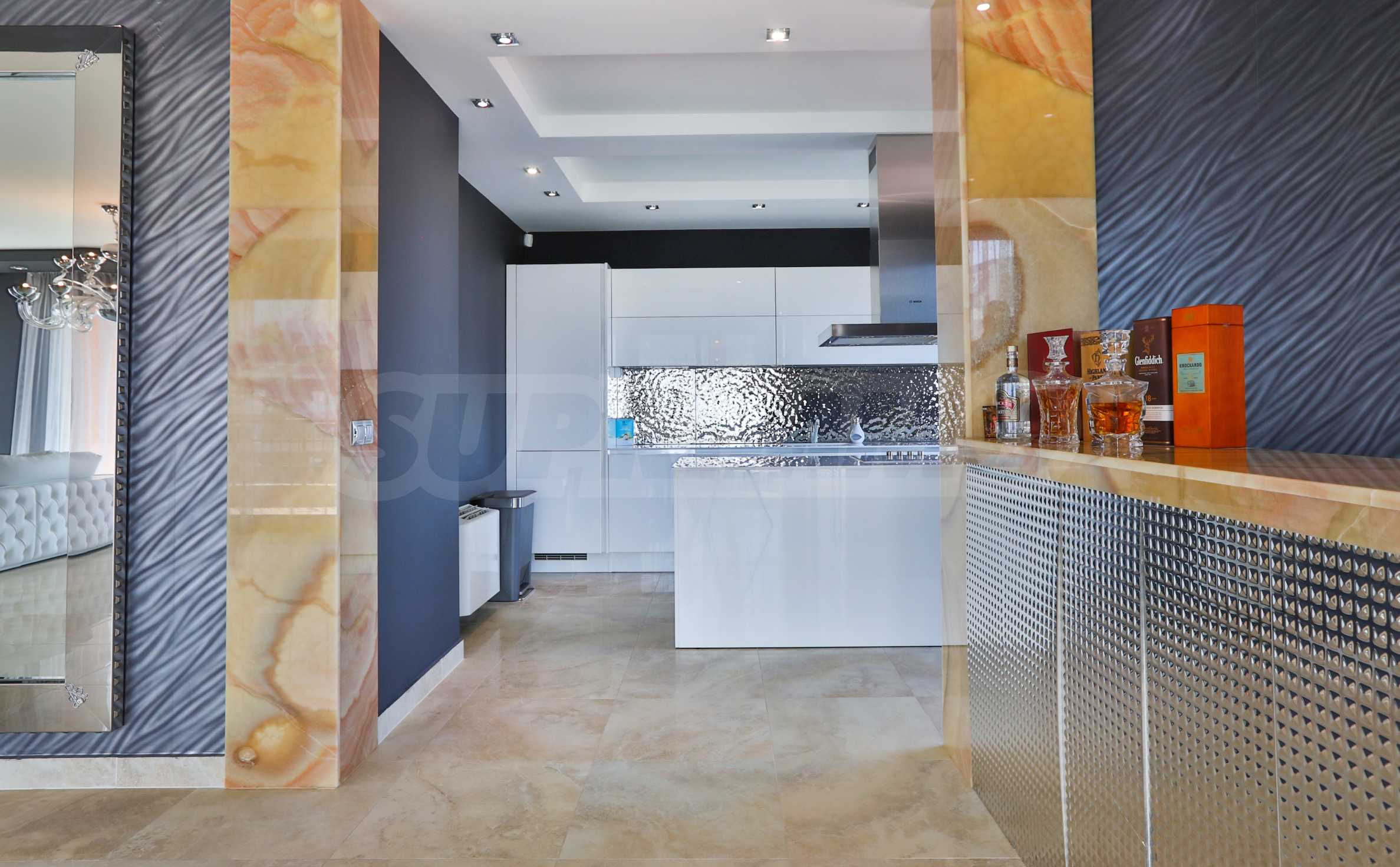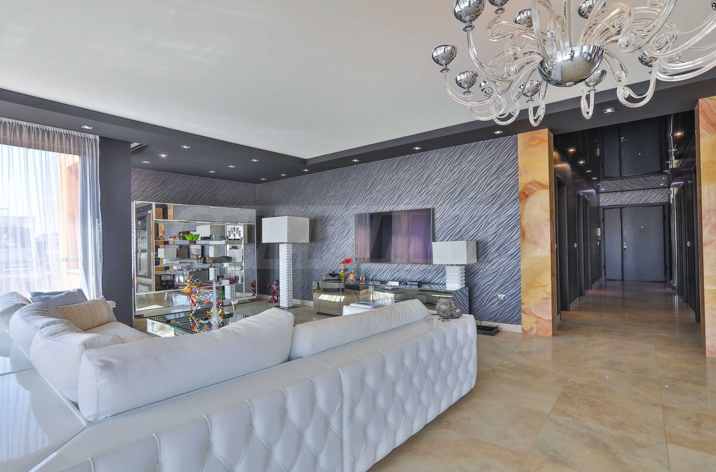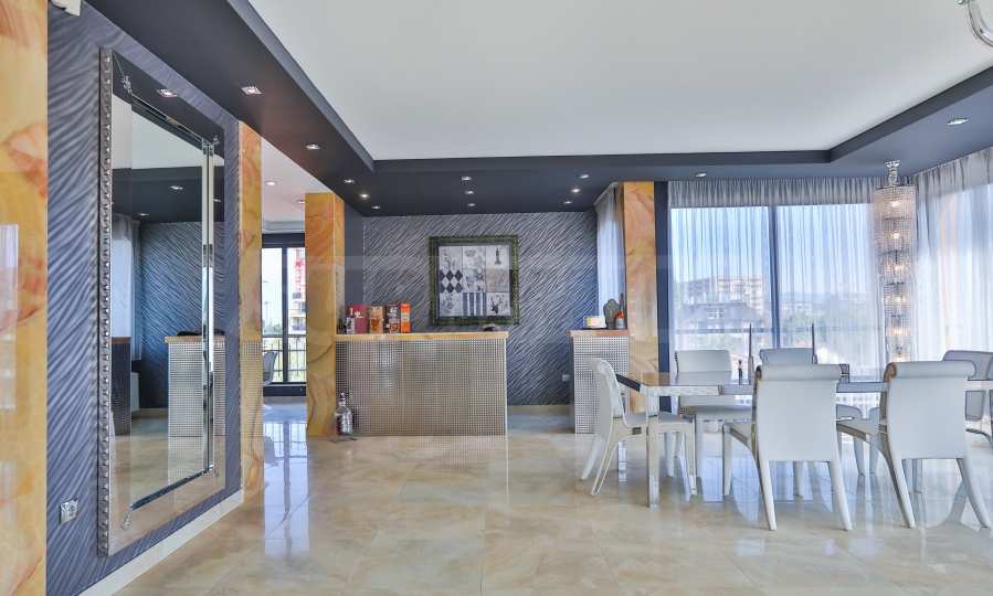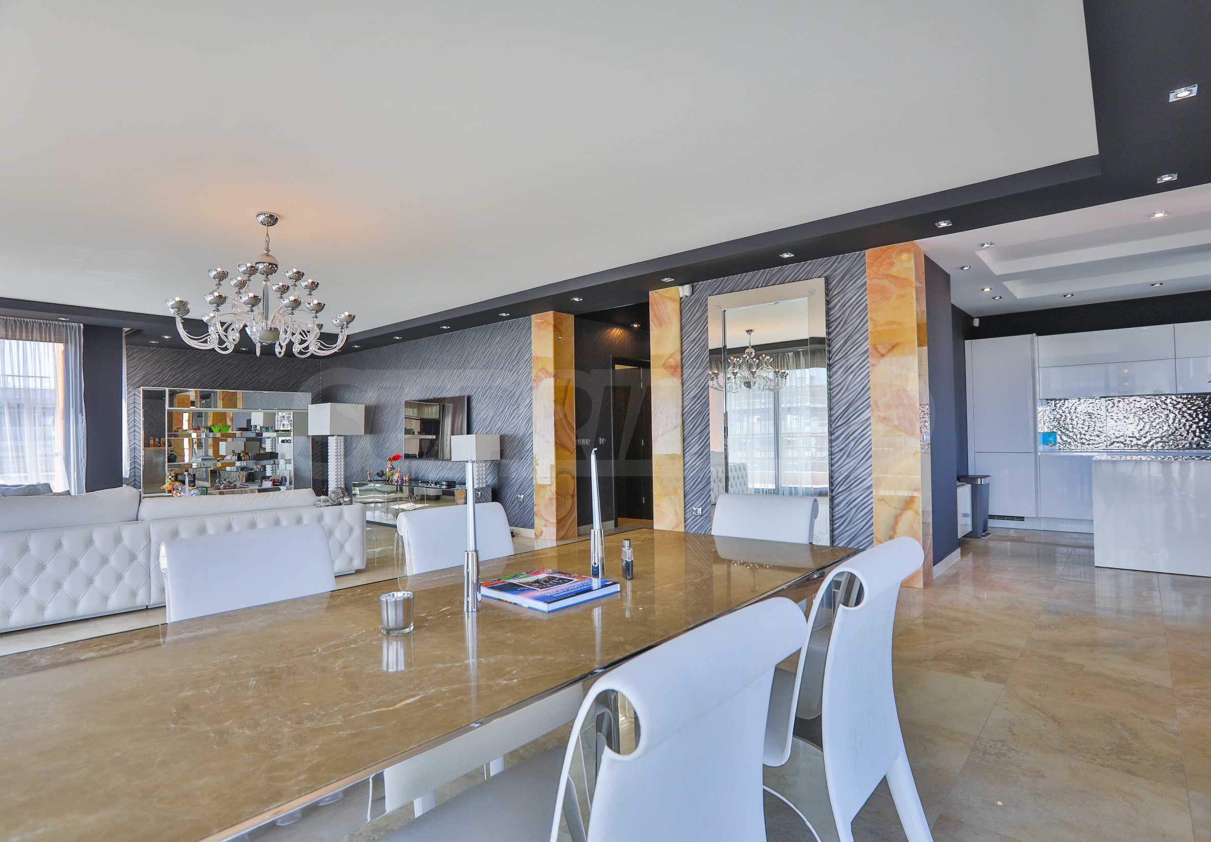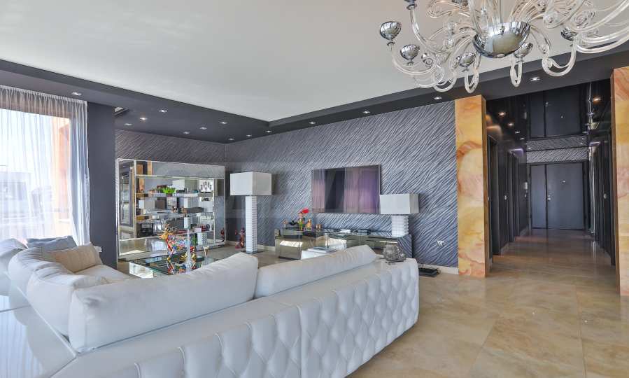 • Wohnzimmer: Das Wohnzimmer hat eine Fläche von 90 m², ist an drei Seiten komplett verglast und mit italienischen Elitemarken im Designbereich eingerichtet. Im Esszimmer beeindruckt besonders der Tisch mit Marmorplatte, dessen Farbe sich in den Granitfliesen des Bodens wiederholt. Die polierte Oberfläche des Bodens erzeugt ein Gefühl von Luxus, ergänzt durch die Kristallleuchten, den riesigen Spiegel an einer der Wände und die Onyxverkleidung, die die Bar, den Eingang zur Küche und den Flur einrahmt. Der Eingang zur Küche und die Bar sind mit Onyx gefliest. Der große Spiegel von IPE CAVALLI – VISIONNAIRE verdoppelt Licht und Raum in diesem Teil der Wohnung. Das mit weißem Leder gepolsterte Ecksofa bildet eine gemütliche Ecke für Gespräche und Entspannung im Wohnzimmer. Alle Möbel und die beiden Lampen im Sitzbereich sind von IPE CAVALLI – VISIONNAIRE. Ein niedriger Fernsehschrank aus Edelstahl mit dem VISIONNAIRE-Logo und eine TETI-Lampe aus weißer Keramik derselben Marke. Die Tapeten der ALEXANDRA COLLECTION verleihen dem Interieur Dynamik. Alle Möbel stammen von VISIONNAIRE.