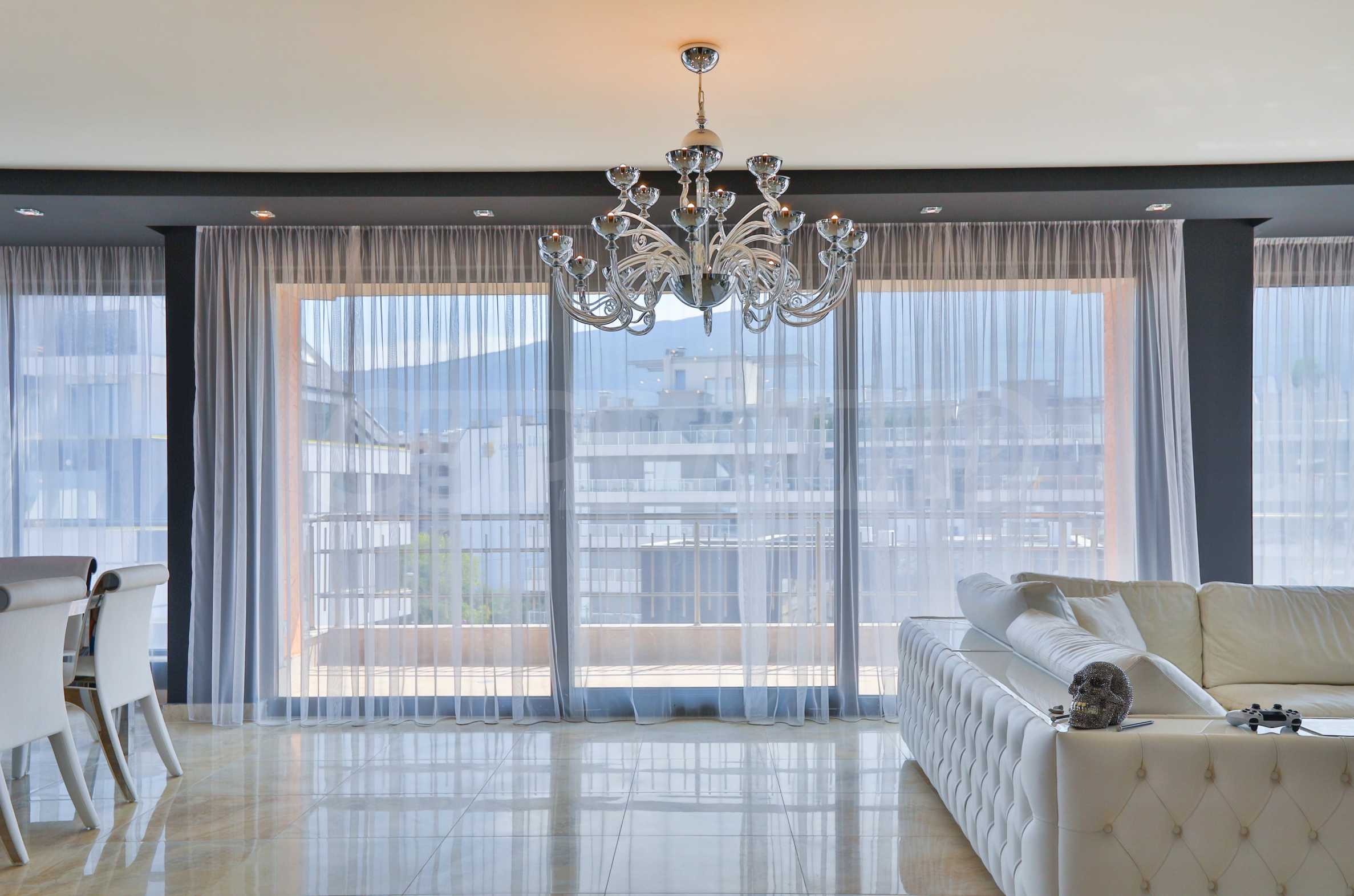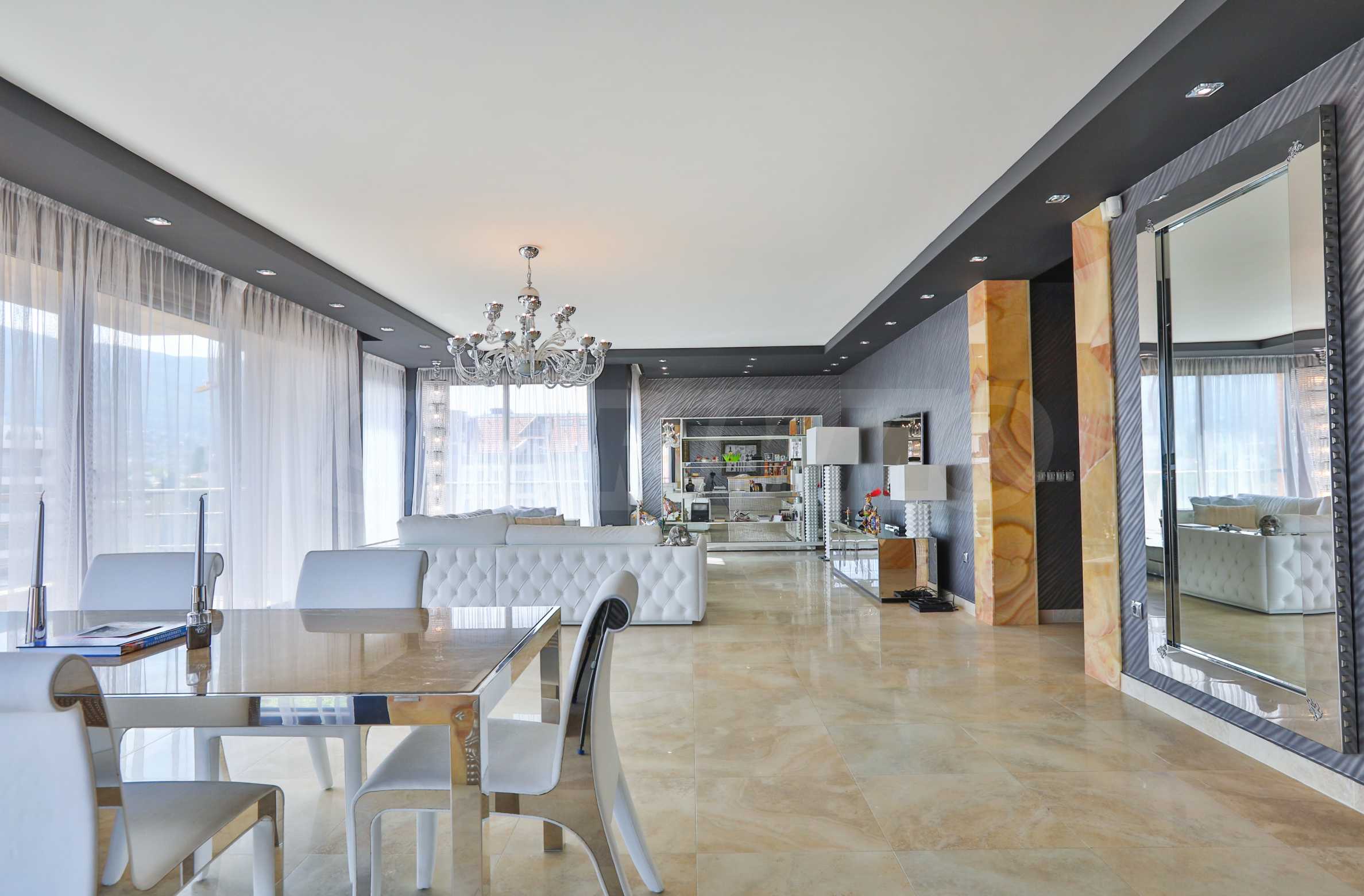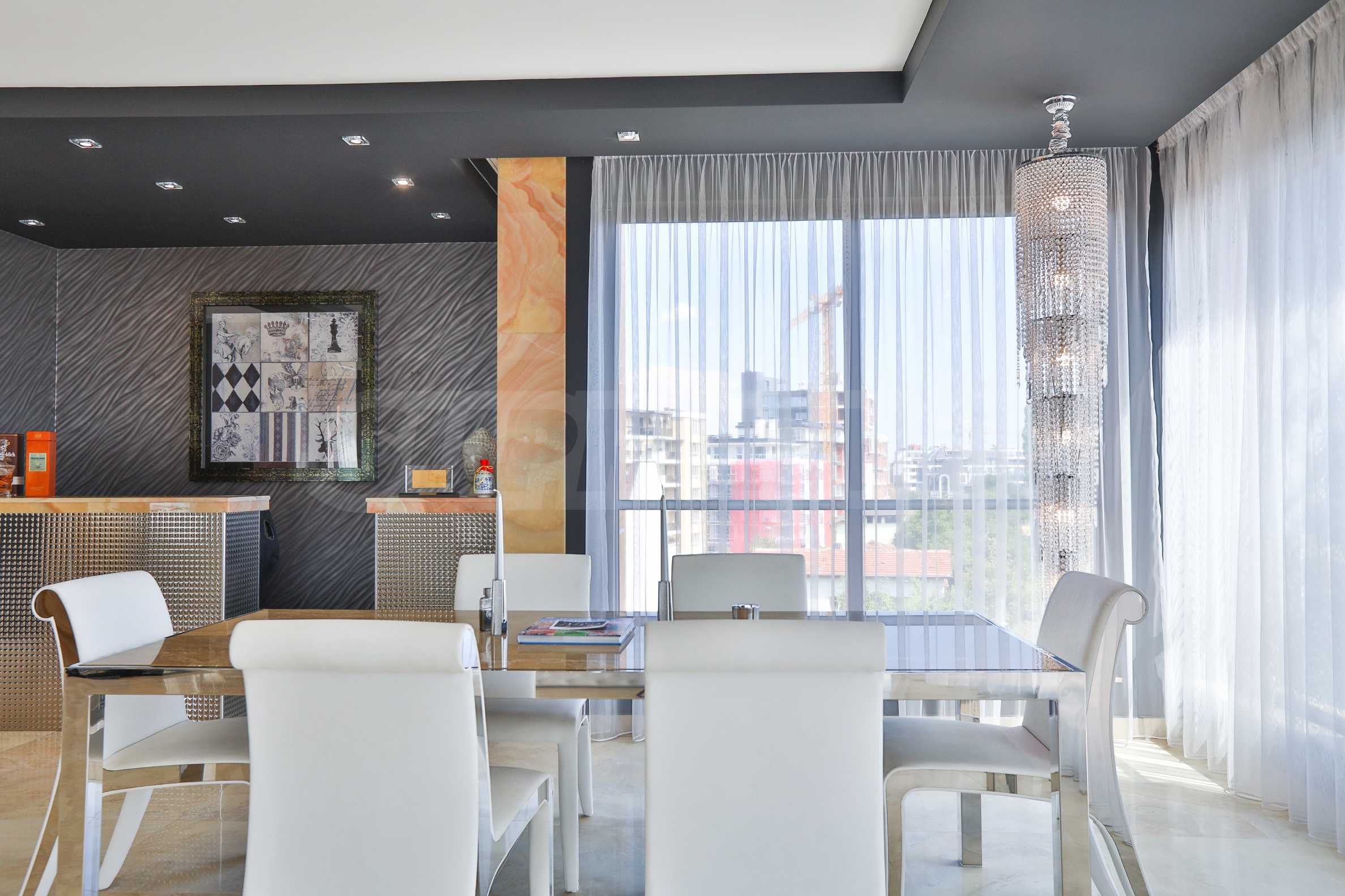 • Wohnzimmer: Das Wohnzimmer hat eine Fläche von 90 m², ist an drei Seiten komplett verglast und mit italienischen Elitemarken im Designbereich eingerichtet. Im Esszimmer beeindruckt besonders der Tisch mit Marmorplatte, dessen Farbe sich in den Granitfliesen des Bodens wiederholt. Die polierte Oberfläche des Bodens erzeugt ein Gefühl von Luxus, ergänzt durch die Kristallleuchten, den riesigen Spiegel an einer der Wände und die Onyxverkleidung, die die Bar, den Eingang zur Küche und den Flur einrahmt. Der Eingang zur Küche und die Bar sind mit Onyx gefliest. Der große Spiegel von IPE CAVALLI – VISIONNAIRE verdoppelt Licht und Raum in diesem Teil der Wohnung. Das mit weißem Leder gepolsterte Ecksofa bildet eine gemütliche Ecke für Gespräche und Entspannung im Wohnzimmer. Alle Möbel und die beiden Lampen im Sitzbereich sind von IPE CAVALLI – VISIONNAIRE. Ein niedriger Fernsehschrank aus Edelstahl mit dem VISIONNAIRE-Logo und eine TETI-Lampe aus weißer Keramik derselben Marke. Die Tapeten der ALEXANDRA COLLECTION verleihen dem Interieur Dynamik. Alle Möbel stammen von VISIONNAIRE.