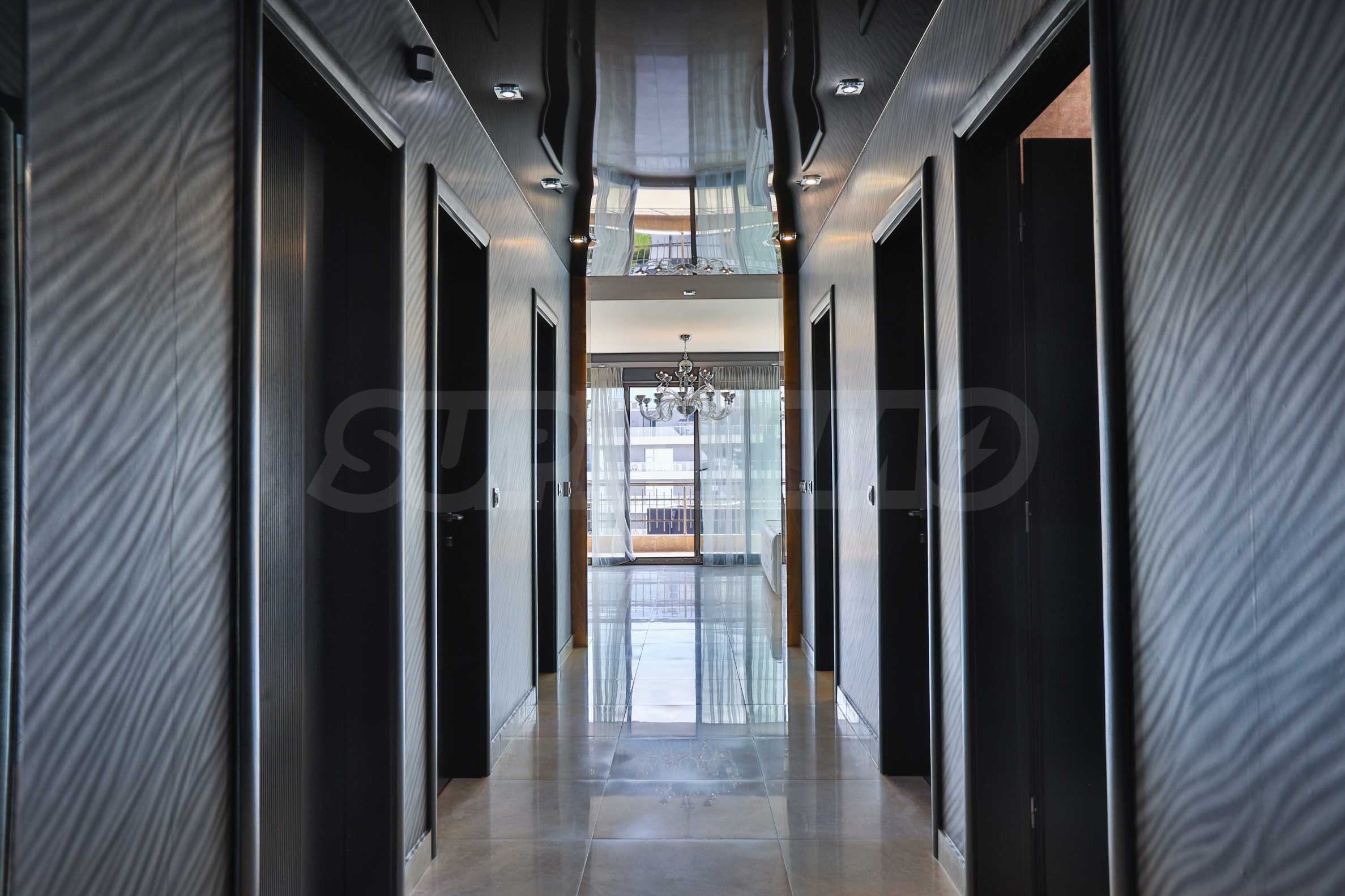 • Eingangshalle: Es gibt keine Eingangshalle im herkömmlichen Sinne. Wir sehen keine Garderobenständer oder Schuhschränke, sondern glänzende dunkle Oberflächen, die den Blick zum Licht am Ende des Flurs lenken, wo ein Kristallleuchter die Aufmerksamkeit auf sich zieht. Dieser Effekt wird durch eine abgehängte, schwarze Barisol-Spiegeldecke erzielt, die dem Raum eine bemerkenswerte Tiefe verleiht.