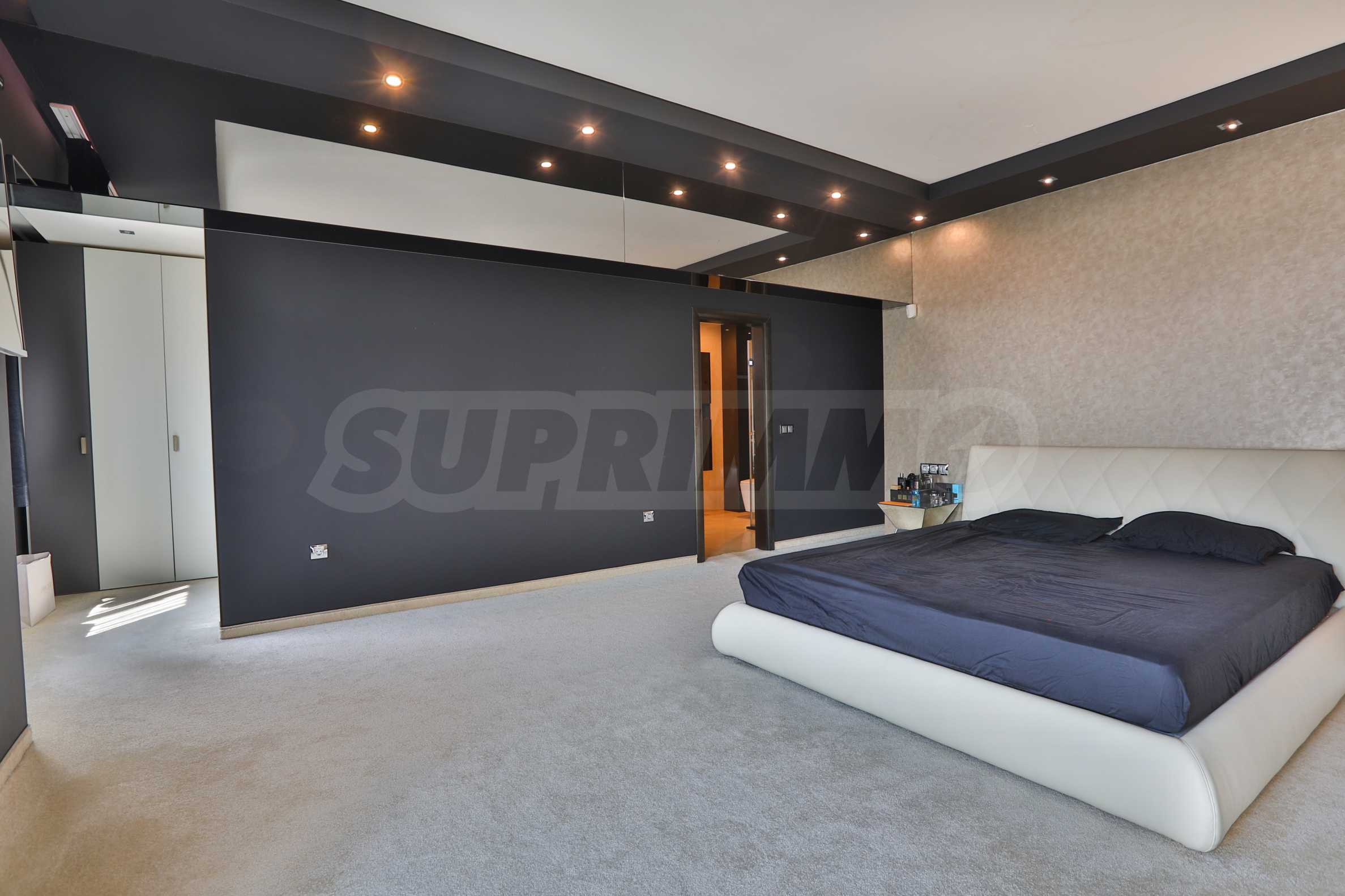 • Schlafzimmer: Das Schlafzimmer ist im gleichen Stil eingerichtet und verfügt über ein mit weißem Leder gestepptes Bett, verspiegelte Nachttische von EICHHOLTZ, eine Bettdecke und Kissen aus Seidenplüsch mit SWAROVSKI-Kristallen von VISIONNAIRE.