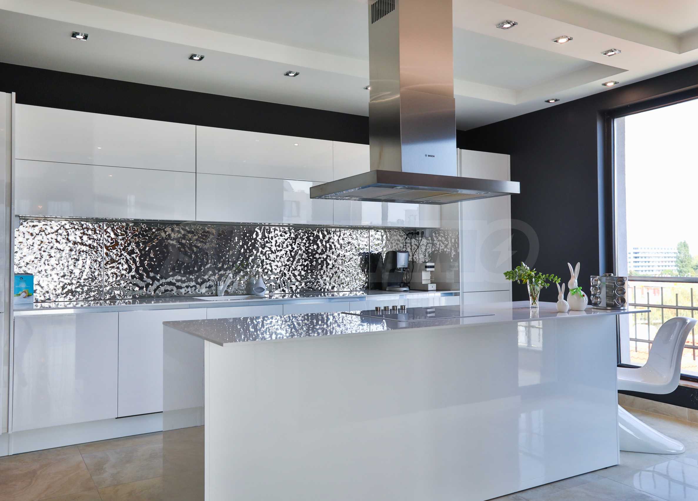 • Küche: Die Küche ist von ASTER mit weiß lackierten Schränken, die einen Kontrast zu den schwarzen Wänden bilden. Interessant ist die geprägte Oberfläche des Chrommetalls zwischen den beiden Schrankreihen. Im Vordergrund – der ikonische PANTON CHAIR.