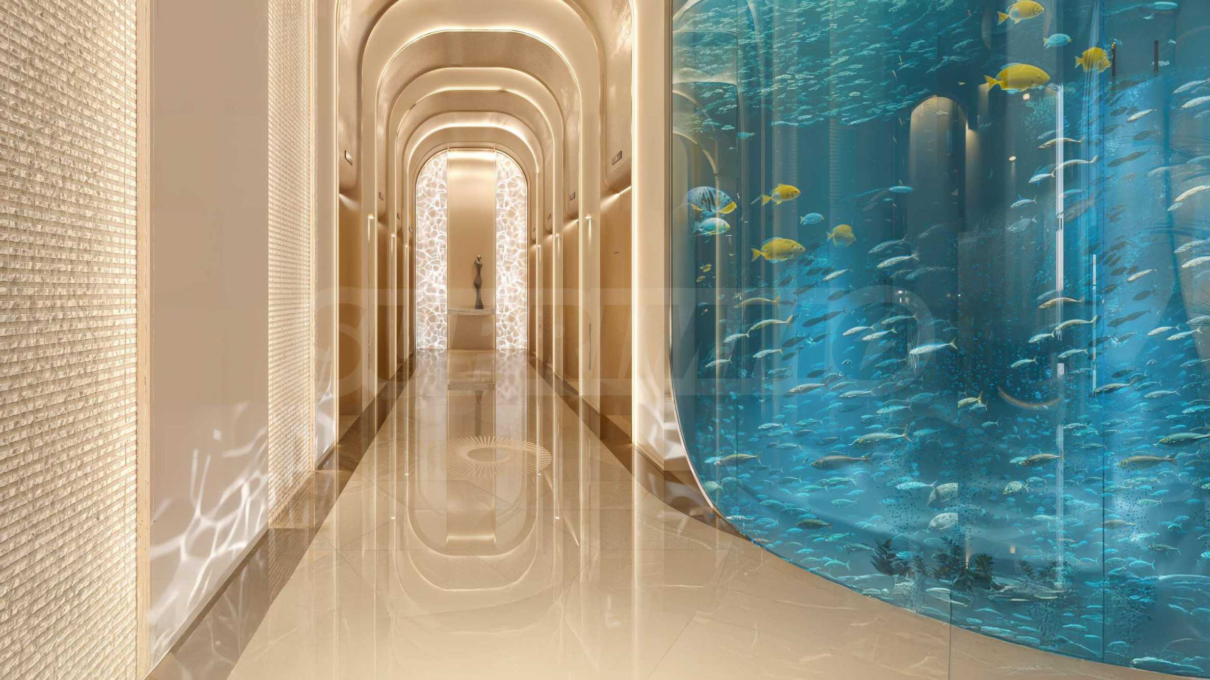 Schon beim Betreten der Lobby des Breez by Danube spürt man den Geist kompromisslosen Luxus. Die Großzügigkeit mit doppelter Deckenhöhe erzeugt ein Gefühl von Weite, und die vom Meer inspirierte Wasserinstallation, die von der Decke zum zentralen Brunnen herabfließt, strahlt Ruhe und Harmonie aus. Die Rezeption gleicht einem skulpturalen Kunstwerk, die Beleuchtung erinnert an Installationen zeitgenössischer Kunst, und die Entspannungsbereiche laden zu einer kurzen Pause oder einem Treffen mit Freunden ein. Das unbestrittene Highlight ist das beeindruckende, 140 Quadratmeter große und fast sechs Meter hohe Aquarium – ein lebendiges Bild, das dem Raum eine einzigartige Note verleiht.