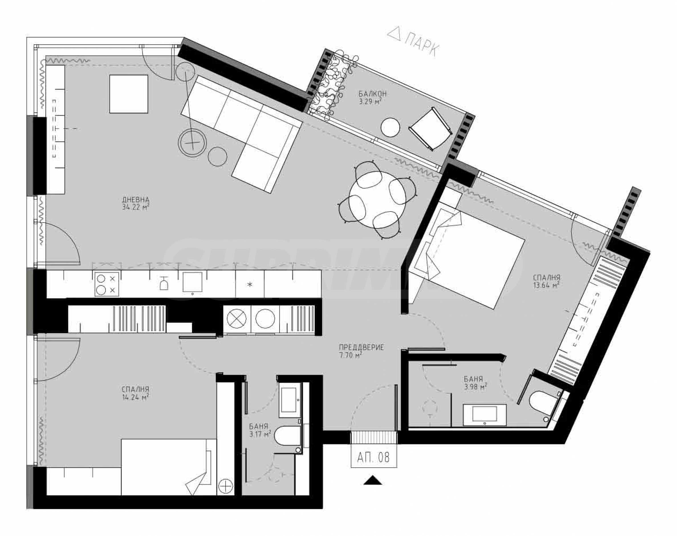 Die Wohnung verfügt über eine funktionale Raumaufteilung und umfasst: ein geräumiges Wohnzimmer mit Küchenzeile (34,22 m²), zwei Schlafzimmer mit einer Fläche von 14,24 m² und 13,64 m², ein Badezimmer mit Toilette zu einem Schlafzimmer (3,98 m²), ein zweites Badezimmer mit Toilette (3,17 m²), einen Flur (7,70 m²) und einen Balkon (3,29 m²). Die Ausrichtung ist Nordost/Nordwest, die Heizung erfolgt mit Gas.