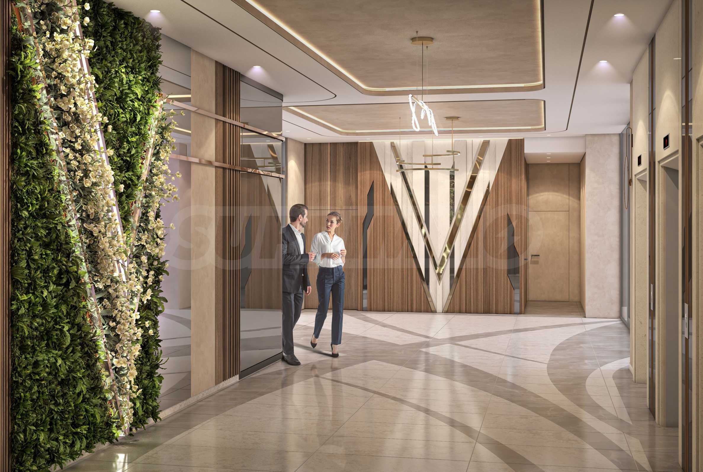 Synerga erwartet Sie mit geräumigen Lobbys und Fluren mit Granit- und Natursteinböden, die nach einem Innendesign gestaltet sind. Dekorative Beleuchtung betont die architektonischen Linien und sorgt bereits am Eingang für Eleganz. Für eine sichere, komfortable und stilvolle Fortbewegung in allen Bereichen des Gebäudes sorgen drei schnelle, geräuscharme und zuverlässige Aufzüge, die alle Ebenen schnell und bequem erreichen.