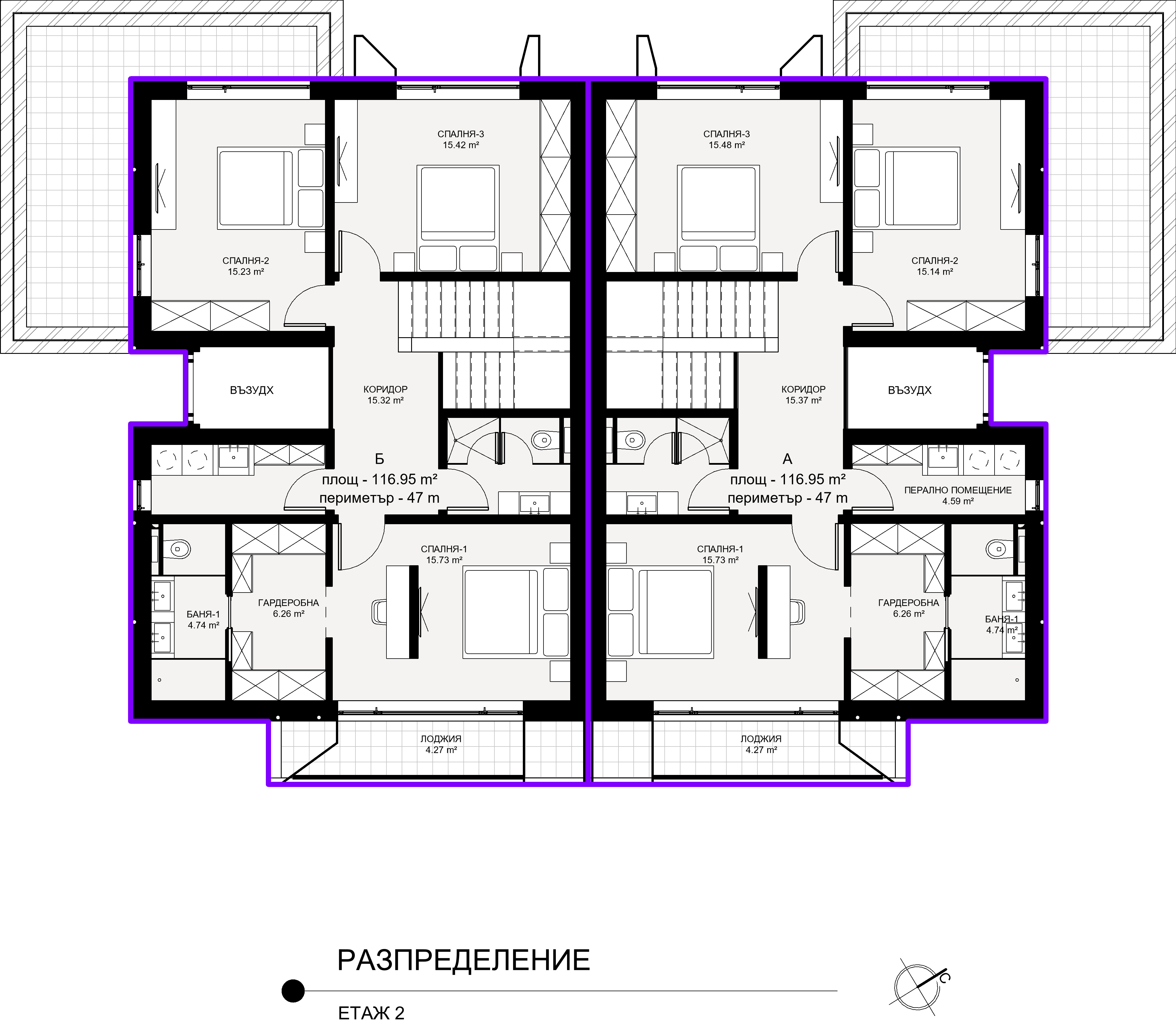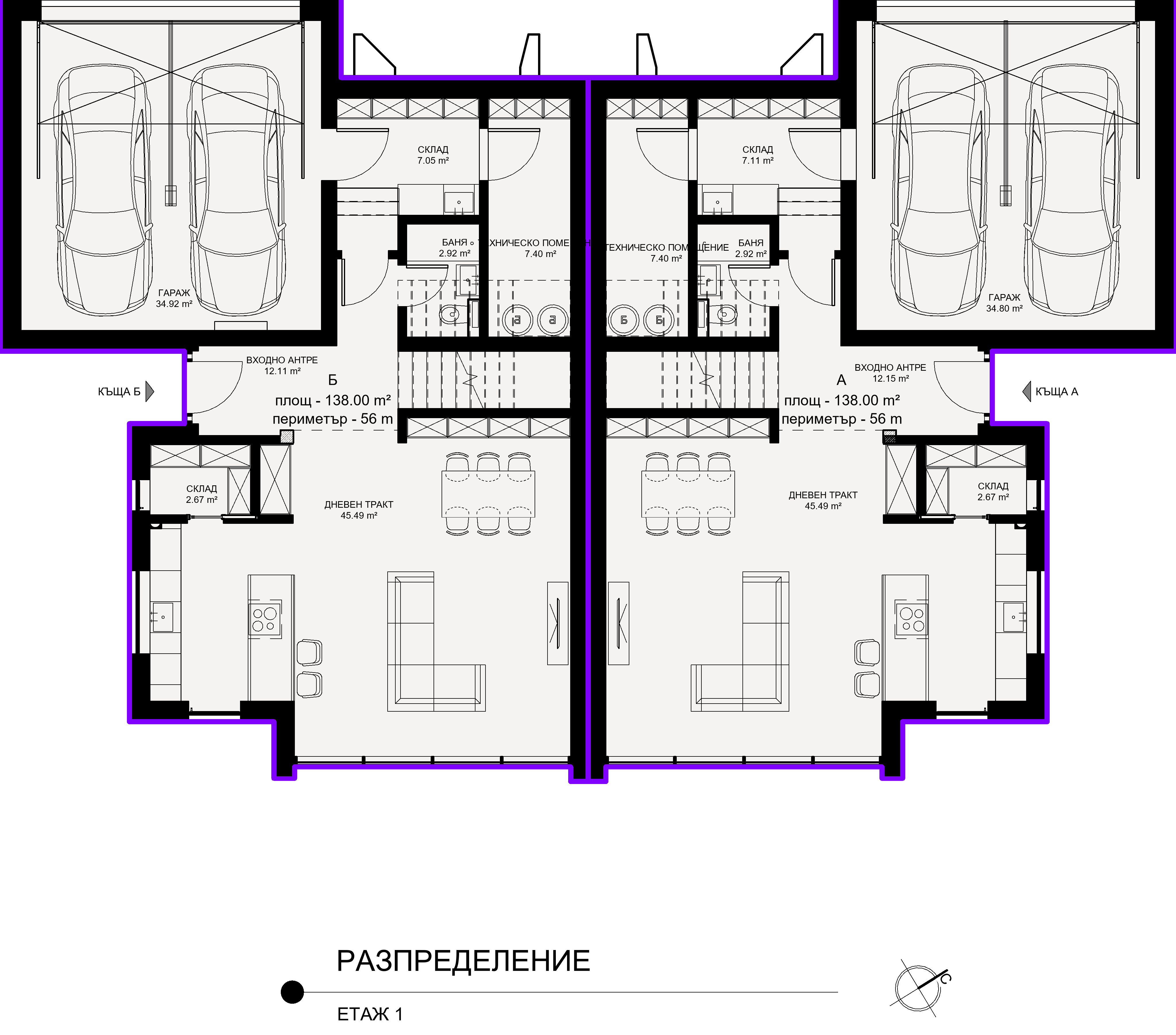 Der Komplex umfasst vier Mehrfamilienhäuser auf zwei oberirdischen Ebenen mit Flachdach. Jedes Gebäude ist in zwei Häuser mit separatem Eingang unterteilt. Der Eingang erfolgt über drei dem Gelände nachempfundene Stufen. Das Projekt sieht außerdem Garagen für zwei Autos vor, und die Wohnräume sind mit größter Liebe zum Detail gestaltet. Jedes Haus verfügt über ein separates Grundstück mit einer bebauten Fläche von 254 m² und Panoramablick auf das Sofia-Feld.