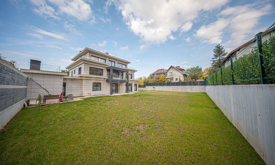 Das Haus verfügt über eine bebaute Fläche von 820 m², verteilt auf vier Ebenen (unterirdisch und drei oberirdisch), die durch ein internes Treppenhaus und einen hydraulischen Aufzug verbunden sind. Das Grundstück hat eine regelmäßige Form und eine Fläche von 1000 m², wovon ca. 650 m² als Grünfläche gestaltet sind – ein Rasengarten mit der von der Gemeinde vorgeschriebenen Anzahl an Bäumen und der Möglichkeit zur weiteren Bepflanzung nach Wunsch der zukünftigen Eigentümer.