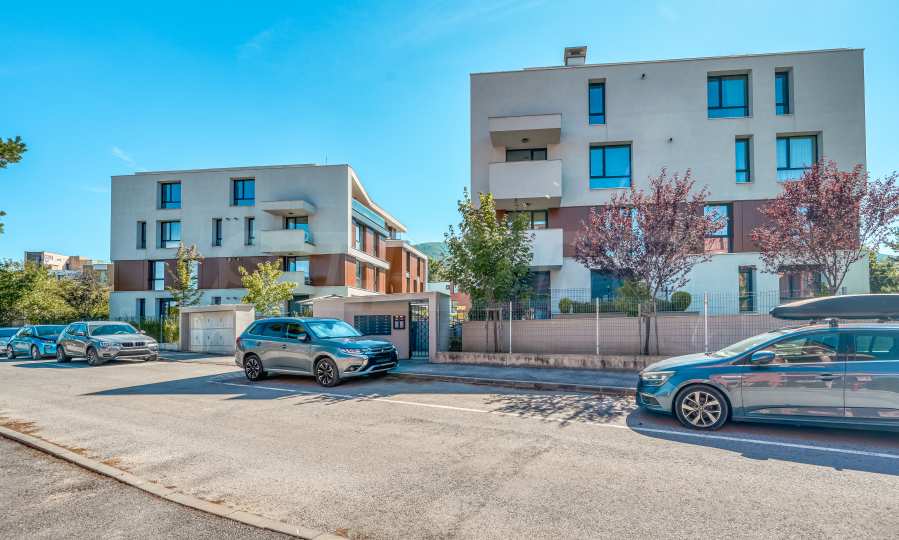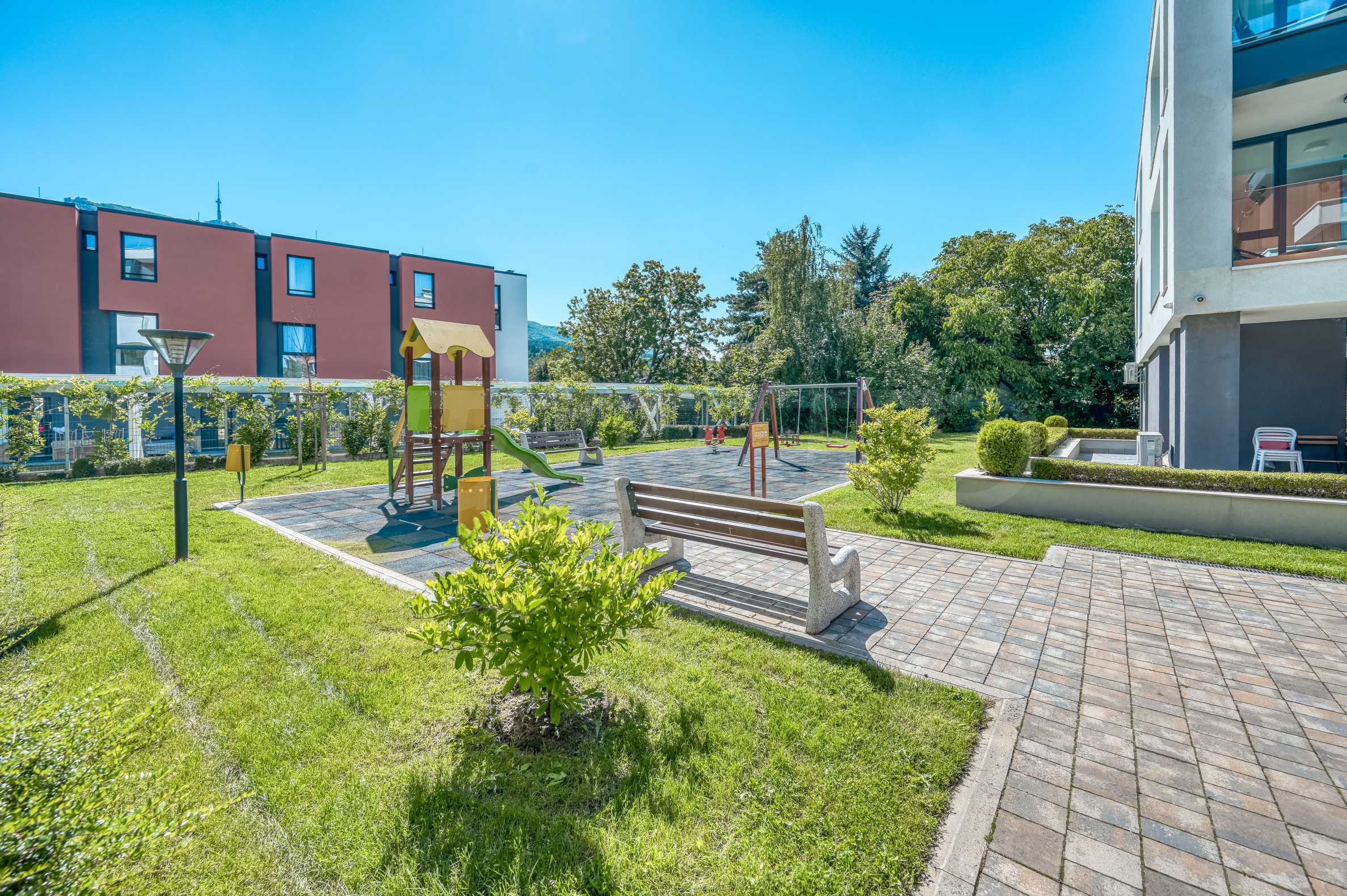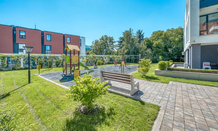 Die Anlage ist umzäunt und verfügt über kontrollierten Zugang sowie 24-Stunden-Videoüberwachung, was für Ruhe und Sicherheit sorgt. Den Bewohnern stehen wunderschön gestaltete Gemeinschaftsflächen, ein Innenhof, ein Spielplatz und Tiefgaragen zur Verfügung – ein ideales Umfeld für ein komfortables Familienleben.