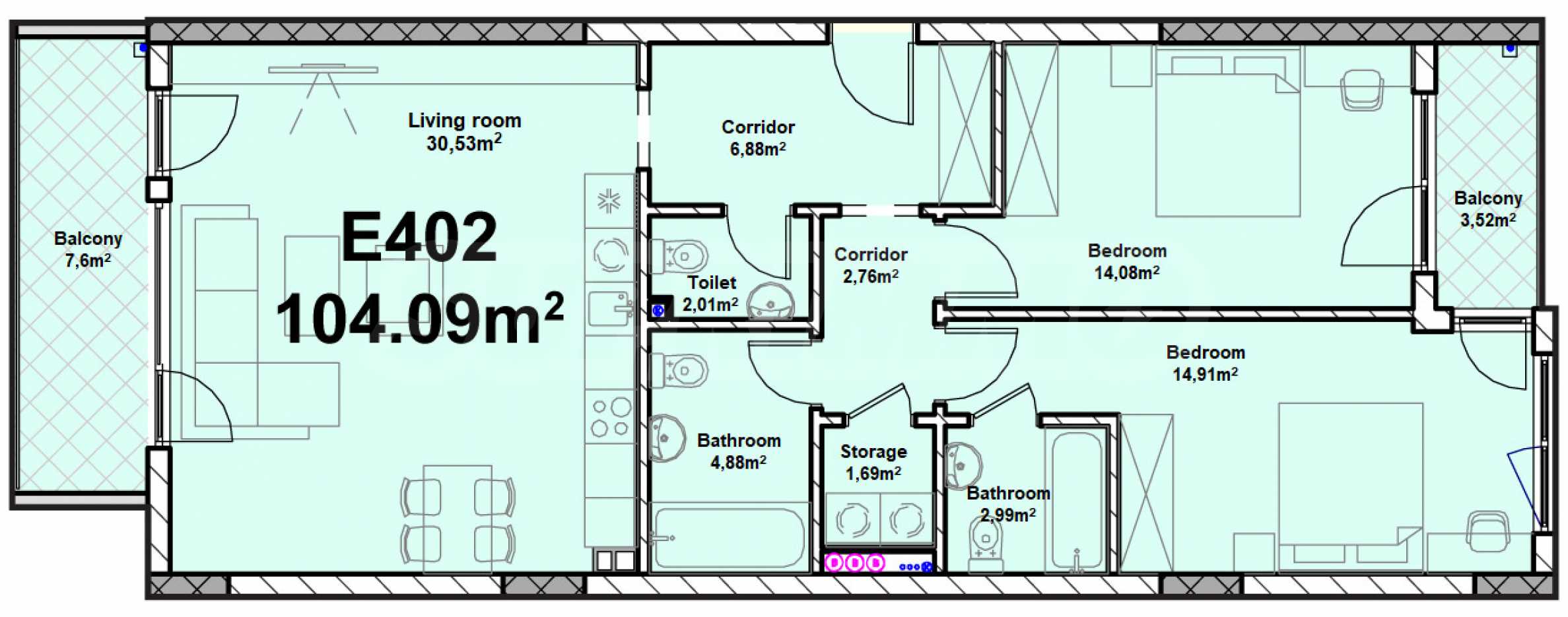 Das Gebäude besteht aus drei Eingängen mit 10 Stockwerken und zwei Untergeschossen. Die Gesamtzahl der Wohnungen beträgt 203 – Studios, Ein- und Zweizimmerwohnungen sowie zahlreiche Parkplätze für Autos und Motorräder.