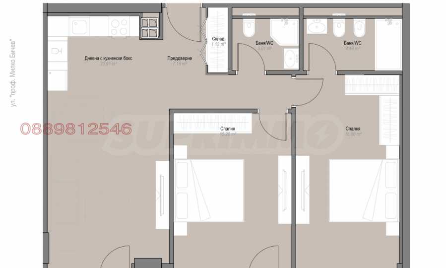 Die Wohnung befindet sich im fünften Obergeschoss und ist nach Süden ausgerichtet mit einem herrlichen Panoramablick auf das Witoscha-Gebirge. Sie besteht aus einem Wohnzimmer mit Essbereich und Kochnische, zwei separaten Schlafzimmern, zwei Badezimmern mit WC und einer geräumigen Terrasse. Die Wohnung verfügt über einen verputzten und mit Estrich versehenen Boden sowie eine hochwertige DAIKIN-Klimaanlage.