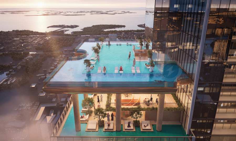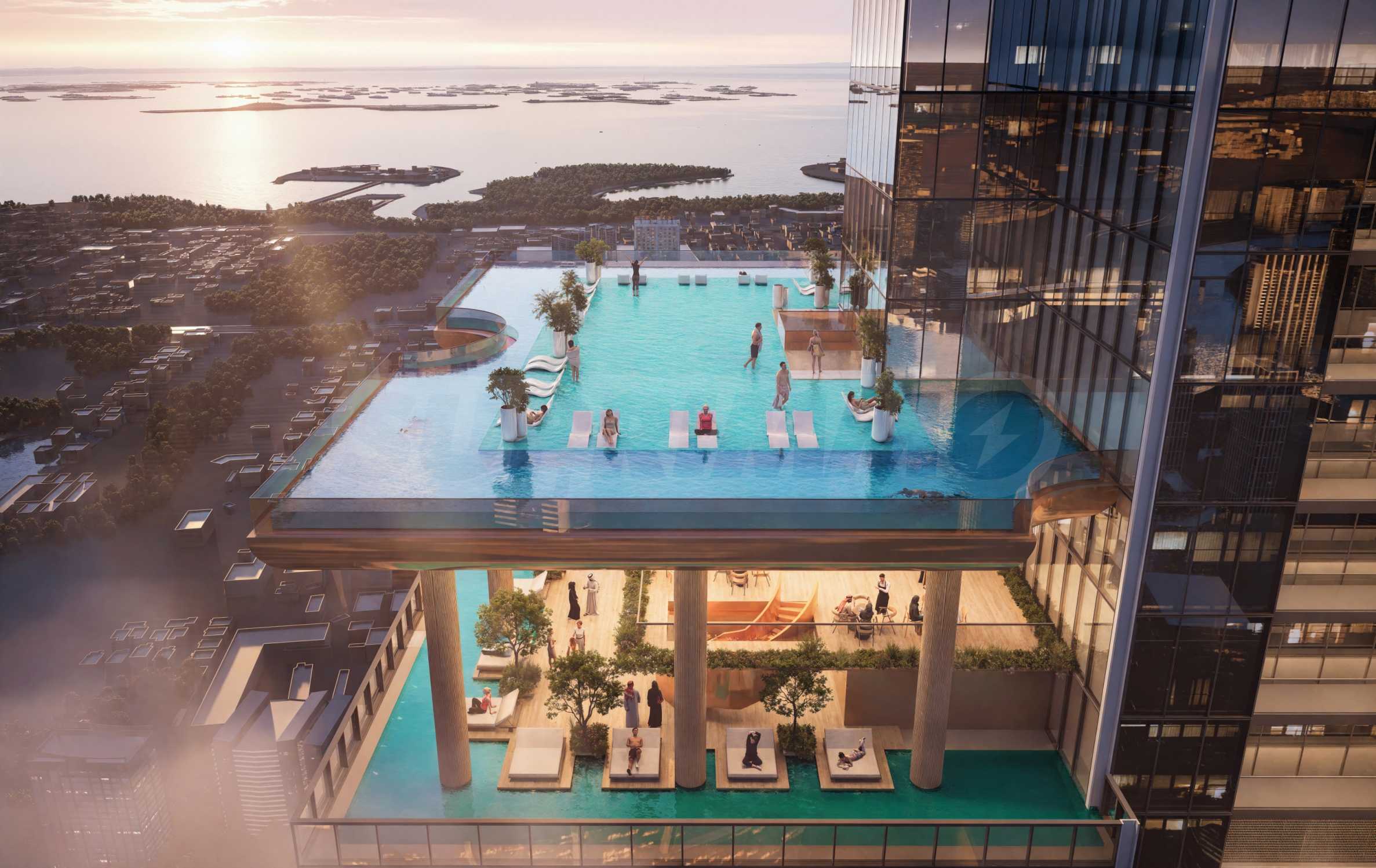 Das ultimative Erlebnis – mit Infinity-Pools, Sauna, Whirlpool und abgeschiedenen Lounge-Bereichen, die einen Panoramablick über die gesamte Stadt bieten.
