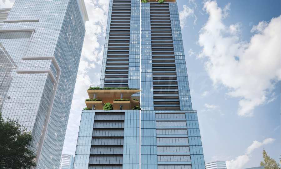 Die Fassade aus Glas und Metall ist mit äußerster Präzision gestaltet – raumhohe Fenster fangen das Licht der Stadt ein und reflektieren es, wodurch das Gebäude ein luftiges, strahlendes Aussehen erhält.