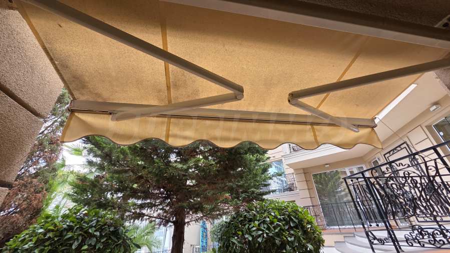 Auch die kleine Terrasse am Schlafzimmer ist mit einer Markise ausgestattet. Eine Zierzaun-Einfassung aus Schmiedeeisen und ein Gartentor ermöglichen den direkten Zugang zum Pool- und Gartenbereich.