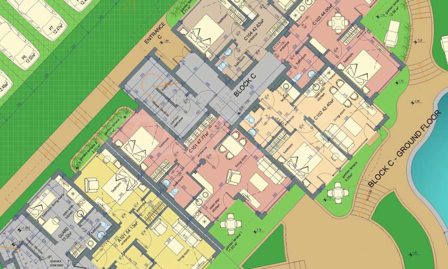 Die Wohnung befindet sich im Erdgeschoss und verfügt über eine große Gartenterrasse mit Blick auf den Pool und den begrünten Innenhof der Anlage sowie über eine zweite, kleinere Terrasse am Schlafzimmer.