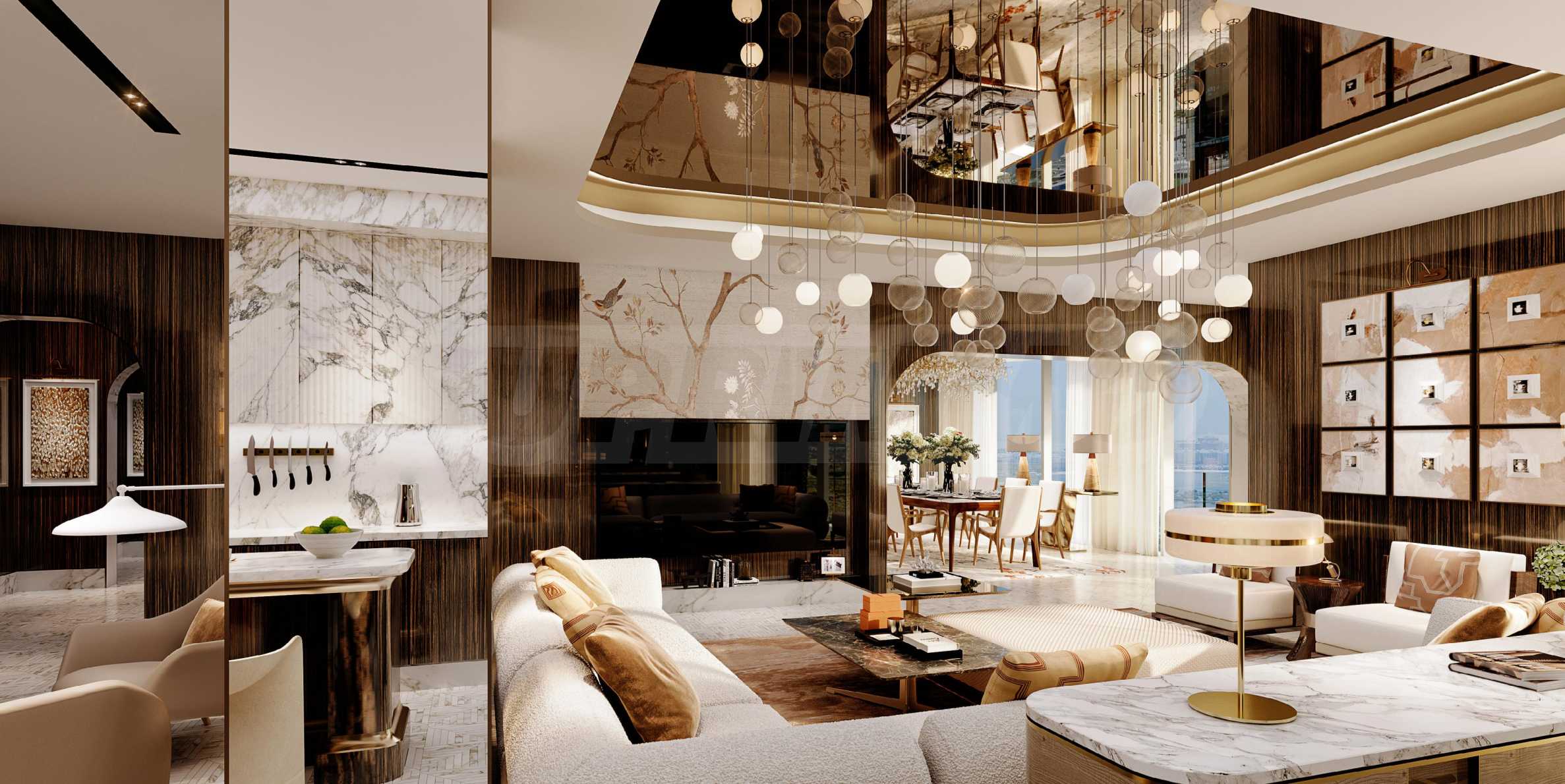 Die Küche ist komplett möbliert und mit stilvollen Schränken und hochwertigen Geräten ausgestattet – ideal, um schnell einen Snack zuzubereiten oder kulinarische Meisterwerke zu kreieren. Auch die Badezimmer sind komplett ausgestattet; Marmor und Goldelemente verleihen den Räumen ein elegantes und zeitloses Ambiente.