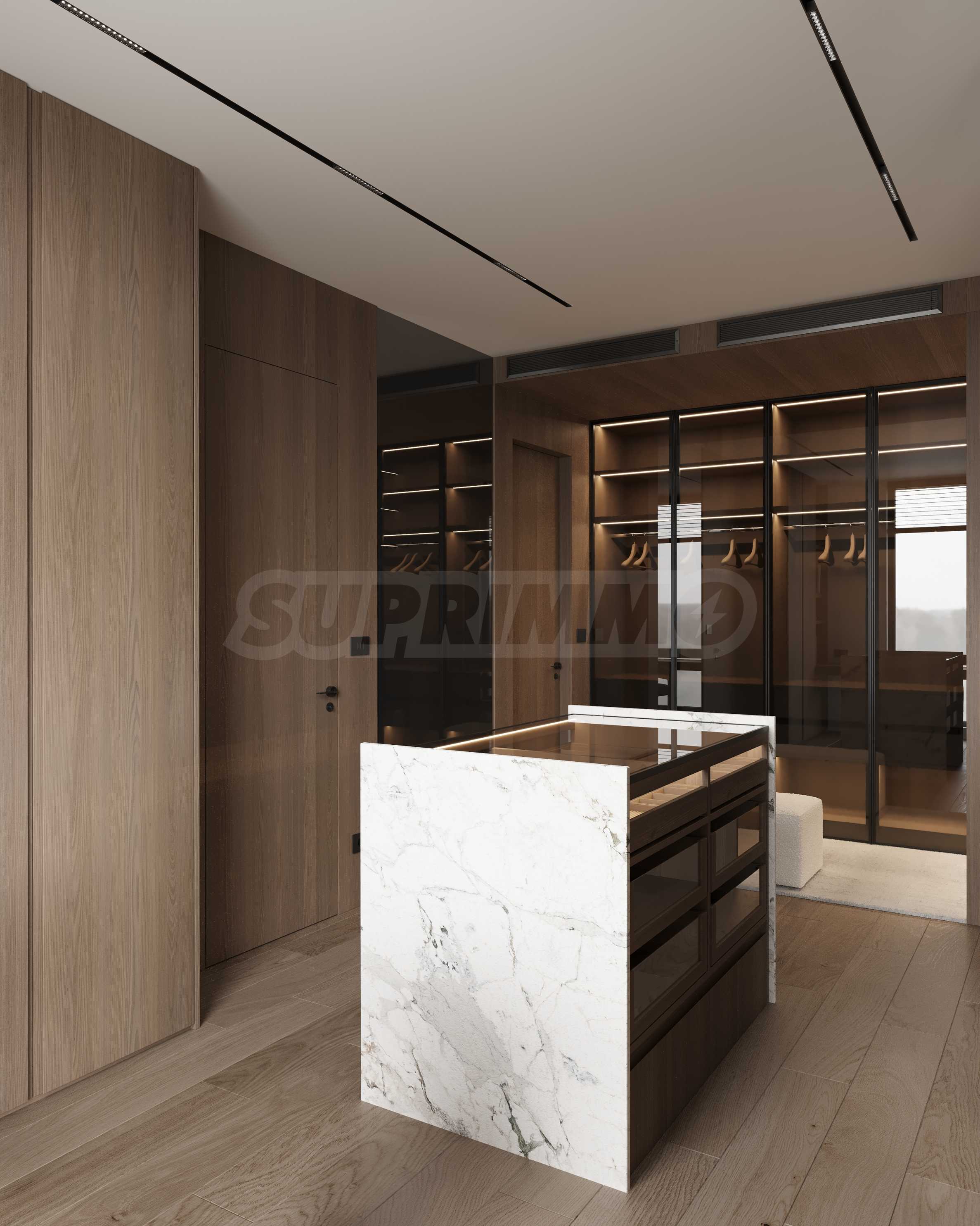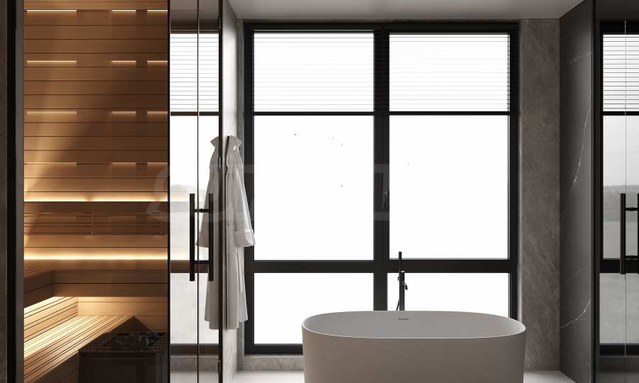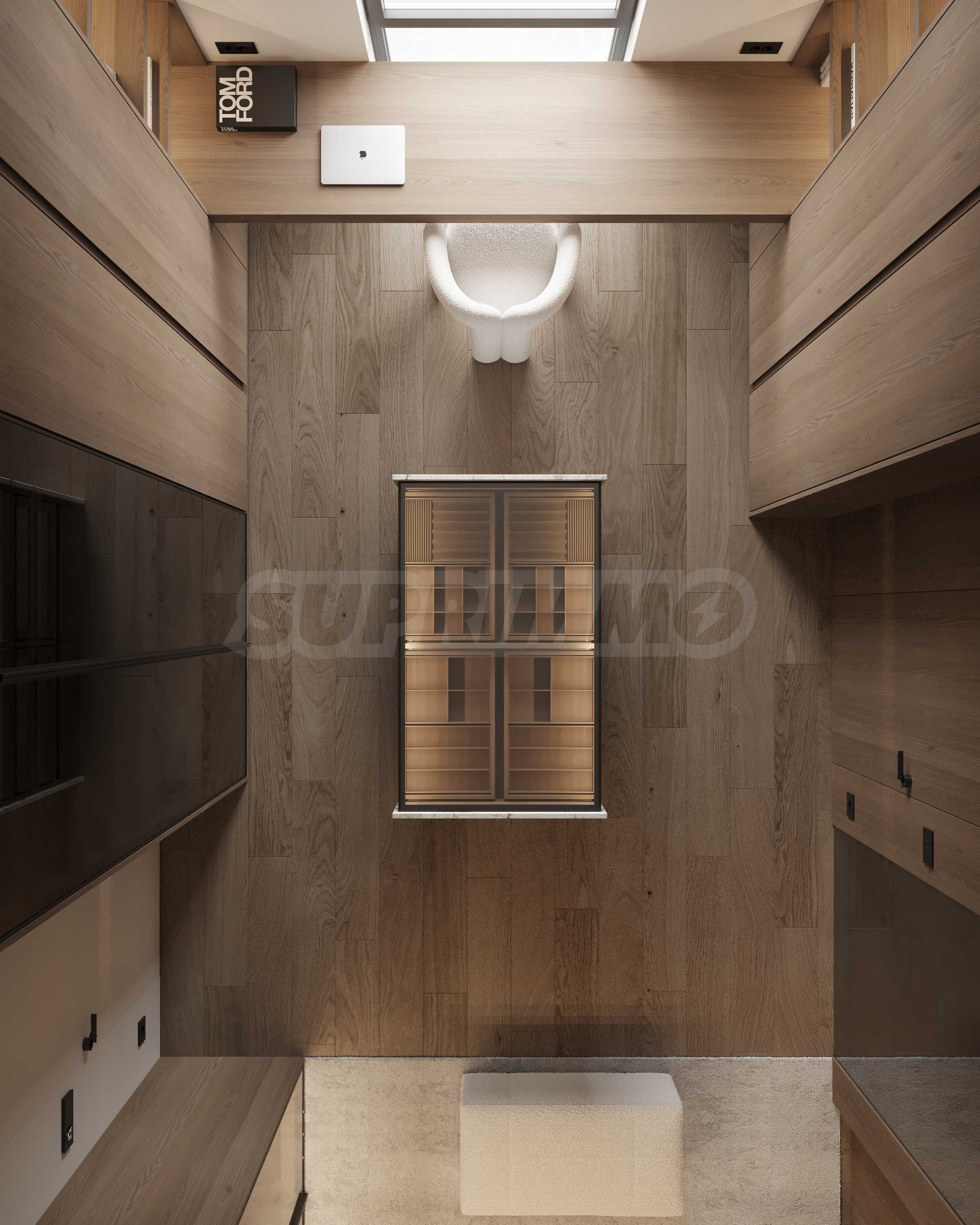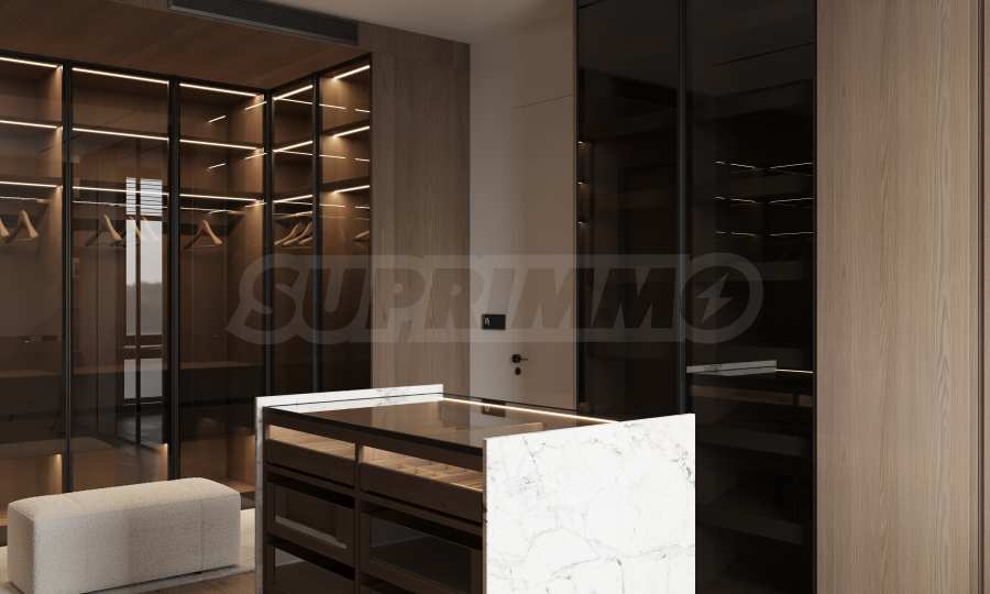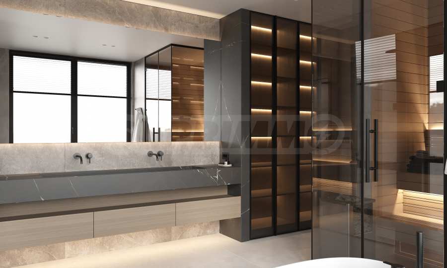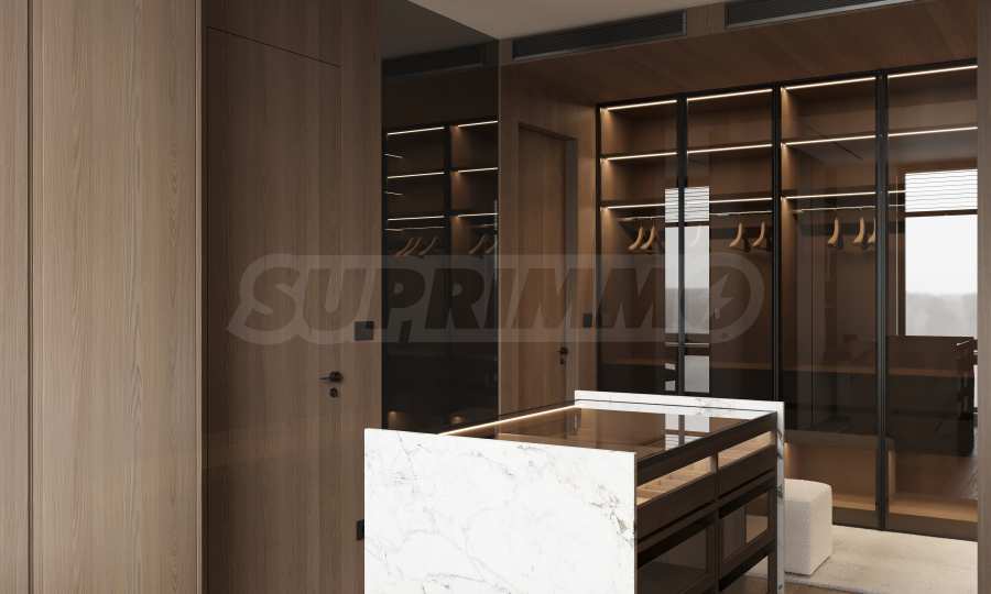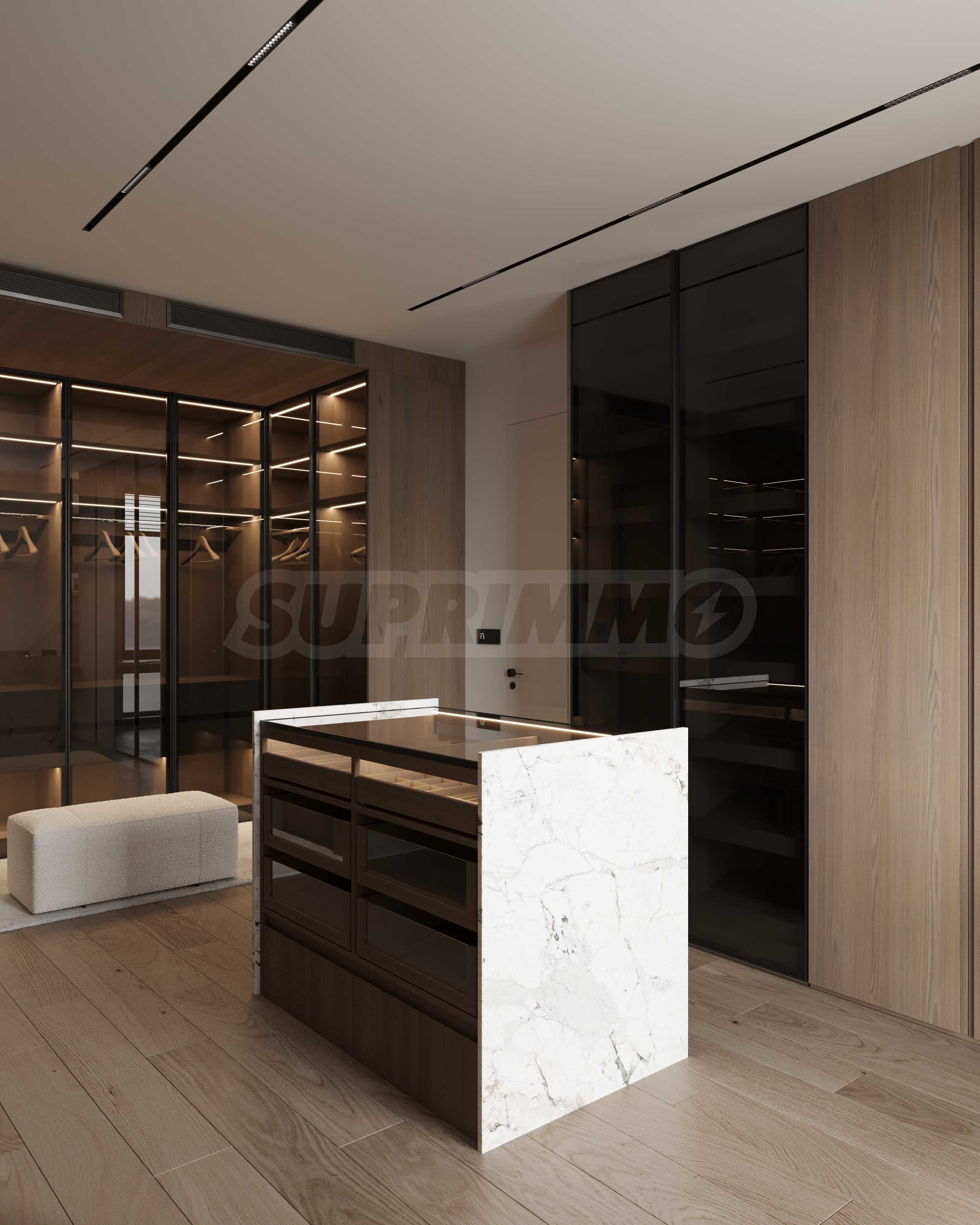 • Ebene 2: Hauptschlafzimmer (28,47 m²) mit großem Kleiderschrank (18,48 m²) und Badezimmer mit WC (15,91 m²) und Sauna, ein zweites Schlafzimmer mit Kleiderschrank und Badezimmer mit WC, ein drittes Schlafzimmer mit Badezimmer mit WC und eine Waschküche.